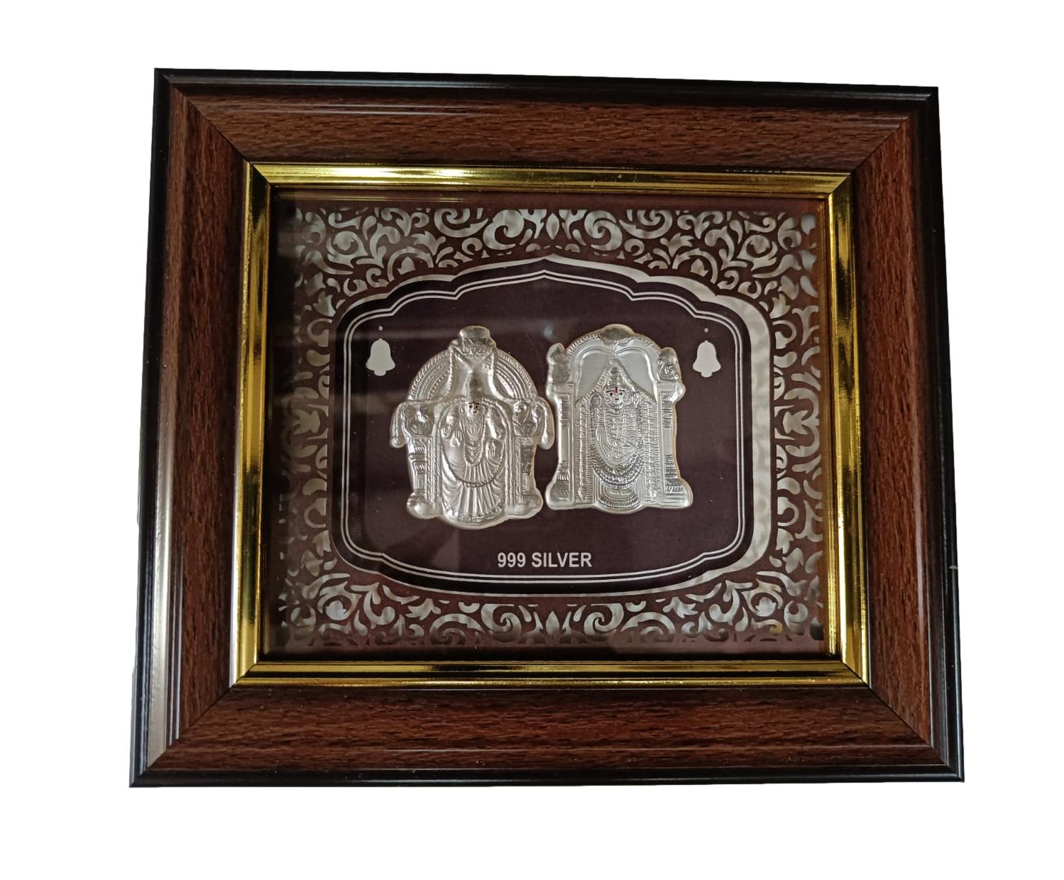 This divine photo frame features Lord Perumal (Vishnu) and Goddess Thayar (Lakshmi), beautifully embossed in 999 pure silver, symbolizing eternal protection and prosperity. The intricate silver artwork is encased in a richly finished wooden frame, combining traditional aesthetics with spiritual grace.
