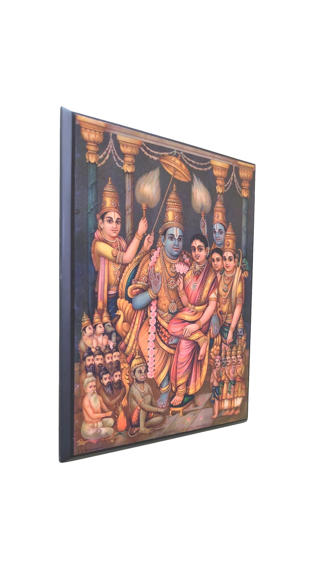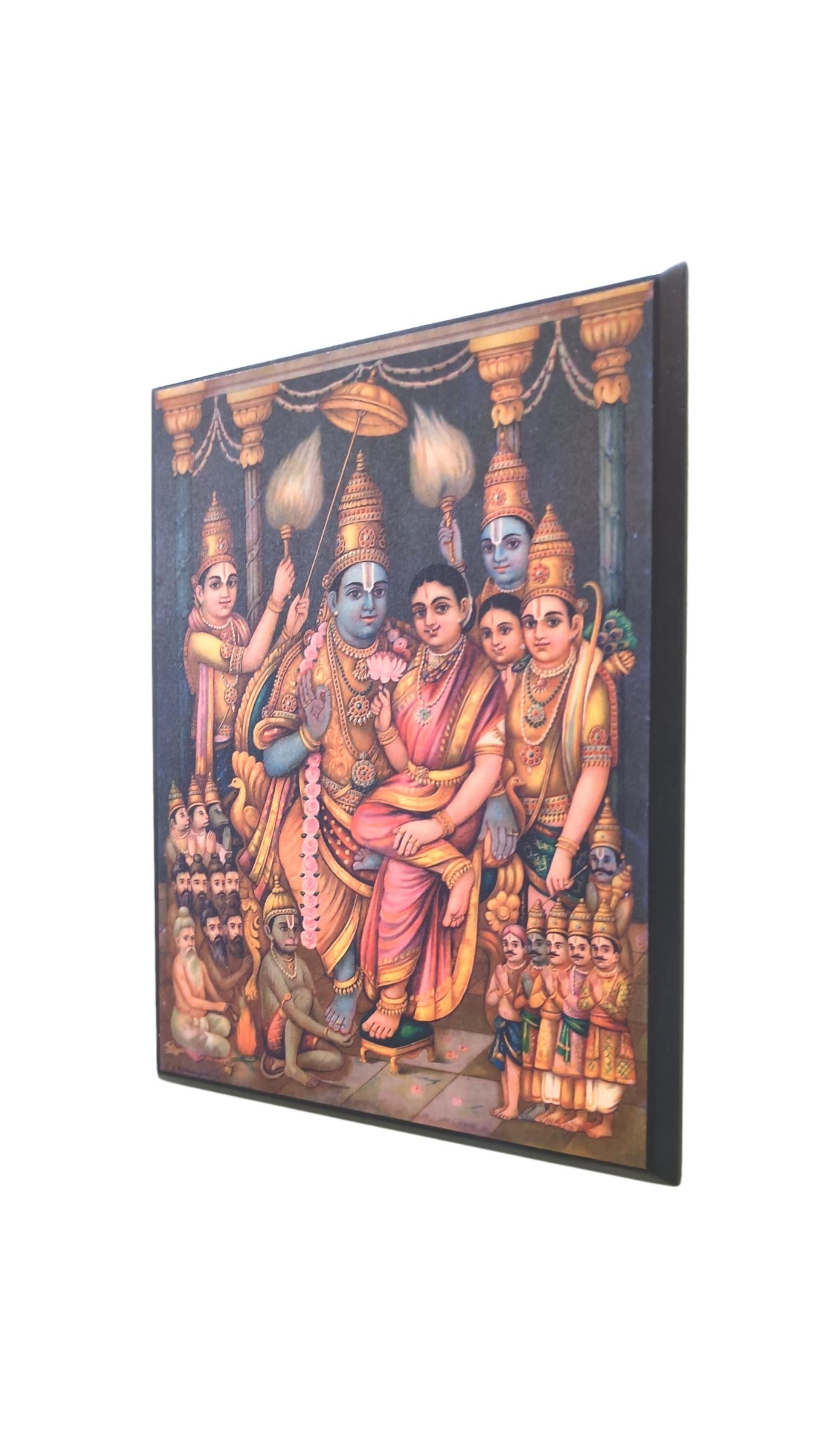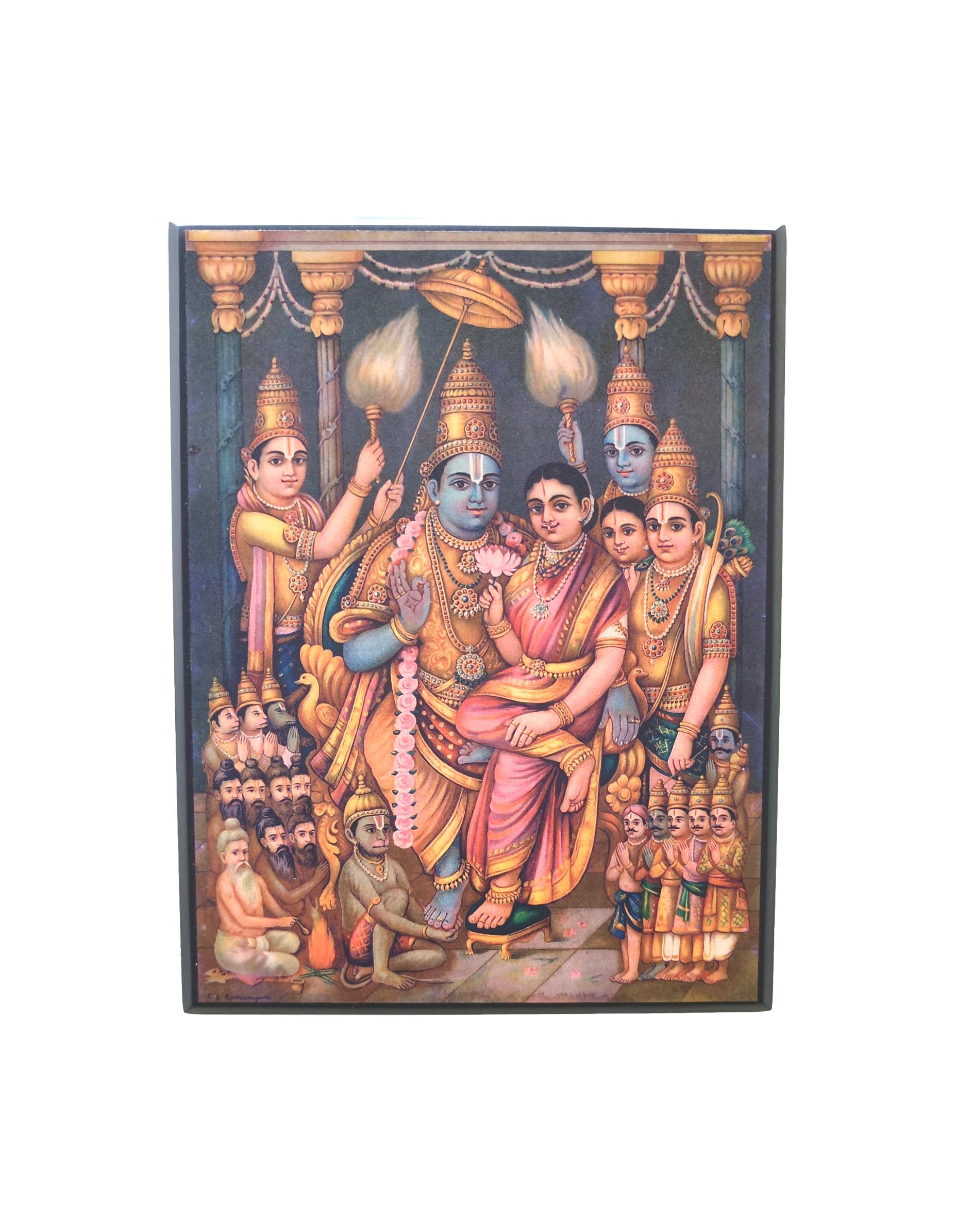 Experience the timeless allure of the Antique Ramar Pattabhishekam Table Stand, a masterpiece that blends artistry and heritage seamlessly. Crafted with intricate details and an antique finish, this table stand showcases the divine scene of Lord Rama's coronation, symbolizing righteousness and valor. The sturdy construction ensures durability, while the elegant design adds a touch of regal charm to any space. Ideal for adorning your home altar or as a thoughtful gift, the Antique Ramar Pattabhishekam Table Stand brings a sense of reverence and spirituality, honoring the legendary tale of Ramayana and inspiring a deeper connection to tradition and faith.