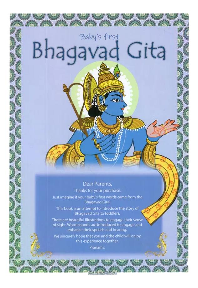- "Baby’s First Bhagavad Gita" is an enchanting English children's book that introduces young minds to the timeless wisdom of the Bhagavad Gita. Through engaging storytelling and colorful illustrations, it simplifies the profound teachings of Lord Krishna to help children understand concepts like duty, righteousness, and selflessness. This book uses relatable scenarios and easy-to-understand language to convey the Gita's universal messages of courage, compassion, and spiritual growth. "Baby’s First Bhagavad Gita" is a valuable resource for parents and educators seeking to instill moral values, resilience, and a sense of purpose in children, fostering their holistic development from an early age.