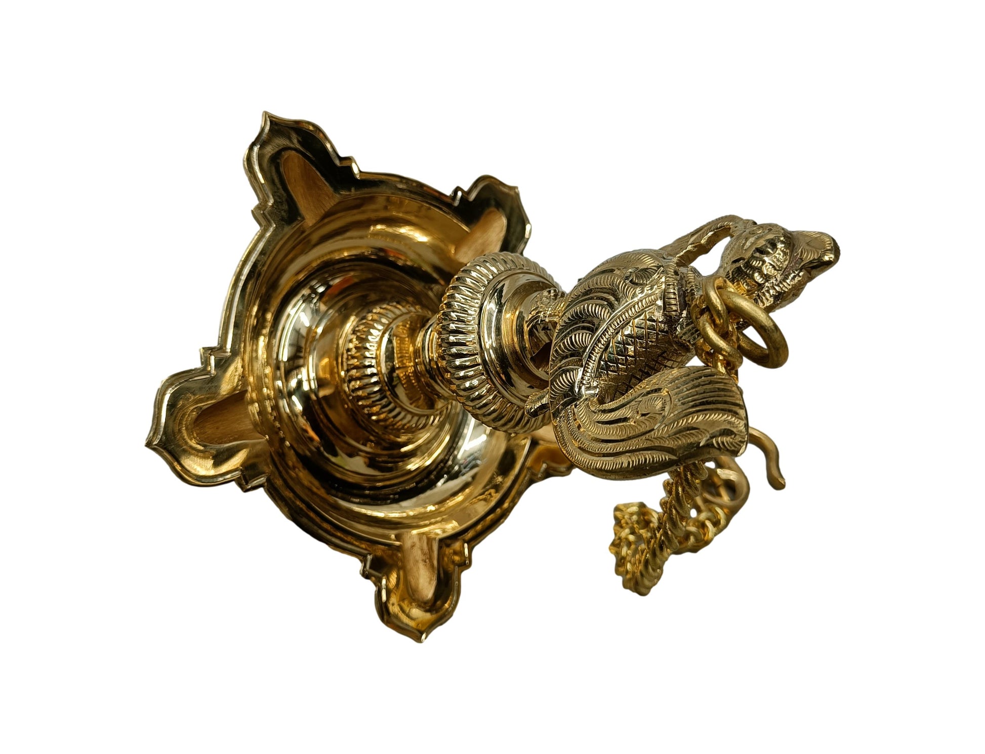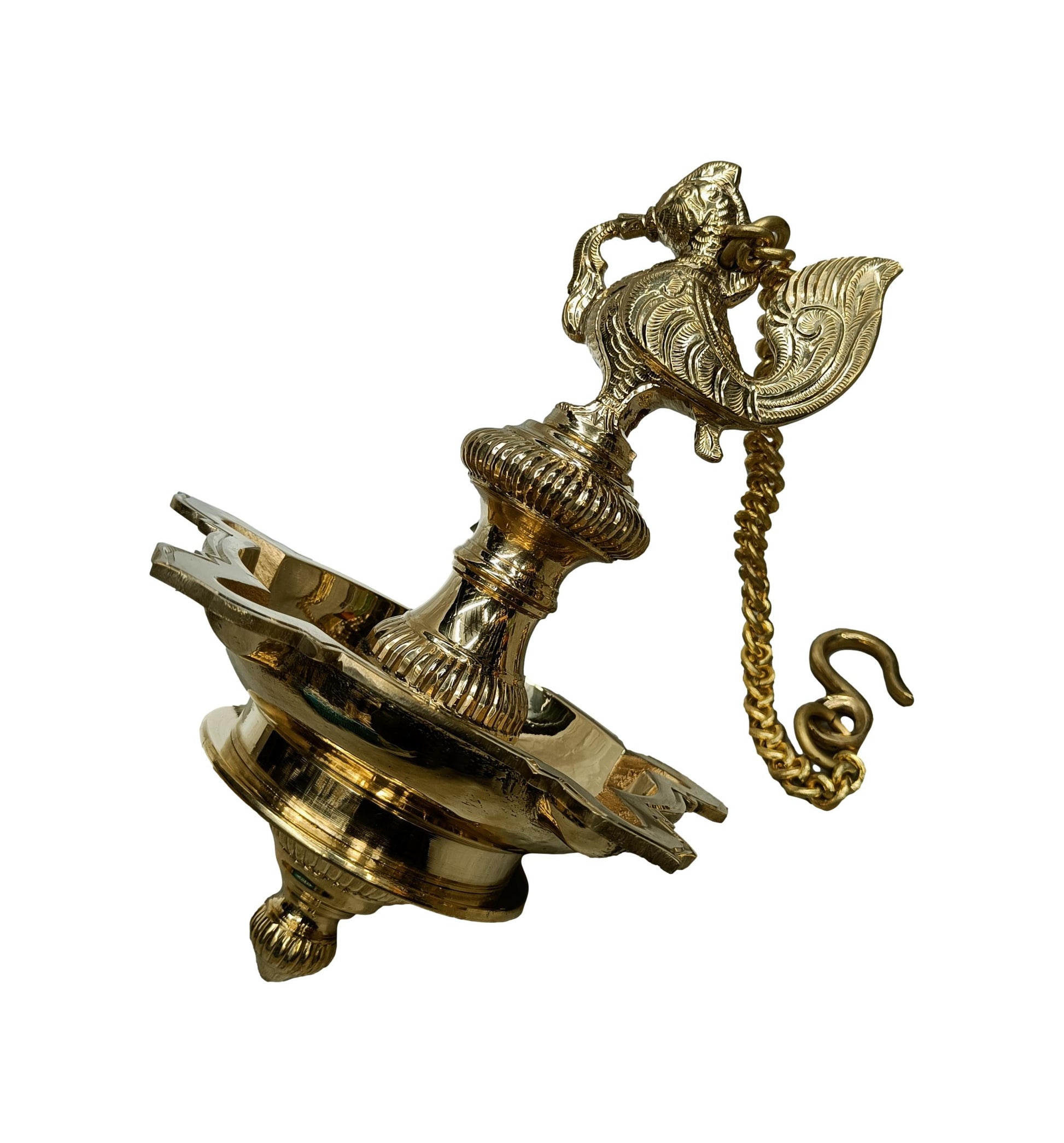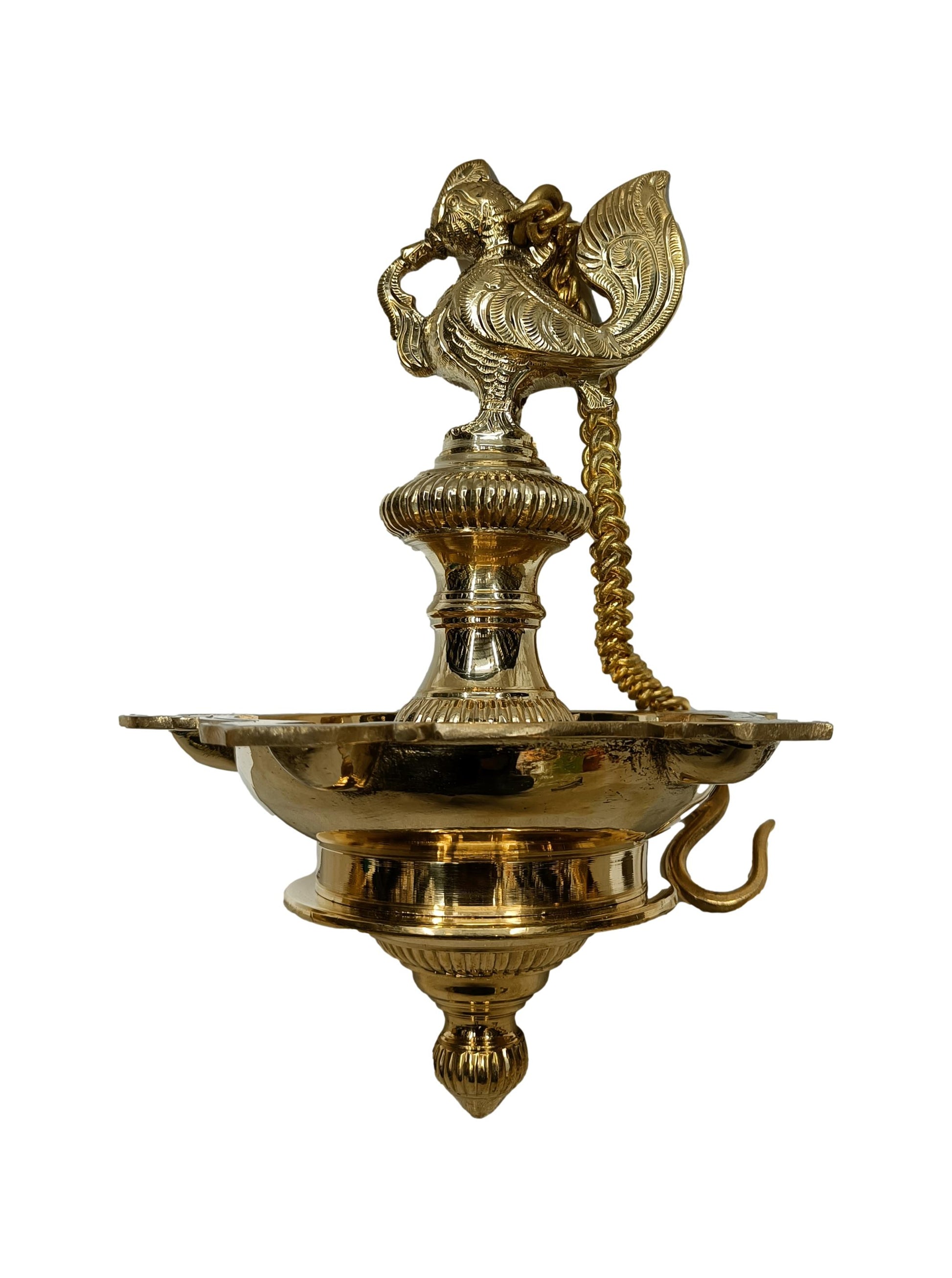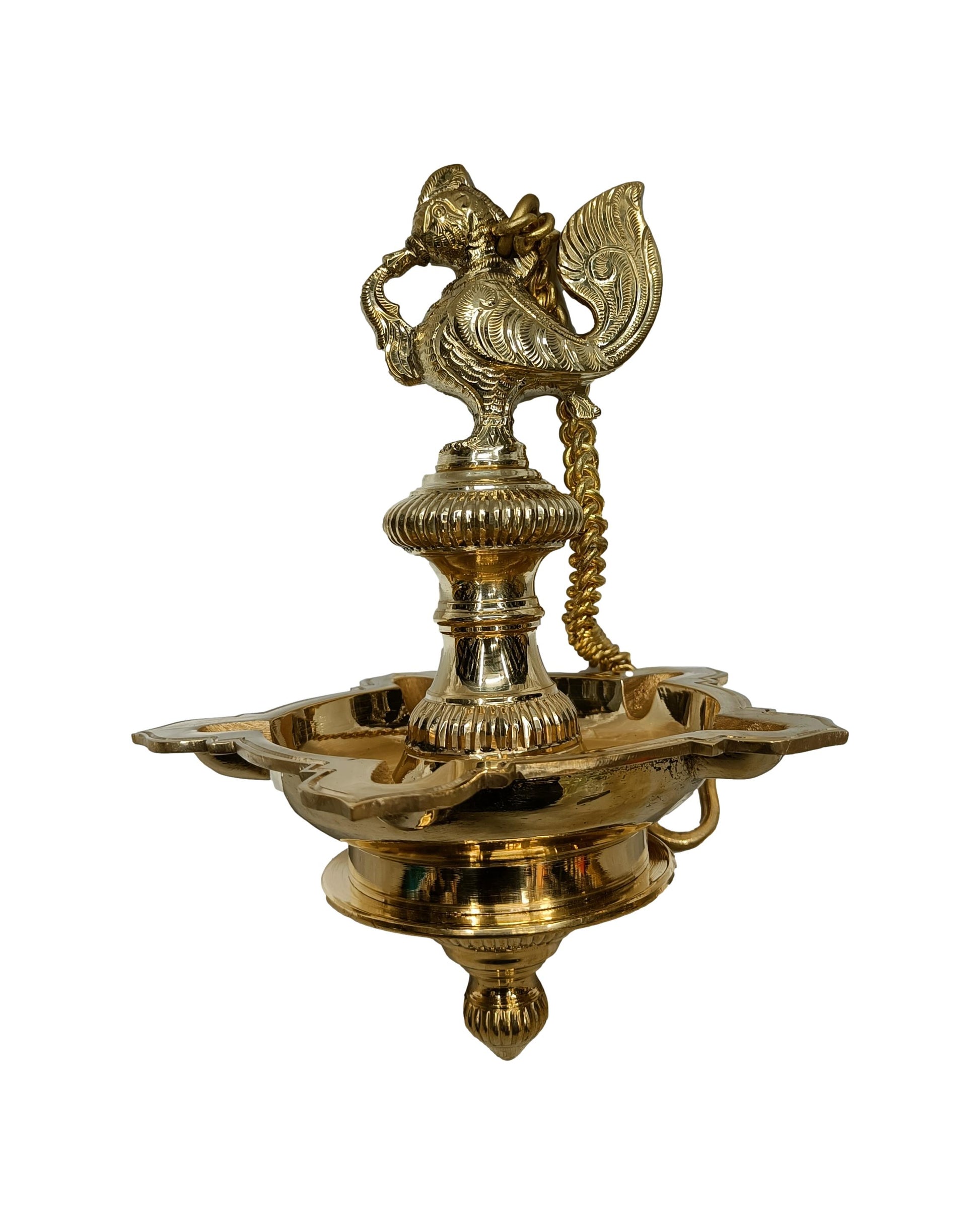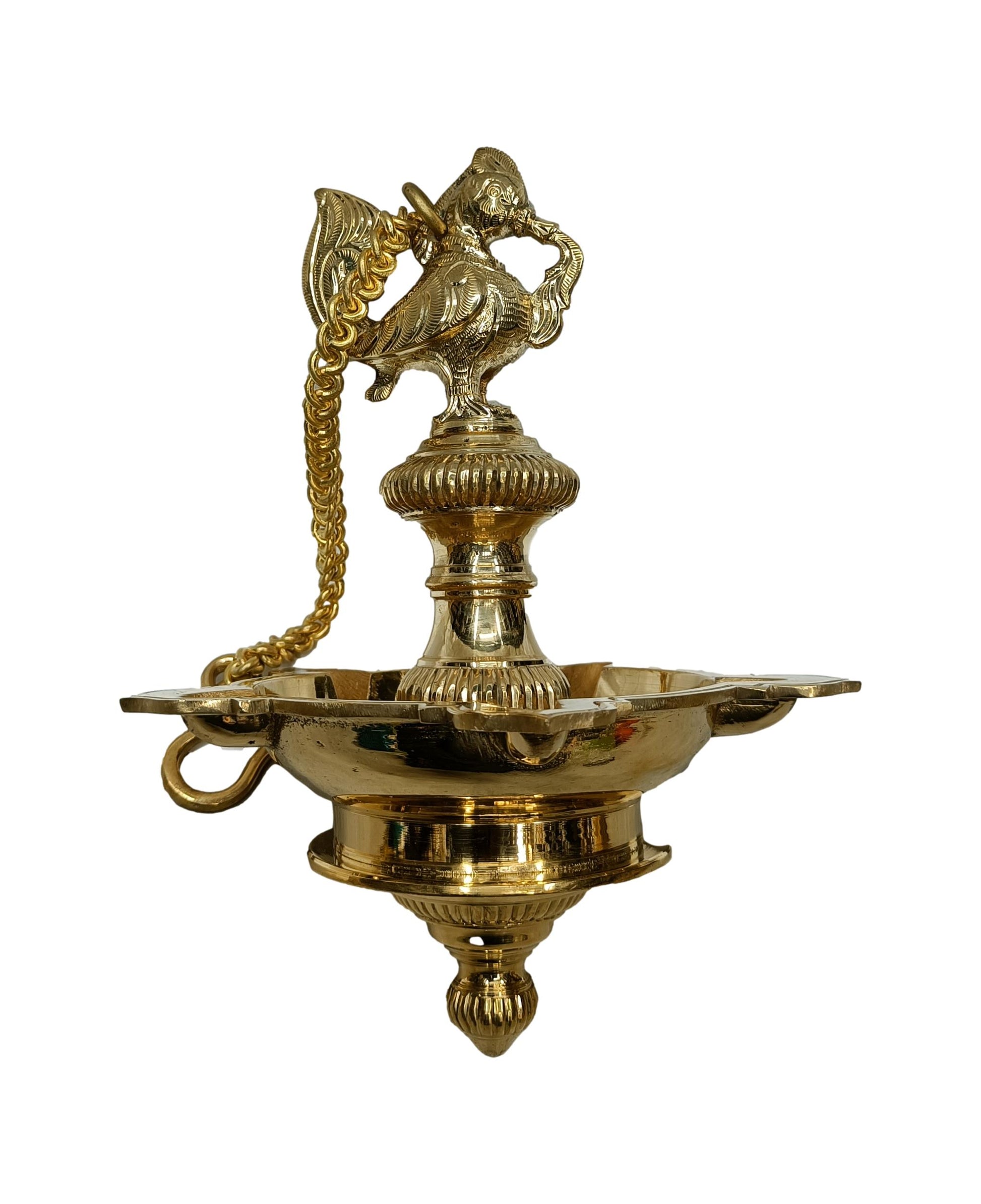 Elevate the ambiance of your home or sacred space with this exquisite Brass Annam Hanging Oil Lamp. Featuring intricate craftsmanship, the lamp is adorned with an elegant Annam bird motif, symbolizing purity and peace. Designed to hold oil and a cotton wick, it radiates a warm, serene glow when lit, creating a tranquil atmosphere. The sturdy hanging chain ensures easy suspension, making it ideal for temples, prayer rooms, or as a decorative piece. Crafted from high-quality brass, it boasts durability and an antique finish that adds timeless charm. A perfect blend of tradition and artistry, it enhances spiritual practices and home décor alike.