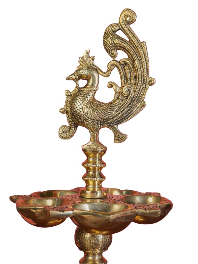 The Brass Annapakshi 5 Face Diya with Tri-Stand is an exquisite piece of craftsmanship, blending traditional design with elegant functionality. Featuring the majestic Annapakshi bird, a symbol of prosperity, this diya showcases five faces, each representing divine blessings. The tri-stand provides stability and a touch of grandeur, making it a perfect centerpiece for your puja room or living space. Handcrafted from high-quality brass, it ensures durability and a timeless antique finish. Ideal for festive occasions and daily rituals, this diya illuminates your home with spiritual warmth and cultural heritage.