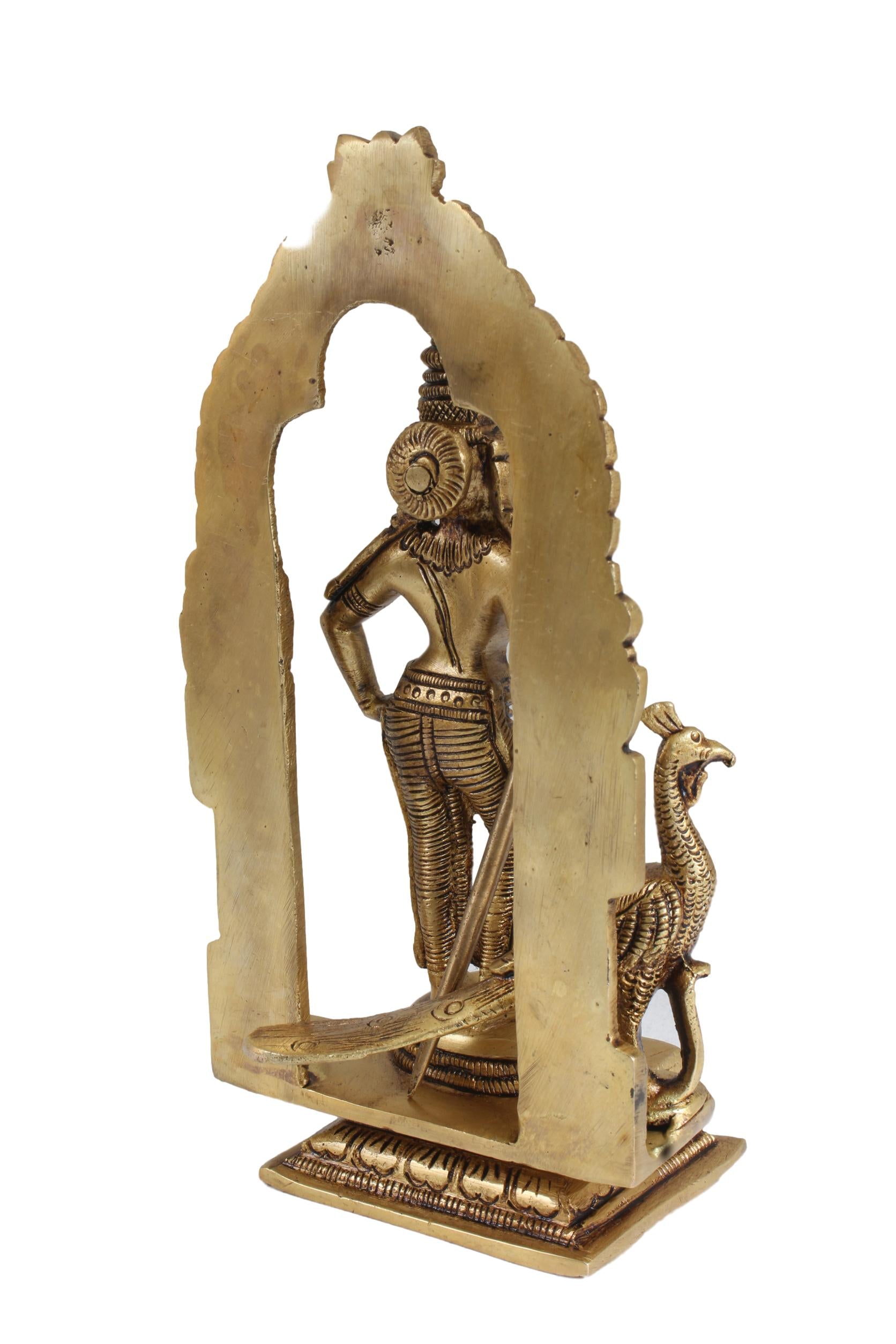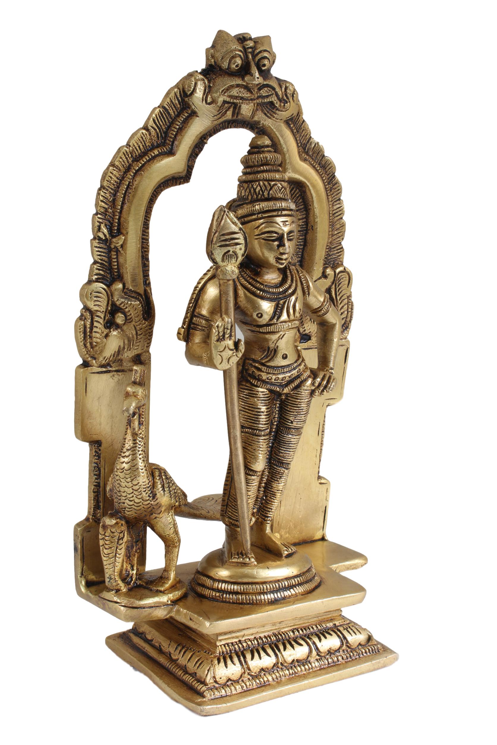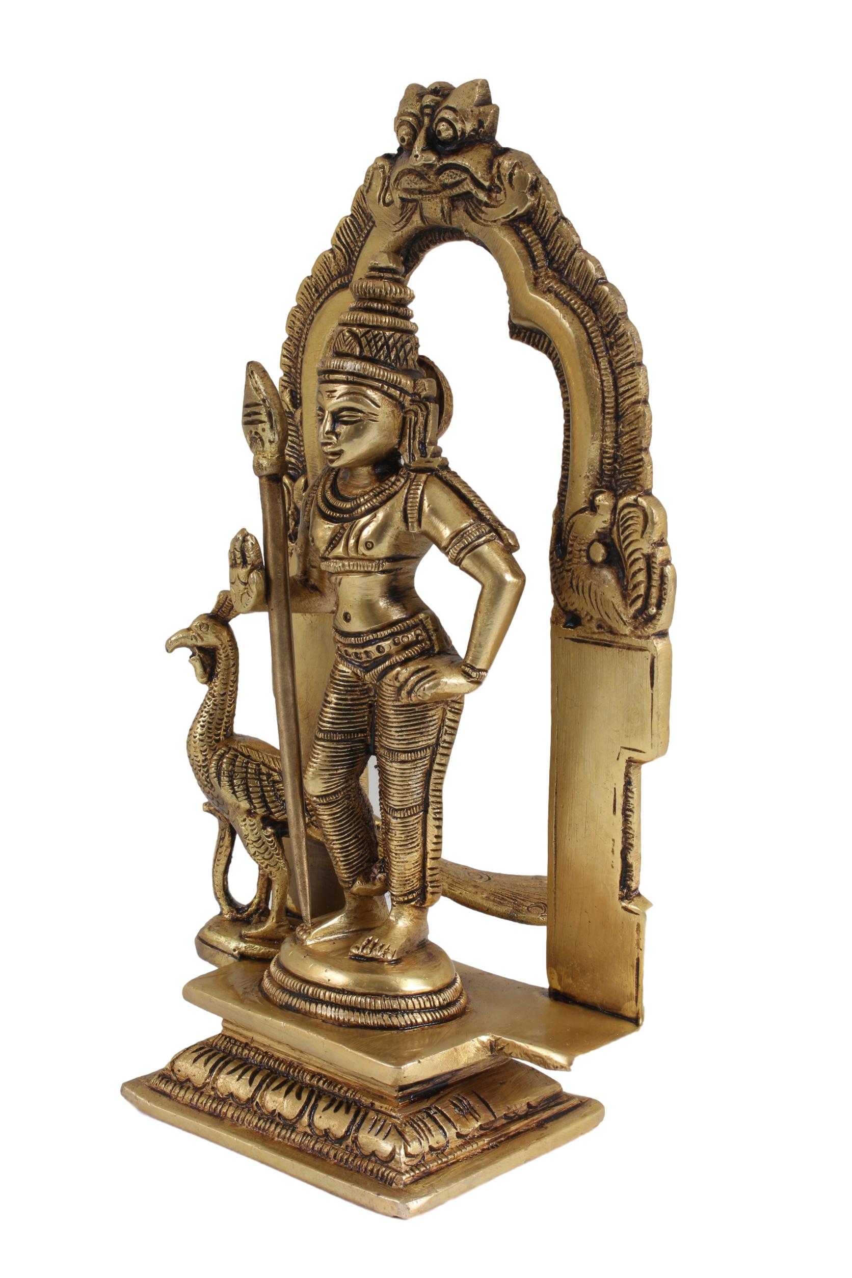 The Brass Antique Mayil Murugan idol in Tiruvachi is a stunning piece of artistry and spirituality. Crafted with meticulous detail, this idol depicts Lord Murugan, the divine warrior, riding a peacock, symbolizing grace and valor. The antique brass finish adds a touch of elegance and timelessness to this exquisite piece. The intricate carvings and fine craftsmanship make it a perfect addition to your home or sacred space, enhancing the ambiance with its divine presence. Whether as a decorative item or for worship, this Mayil Murugan idol exudes a sense of devotion and reverence, bringing blessings and positivity to your surroundings.