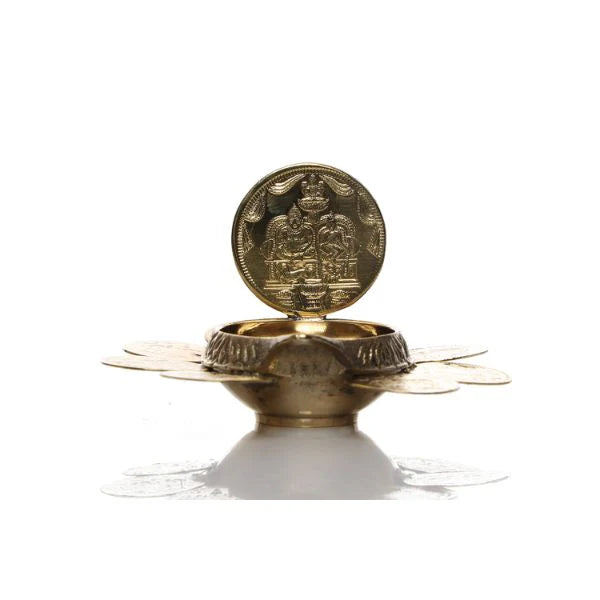 The Brass Coin Lakshmi Kubera Vilakku exudes traditional charm and spiritual significance. Crafted intricately with brass, it features a central design of Goddess Lakshmi and Lord Kubera, symbolizing wealth, prosperity, and blessings. The addition of coins around the vilakku enhances its aesthetic appeal, reflecting prosperity and abundance. This exquisite piece is not just a lamp but also a symbol of divine grace and auspiciousness, perfect for religious ceremonies, festivals, or as a decorative accent in homes. The brass construction ensures durability, while the intricate detailing adds a touch of elegance, making it a cherished addition to any sacred space.