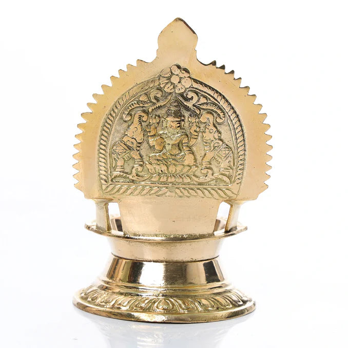 The Brass Gajalakshmi Vilakku exudes traditional charm and spiritual significance. Crafted intricately with antique brass, it features Goddess Lakshmi in a graceful pose, symbolizing wealth and prosperity. The vilakku's five faces represent the five elements, enhancing its sacred appeal. Perfect for poojas and home decor, it stands elegantly on a sturdy base, radiating divine blessings. Illuminate your space with this timeless piece, embodying cultural richness and spiritual devotion.