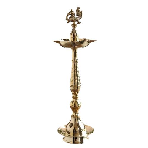 Enhance your sacred spaces with our Brass Kuthu Vilaku With Peacock. This exquisite oil lamp, crafted from premium brass, features a stunning peacock design symbolizing beauty and grace. The intricate detailing and sturdy base make it a captivating centerpiece for prayer rooms and festive occasions. With its five-wick design, it radiates prosperity and dispels darkness, creating a warm and spiritual ambiance. Easy to clean and maintain, this lamp is perfect for gifting or personal devotion, adding elegance to any space.