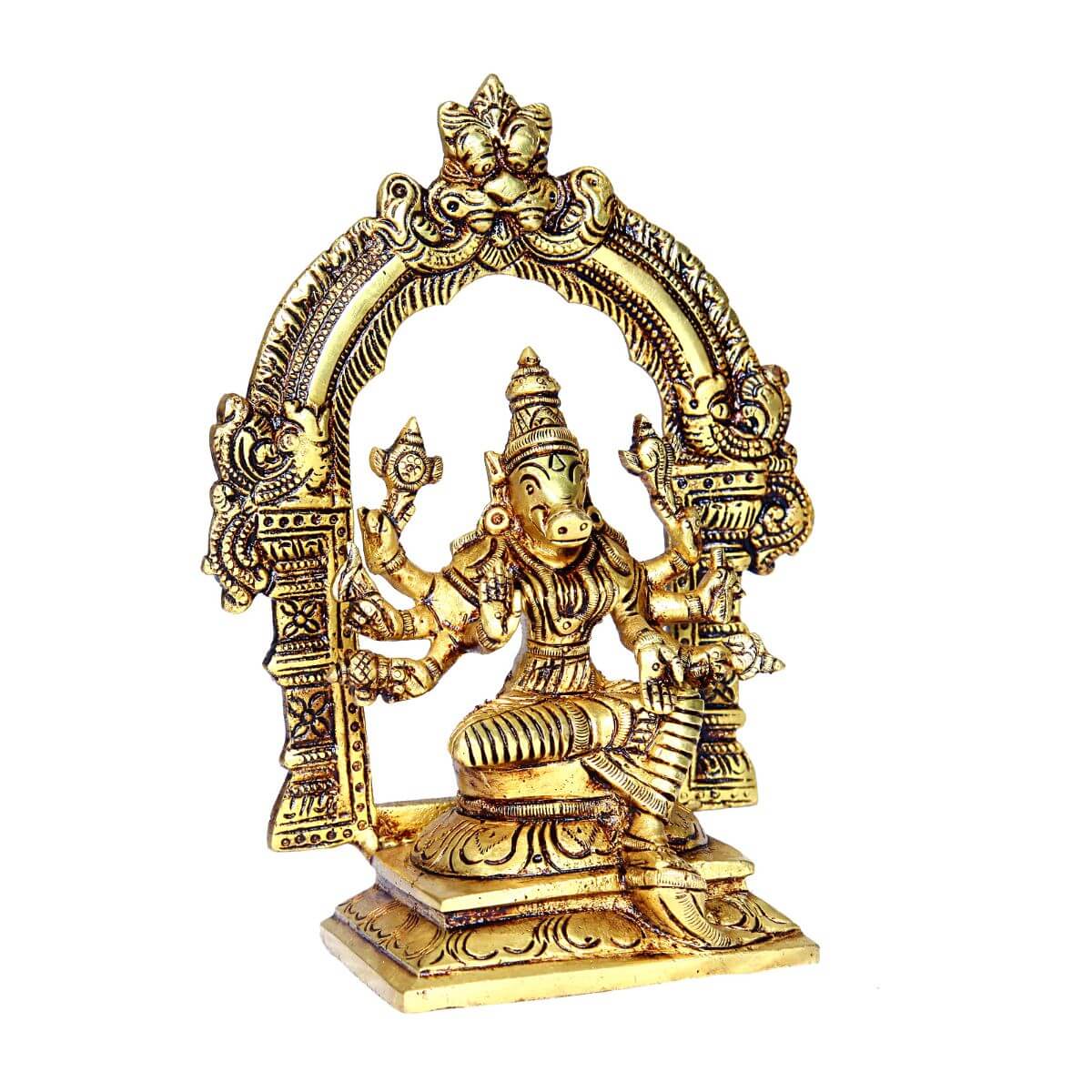 Handcrafted with meticulous detail, this Brass Sri Varahi Amman idol with Tiruvachi emanates divine grace and cultural richness. Cast in solid brass, the idol captures the essence of Sri Varahi Amman, a revered deity in Hindu mythology symbolizing protection and strength. The intricate engravings and traditional motifs reflect the skilled artistry of Indian craftsmanship. Adorned with a Tiruvachi, a sacred stand representing auspiciousness and devotion, this idol is ideal for home or temple decor, invoking blessings and positive energies. Its radiant golden hue and serene expression make it a captivating centerpiece for spiritual practices and a cherished addition to any sacred space.
