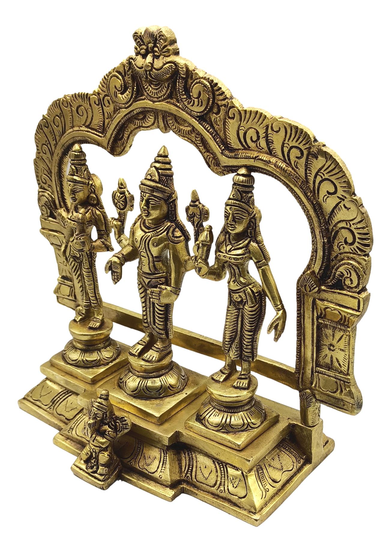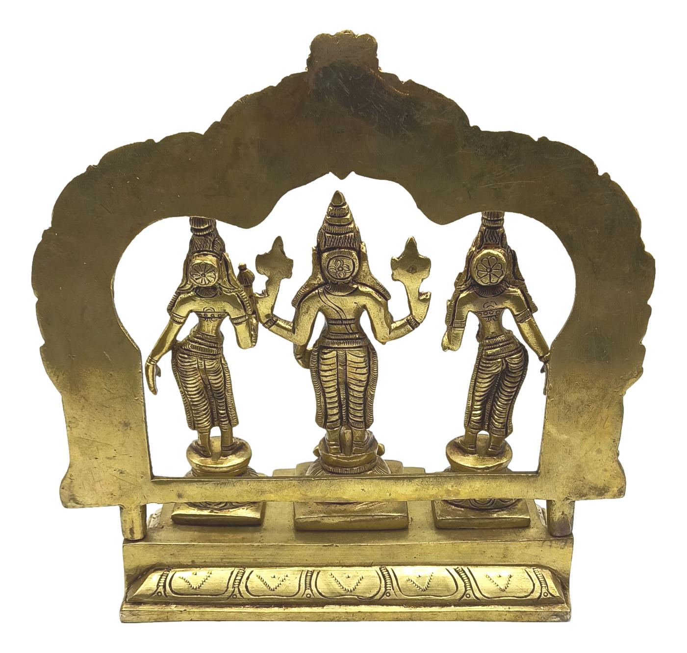 - Crafted with exquisite artistry, the Brass Srinivasa Perumal Set idol exudes divine grace and elegance. Standing majestically, Lord Srinivasa Perumal is depicted with intricate detailing, capturing the essence of his divine presence. The idol is made of high-quality brass, ensuring durability and a timeless appeal. Adorned with traditional motifs and embellishments, it reflects the rich cultural heritage of Indian craftsmanship. This set includes the main deity along with smaller idols of Goddess Lakshmi and Lord Sudarshana, completing the sacred ensemble. Perfect for home or temple decor, this idol set brings blessings, serenity, and a sense of spiritual connection.