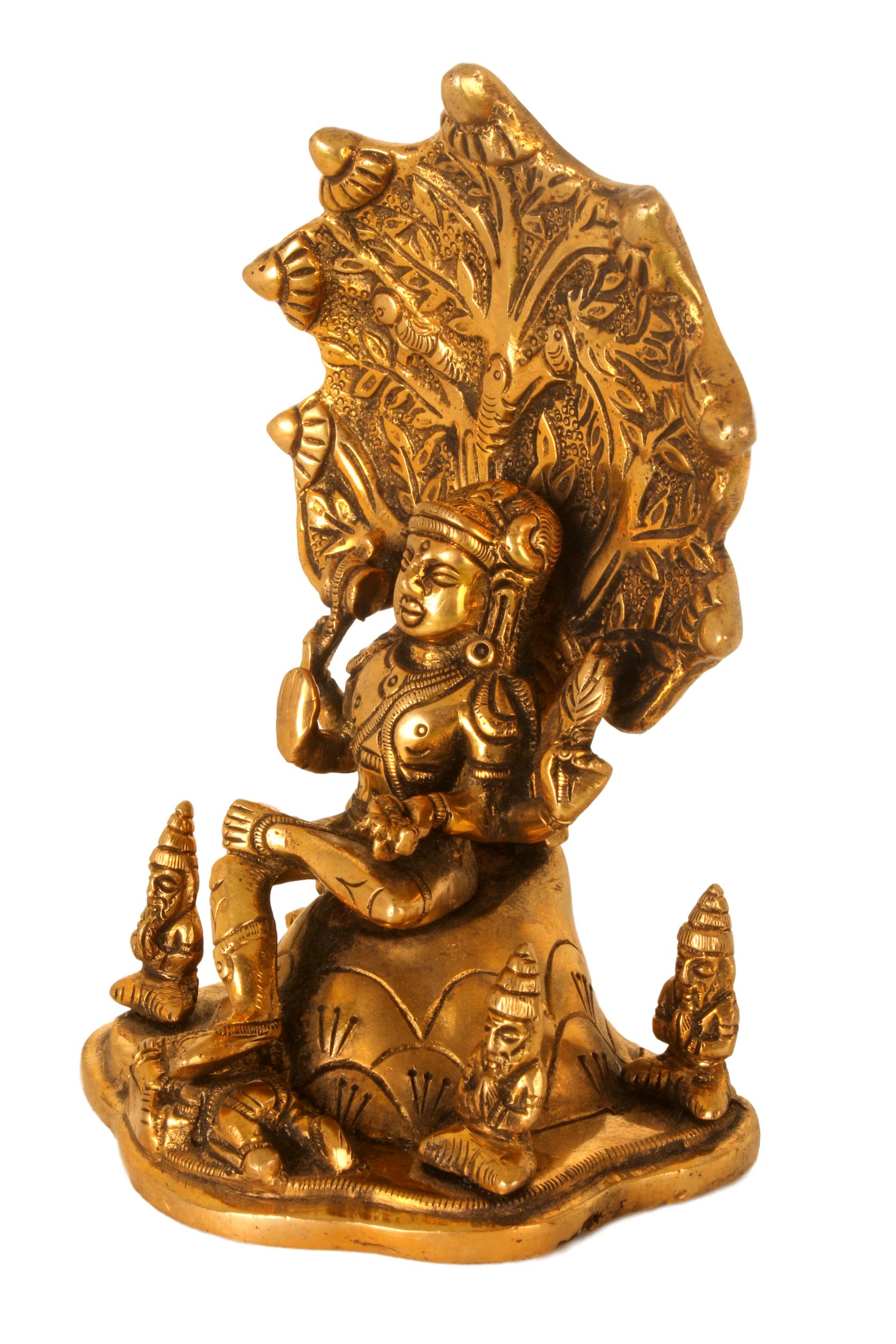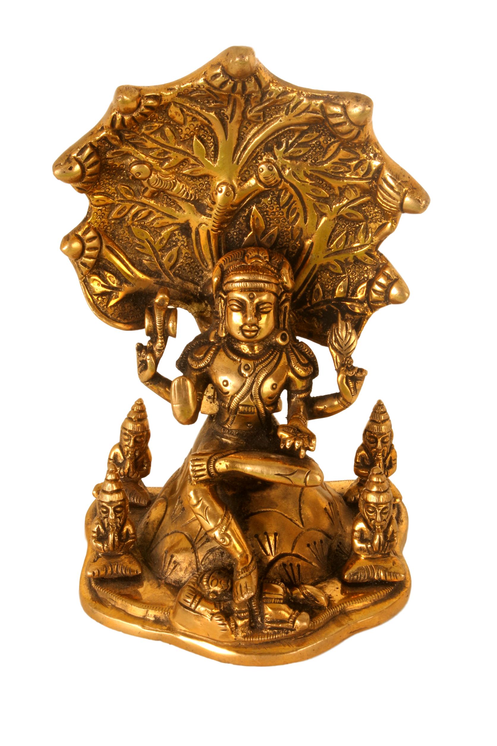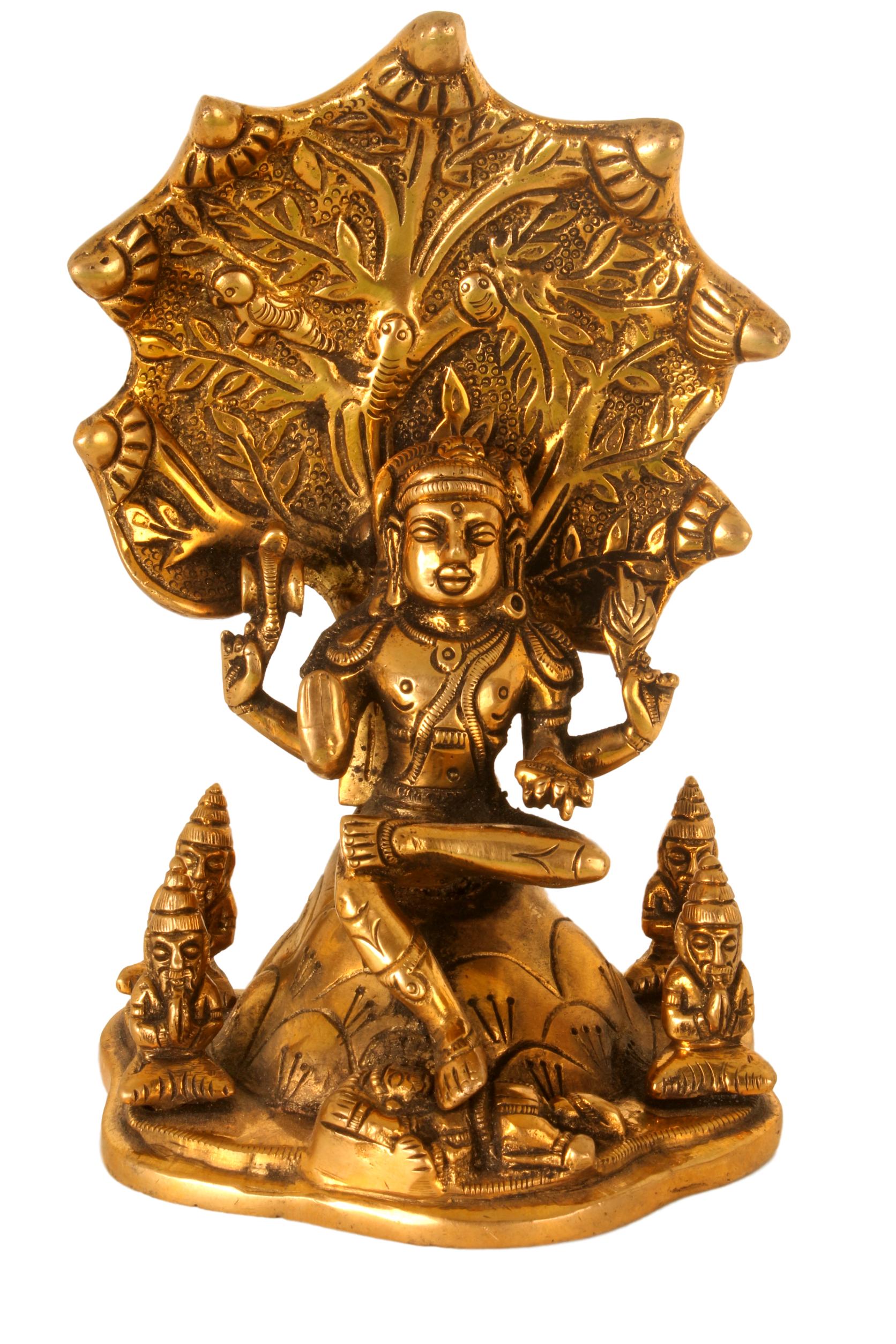 - Crafted with exquisite detail, this Brass Statue of Shiva Dakshinamurti/Dakshinamurthy idol radiates divine presence and spiritual grace. Standing majestically, Lord Shiva is depicted in the form of Dakshinamurti, the supreme teacher, sitting in a serene meditative posture. His four arms symbolize omnipresence and divine power, holding a trishula (trident), damaru (drum), and a symbolic gesture of knowledge (chin mudra). The intricate craftsmanship captures the essence of wisdom and enlightenment, making it a perfect addition to home altars, meditation spaces, or as a sacred gift. The antique brass finish adds a touch of timeless beauty, inspiring devotion and introspection.