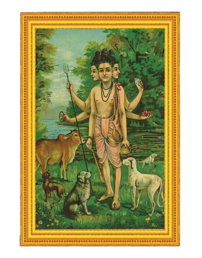 Immerse yourself in divine energy with the Dattatreya Antique Photo Frame, a captivating expression of spiritual reverence. This intricately designed frame showcases Lord Dattatreya, the embodiment of the holy trinity - Brahma, Vishnu, and Shiva, symbolizing unity and cosmic harmony. The antique finish enhances every detail, creating a timeless and elegant piece suitable for any sacred space or home altar. Crafted with meticulous artistry, this frame exudes a sense of devotion and wisdom, making it a cherished addition to your spiritual collection or a thoughtful gift for loved ones seeking divine blessings and guidance. Embrace the sacred presence of Dattatreya with this exquisite photo frame.
