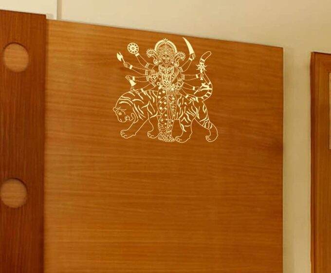 Transform your space with the captivating essence of divine power and protection embodied in our Durga with Tiger Wall Sticker. This exquisite sticker portrays Goddess Durga, symbolizing strength and fearlessness, riding atop a majestic tiger. Crafted with precision and vibrant colors, it brings an aura of spiritual grace and courage to any room. Whether adorning your home, office, or meditation space, this wall sticker adds a touch of mythological charm and reverence. Easy to apply and durable, it merges seamlessly with your decor, creating a harmonious ambiance filled with the energy of the divine feminine and the wild spirit of the tiger.