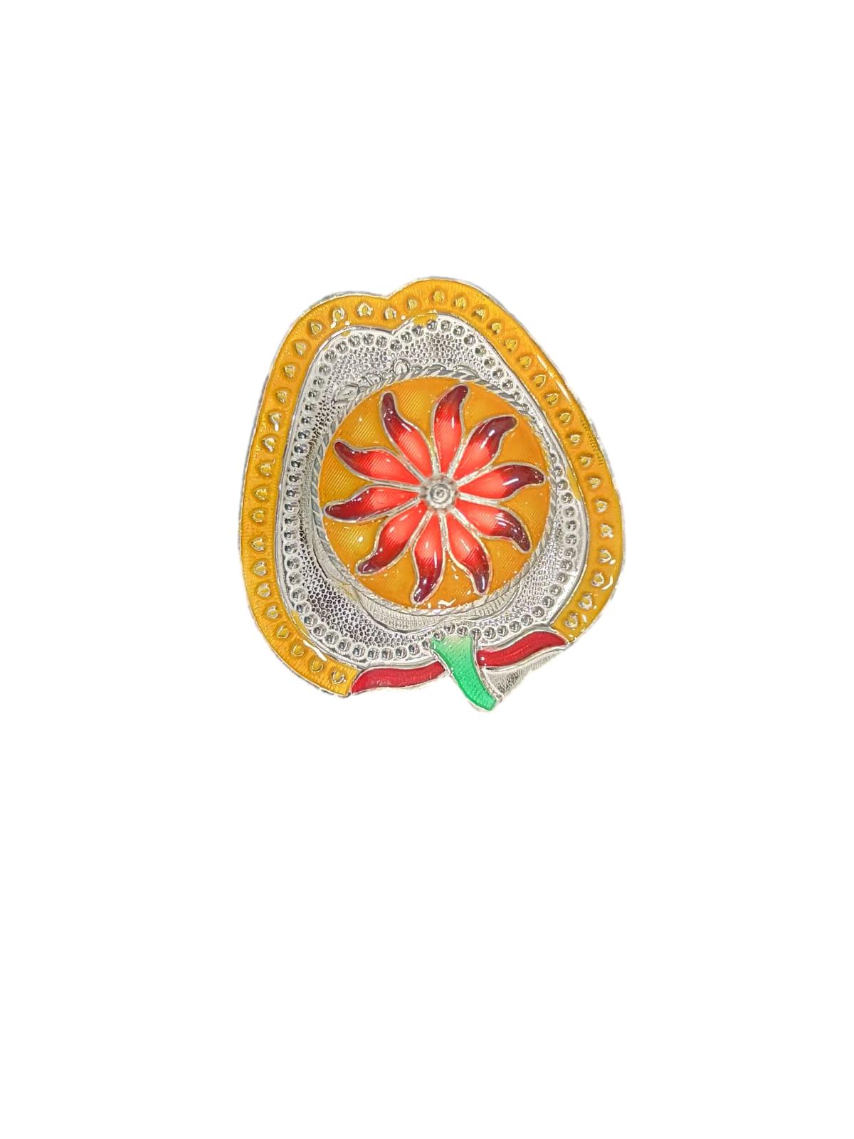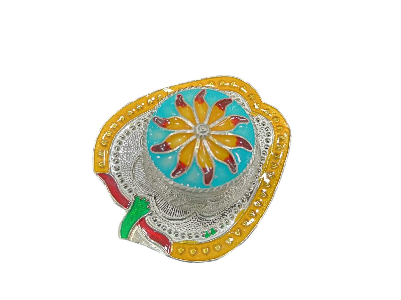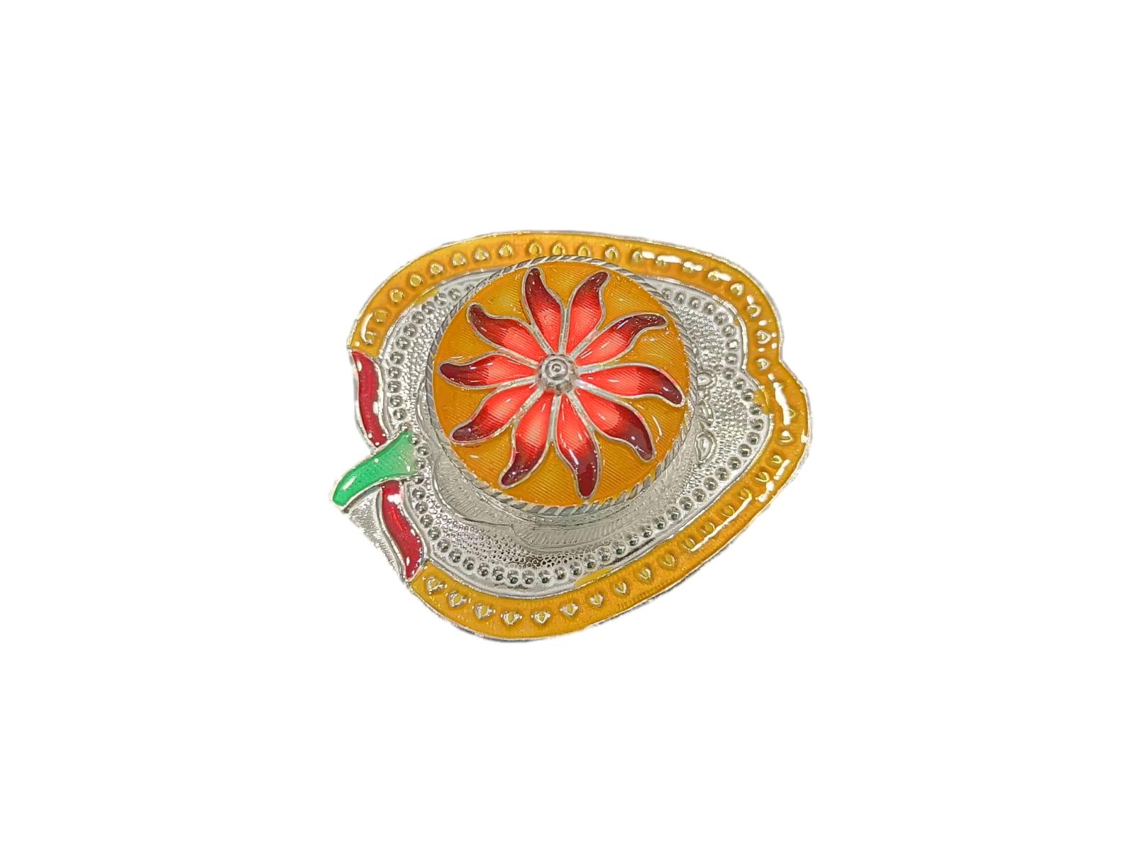 This elegant kumkum box is crafted from pure silver and adorned with rich enamel detailing. With its graceful floweral design and smooth finish, it makes a perfect gift item for auspicious occasions, weddings, or festive puja rituals.