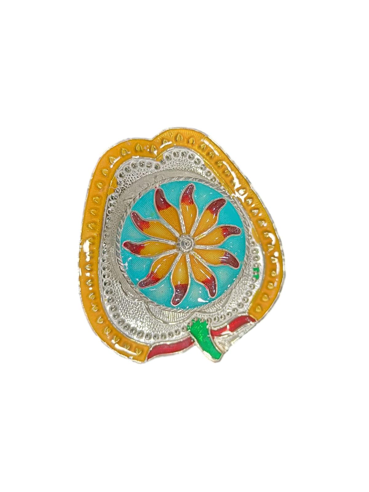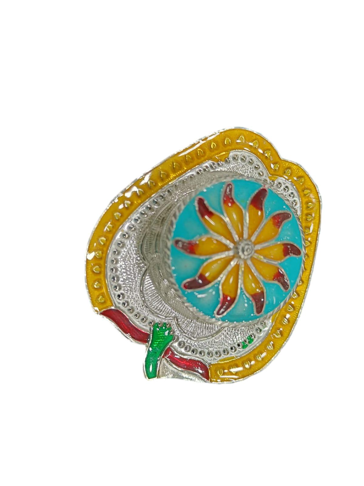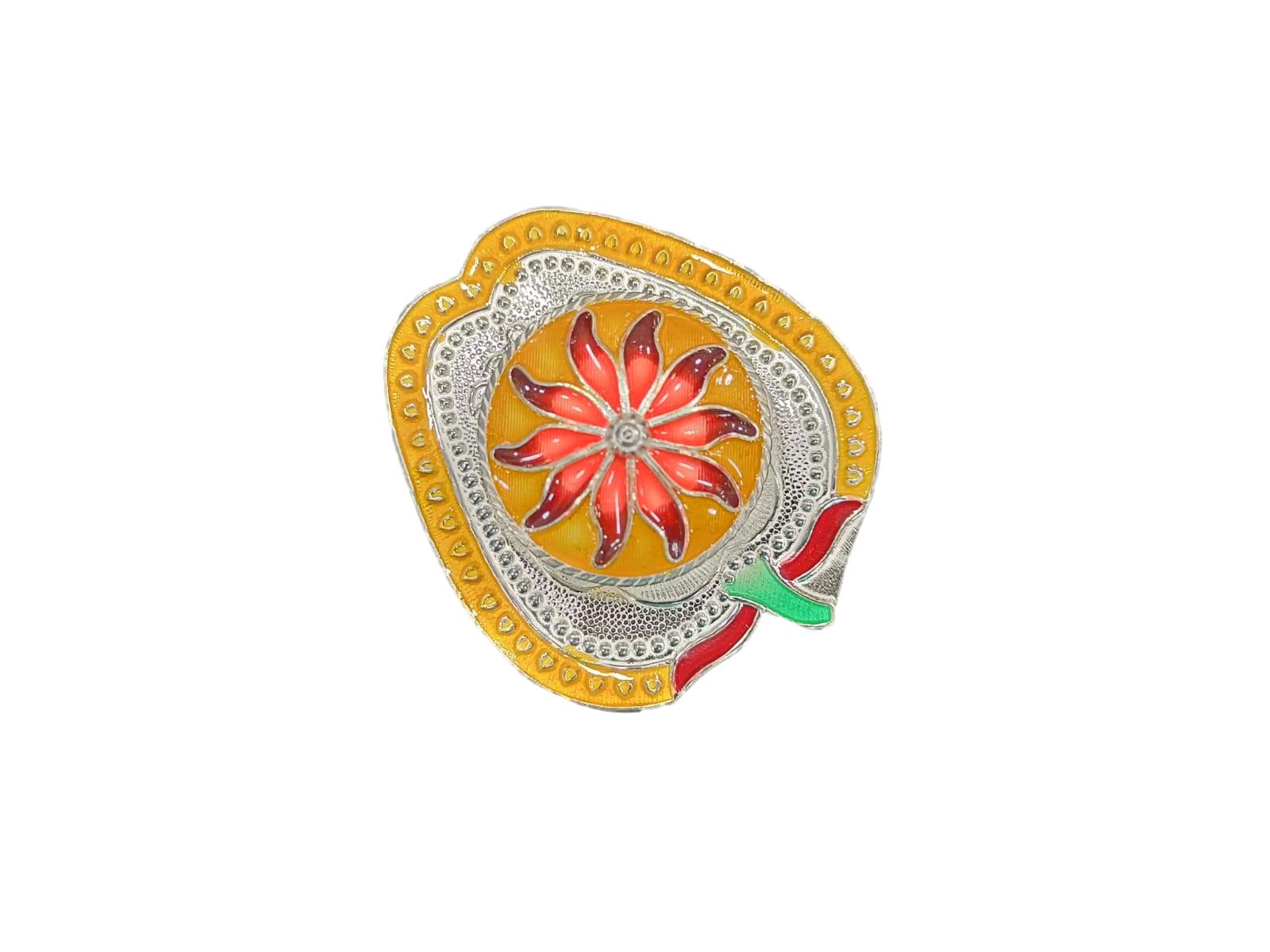This elegant kumkum box is crafted from pure silver and adorned with rich enamel detailing. With its graceful floweral design and smooth finish, it makes a perfect gift item for auspicious occasions, weddings, or festive puja rituals.