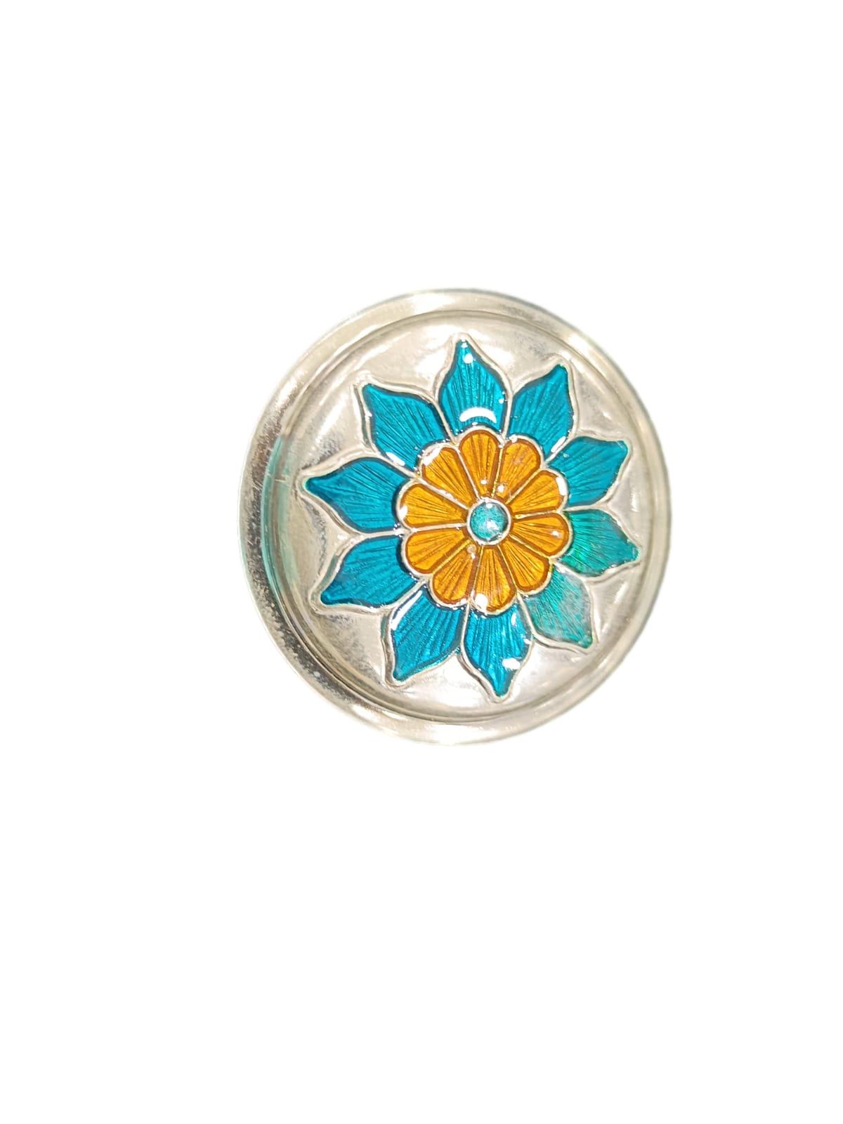 Crafted from pure silver with elegant enamel detailing, this round kumkum box is a perfect blend of tradition and sophistication. Ideal for daily puja rituals or as a graceful gift, it serves both utility and beauty on your altar.