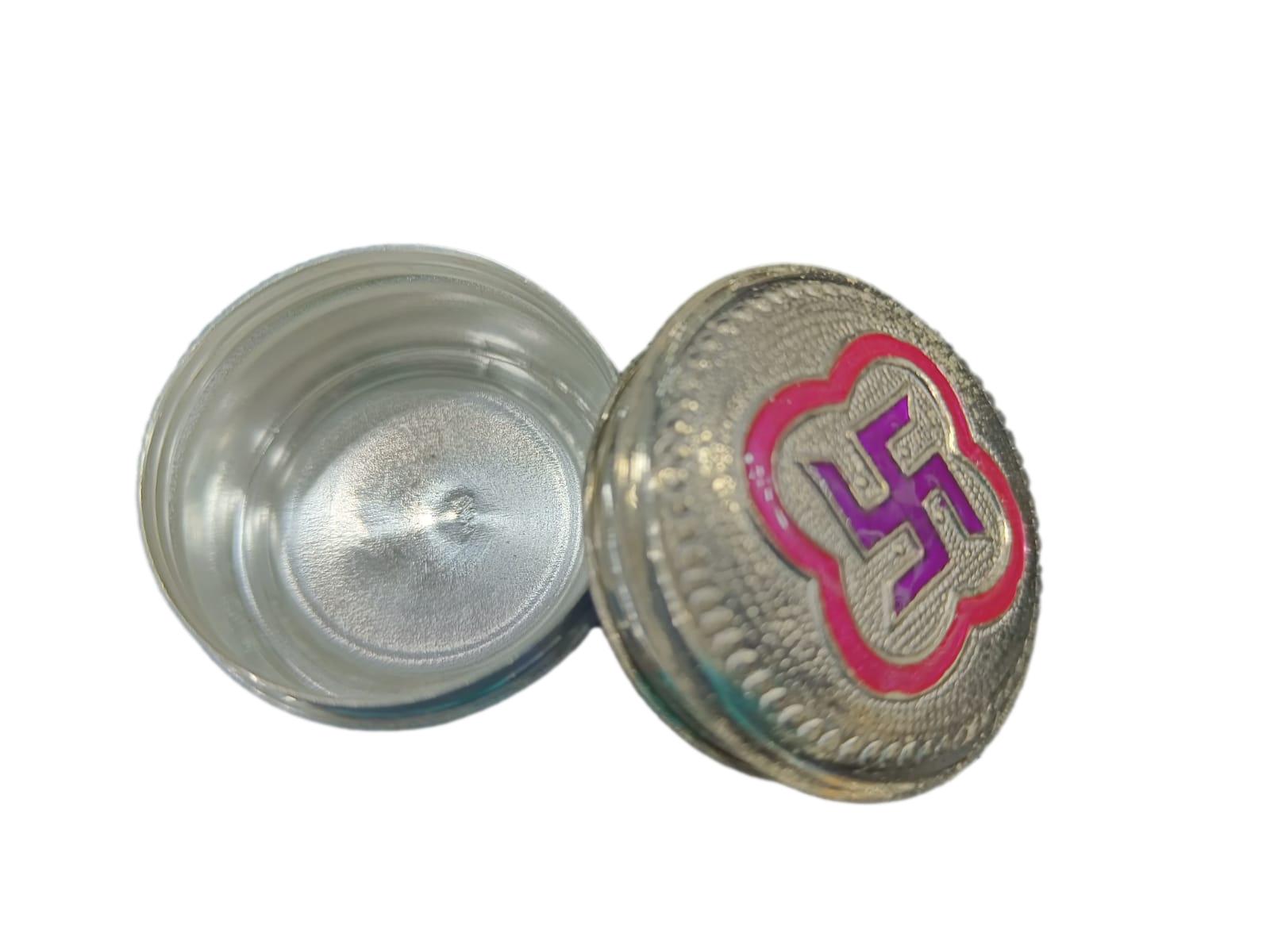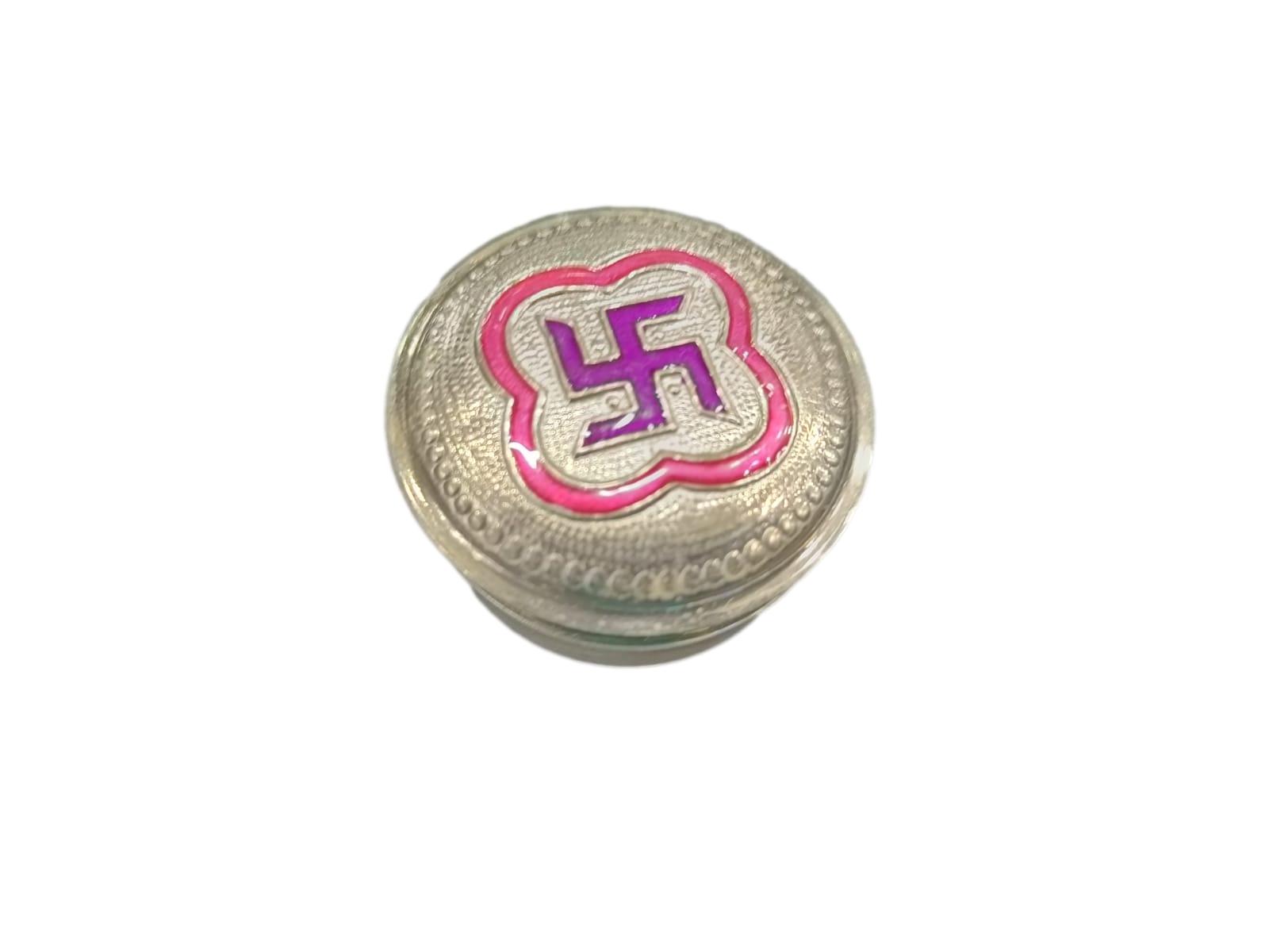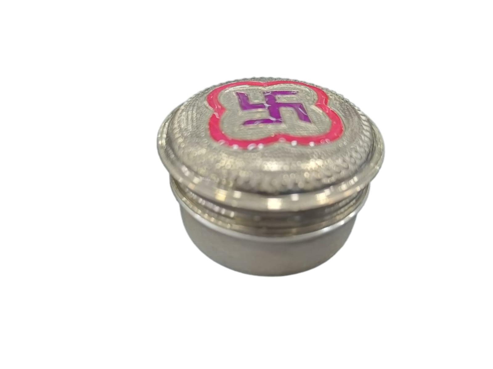 Crafted in pure silver with fine enamel detailing, this elegant Swastik-shaped box symbolizes auspiciousness and prosperity. Compact yet meaningful, it is ideal for holding kumkum, haldi, or sacred items. A perfect gift for religious occasions, weddings, or festivals, this box blends tradition with timeless craftsmanship.