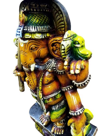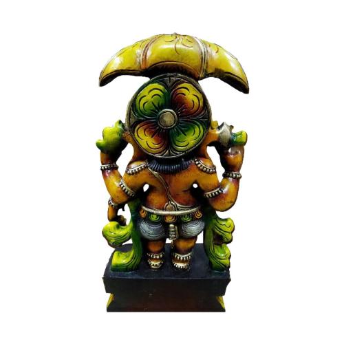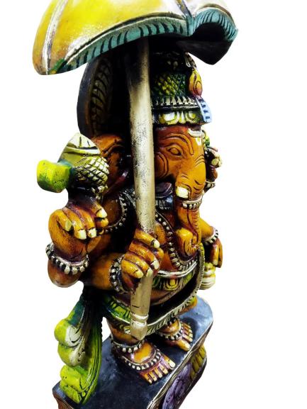 The multicolour finish enhances the detailed carvings, bringing out the divine and intricate features of Ganesha and the umbrella. The natural grain of the jackfruit wood adds to the visual appeal, creating a warm and inviting piece.