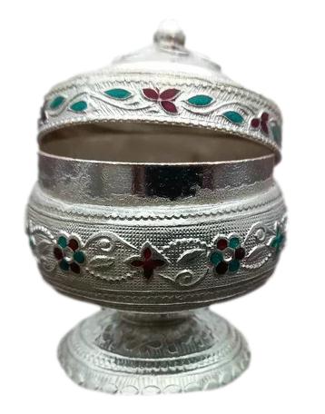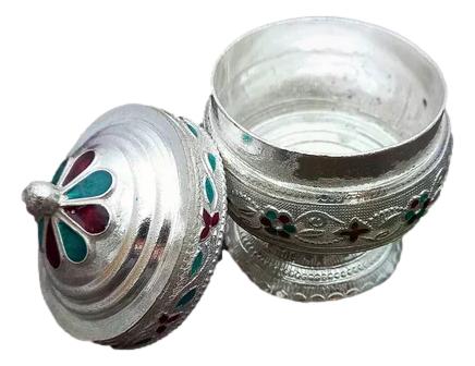Introducing our exquisite German Silver Kumkum Box, a symbol of elegance and tradition. Crafted with intricate floral patterns and fine detailing, this box is perfect for storing kumkum or other sacred items. The durable German silver material ensures longevity and a stunning silver finish that adds a touch of sophistication to any pooja or festive occasion. Enhance your spiritual practices with this beautifully crafted Kumkum Box, a blend of beauty and functionality.