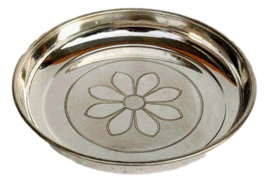 Introducing our exquisite German Silver Pooja Plate, meticulously crafted for your sacred rituals. This ornate plate, adorned with intricate designs and a lustrous finish, exudes elegance and reverence. Ideal for offering prayers, performing aarti, or presenting offerings during worship, this plate adds a touch of divine grace to your spiritual practices. Its durable construction ensures longevity, making it a cherished addition to your puja essentials. Embrace tradition with this timeless and versatile pooja plate.