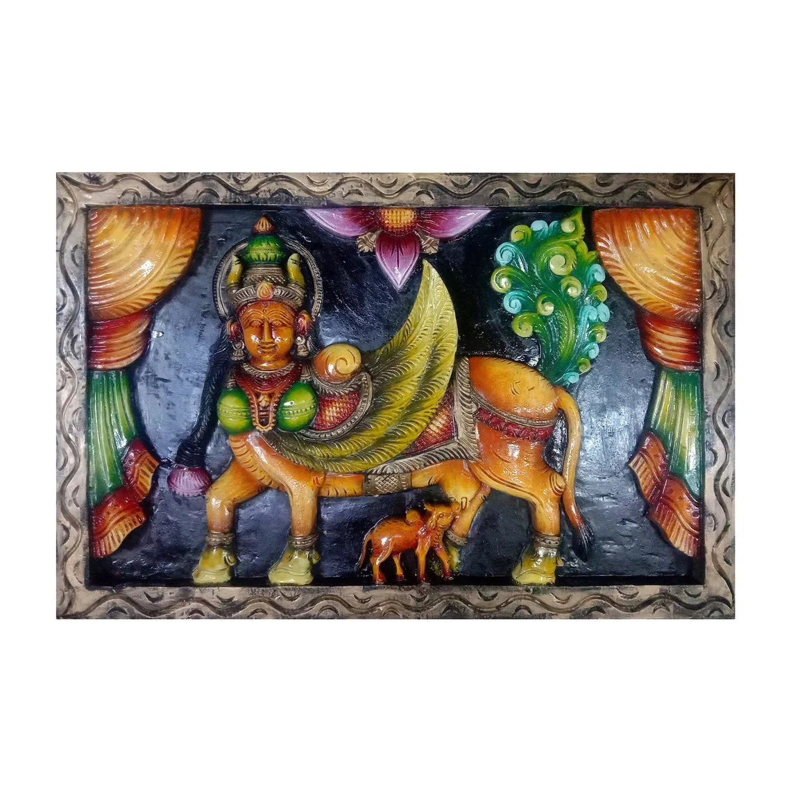 Jackfruit wood is prized for its durability and unique grain patterns, which lend a distinctive charm to each wall hanging. The multicolour finish enhances the detailed carvings, bringing to life the divine and auspicious symbolism of Kamadhenu. This piece is not just a decorative item but a symbol of abundance and well-being.