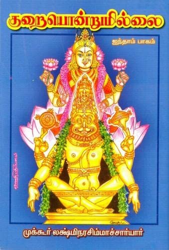 "Kuraiyondrumillai" by Mukkoor Lakshmi Narasimhachariar is a profound Tamil literary work delving into the depths of Sri Vaishnavism. This book encapsulates the essence of devotion, philosophy, and spiritual wisdom through insightful narratives and commentaries on the divine scriptures. Narasimhachariar's eloquent prose and deep understanding of Vaishnavite principles make this book a treasure trove for spiritual seekers. It illuminates the path of devotion to Lord Vishnu, delving into the intricacies of karma, dharma, and ultimate liberation. "Kuraiyondrumillai" serves as a beacon of enlightenment, guiding readers on a transformative journey towards deeper spiritual understanding and divine connection.