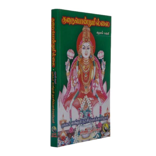 "Kuraiyondrumillai" by Mukkoor Lakshmi Narasimhachariar is a Tamil literary gem encompassing the essence of Sri Vaishnavism. This book delves into the philosophy, rituals, and devotional practices of the Vaishnavite tradition, offering profound insights into spirituality and divine worship. With eloquent prose and deep understanding, the author explores the significance of devotion, karma, and the path to liberation. "Kuraiyondrumillai" serves as a comprehensive guide for spiritual seekers, providing clarity on intricate concepts and fostering a deeper connection with divinity. It is a must-read for those exploring the rich heritage and profound teachings of Sri Vaishnavism.