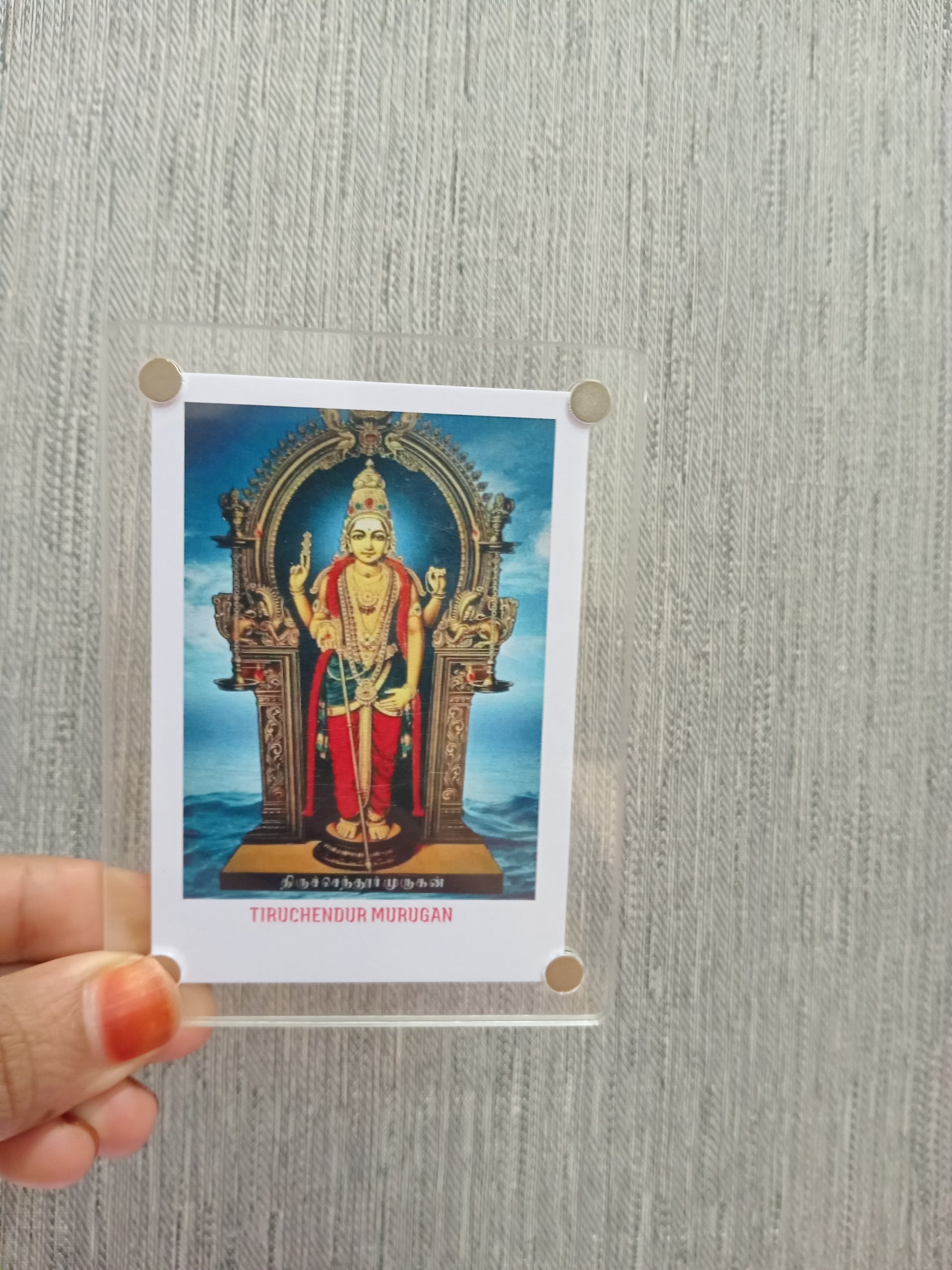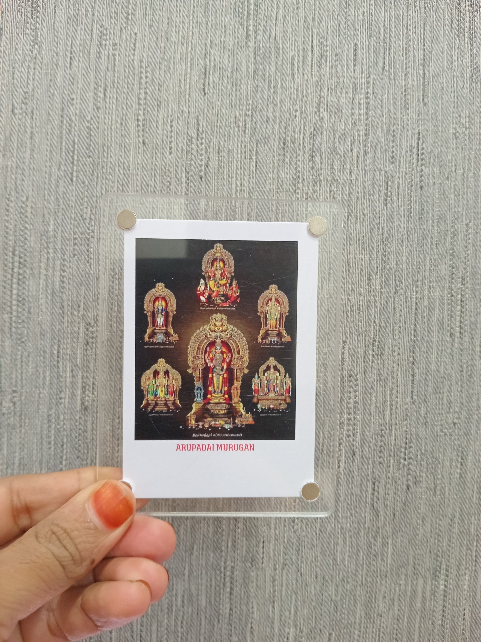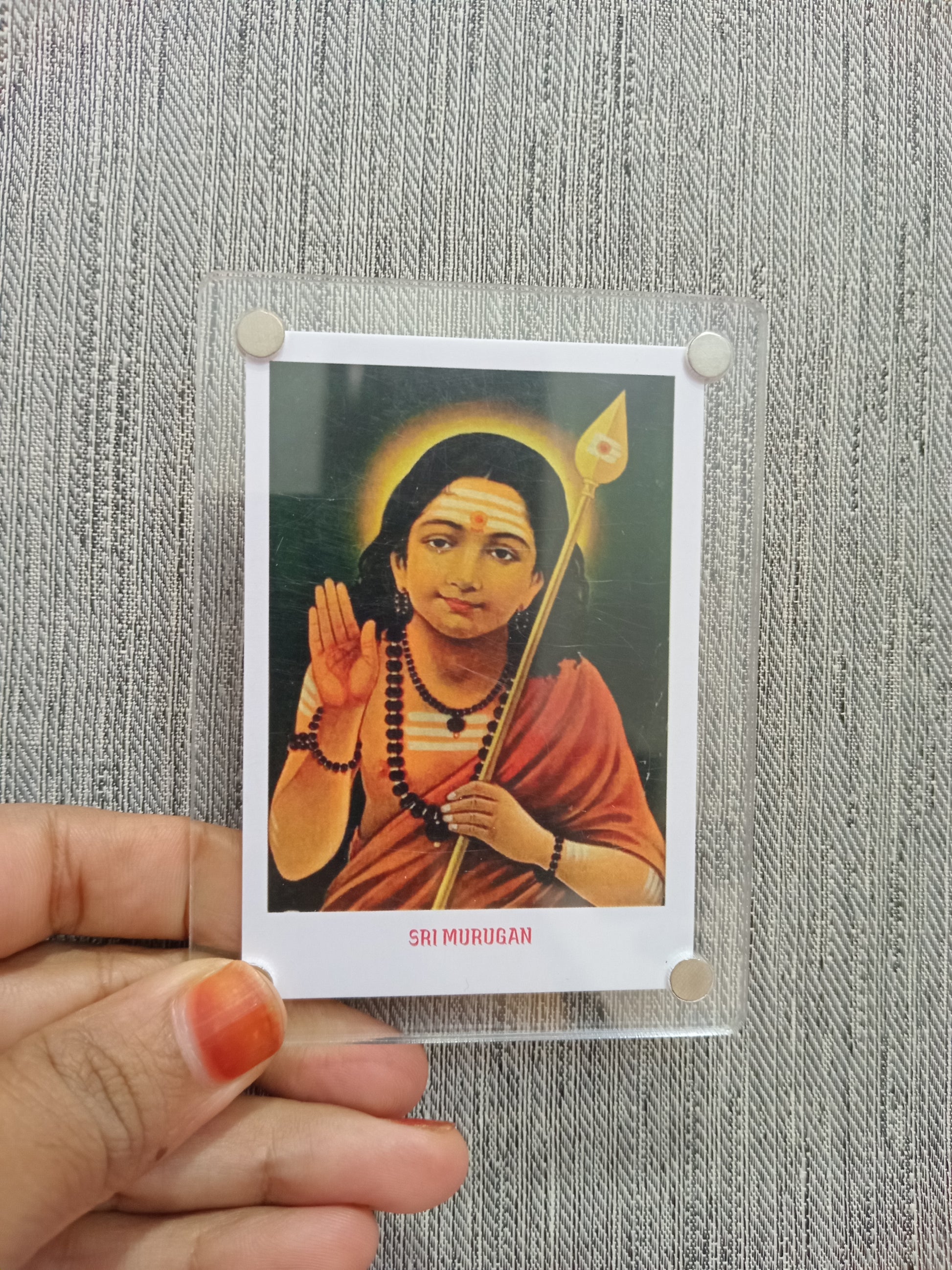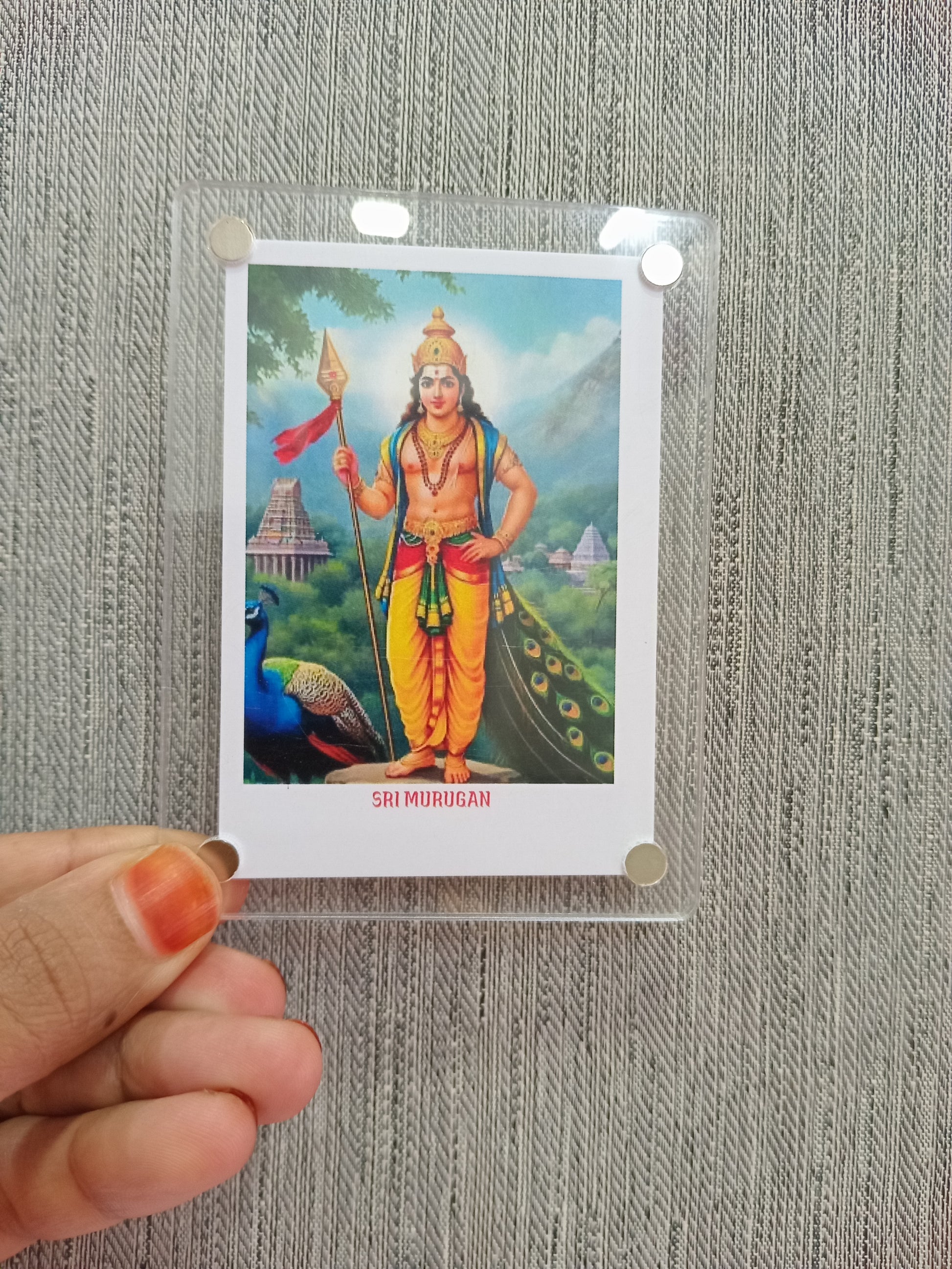 A Murugan polaroid fridge magnet typically features a vibrant, high-quality image of Lord Murugan, the Hindu deity of war,victory, and wisdom, styled in a nostalgic polaroid frame. Crafted on a durable, fiexible magnetic sheet with a glossy or matte finish. this magnet serves a both a spiritual keepsake and a decorative piece, bringing blessings and elegance to your home.