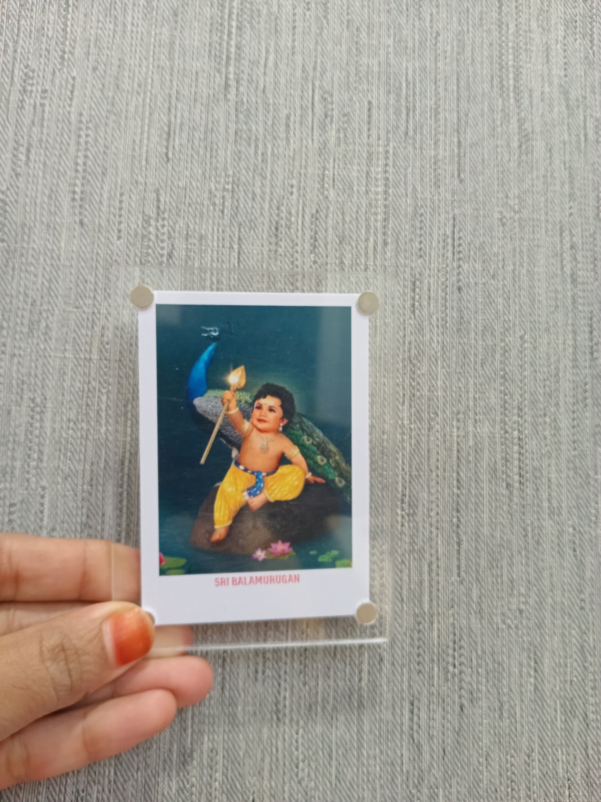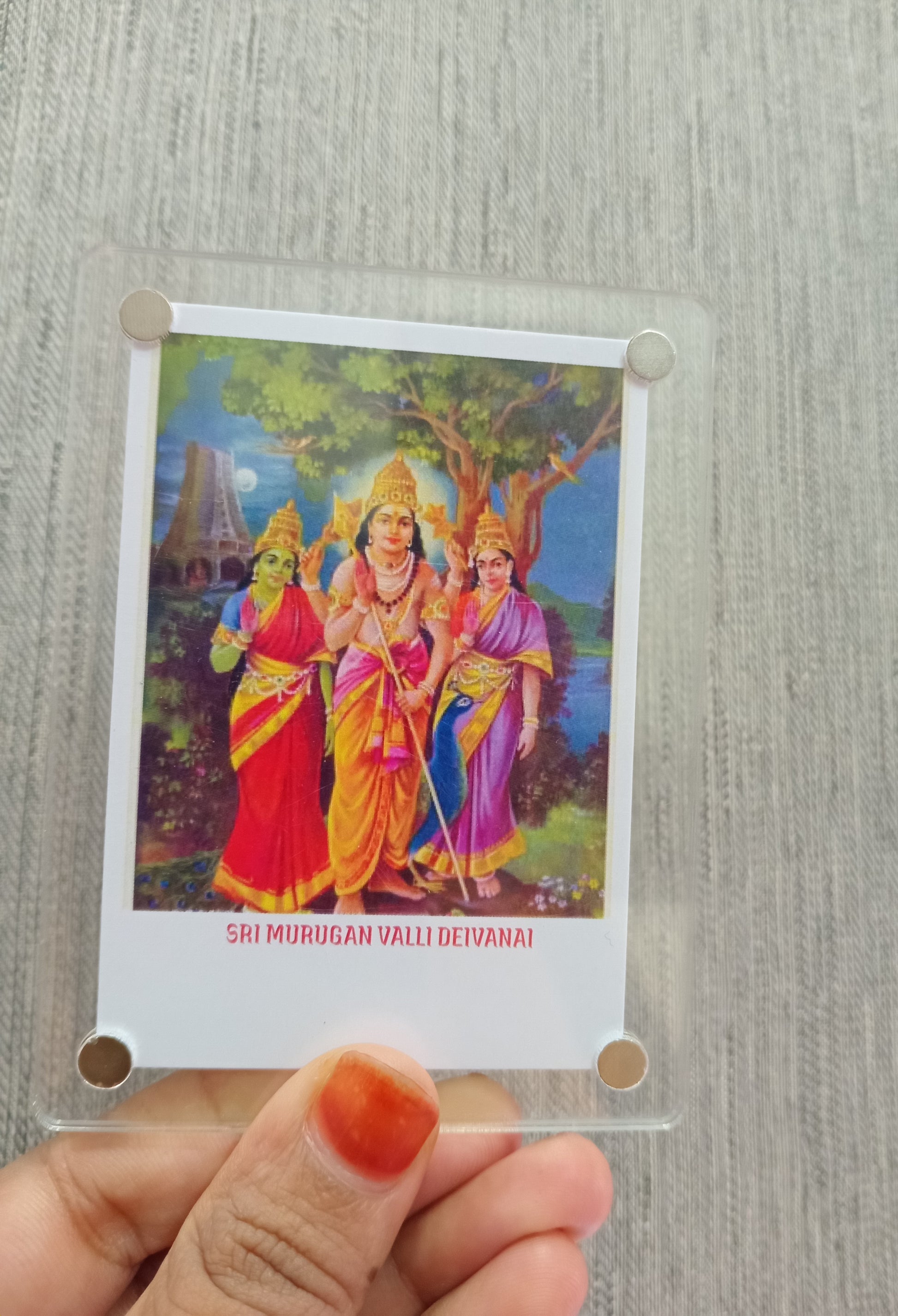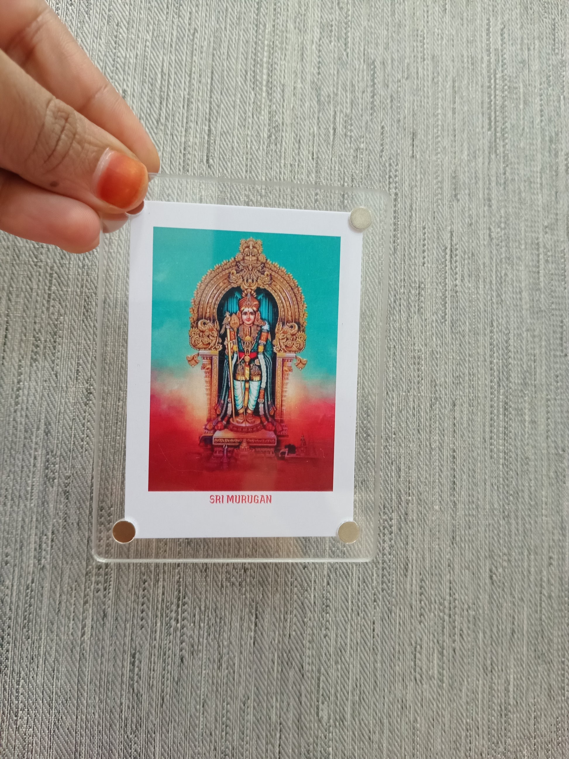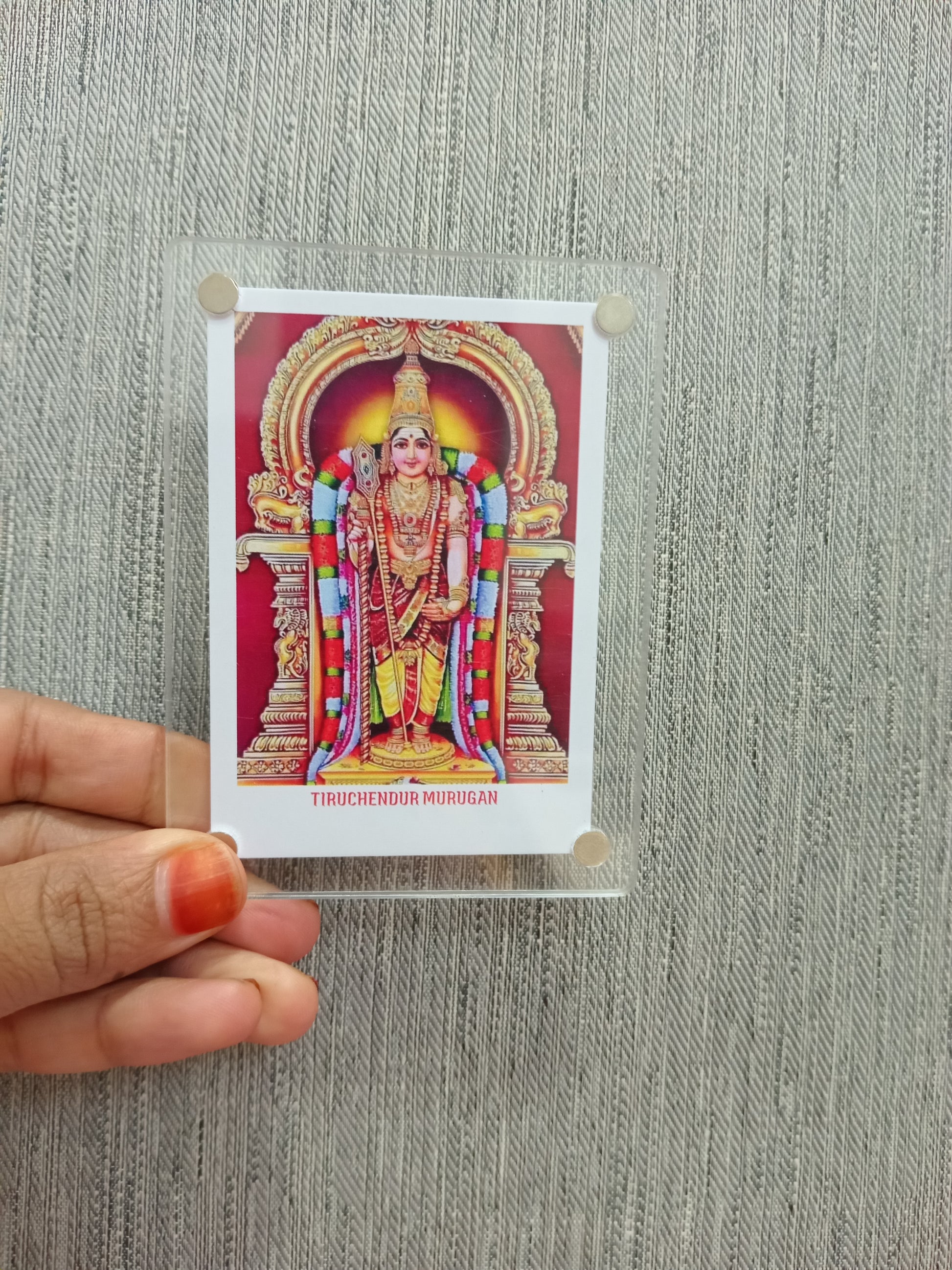 A Murugan polaroid fridge magnet typically features a vibrant, high-quality image of Lord Murugan, the Hindu deity of war,victory, and wisdom, styled in a nostalgic polaroid frame. Crafted on a durable, fiexible magnetic sheet with a glossy or matte finish. this magnet serves a both a spiritual keepsake and a decorative piece, bringing blessings and elegance to your home.