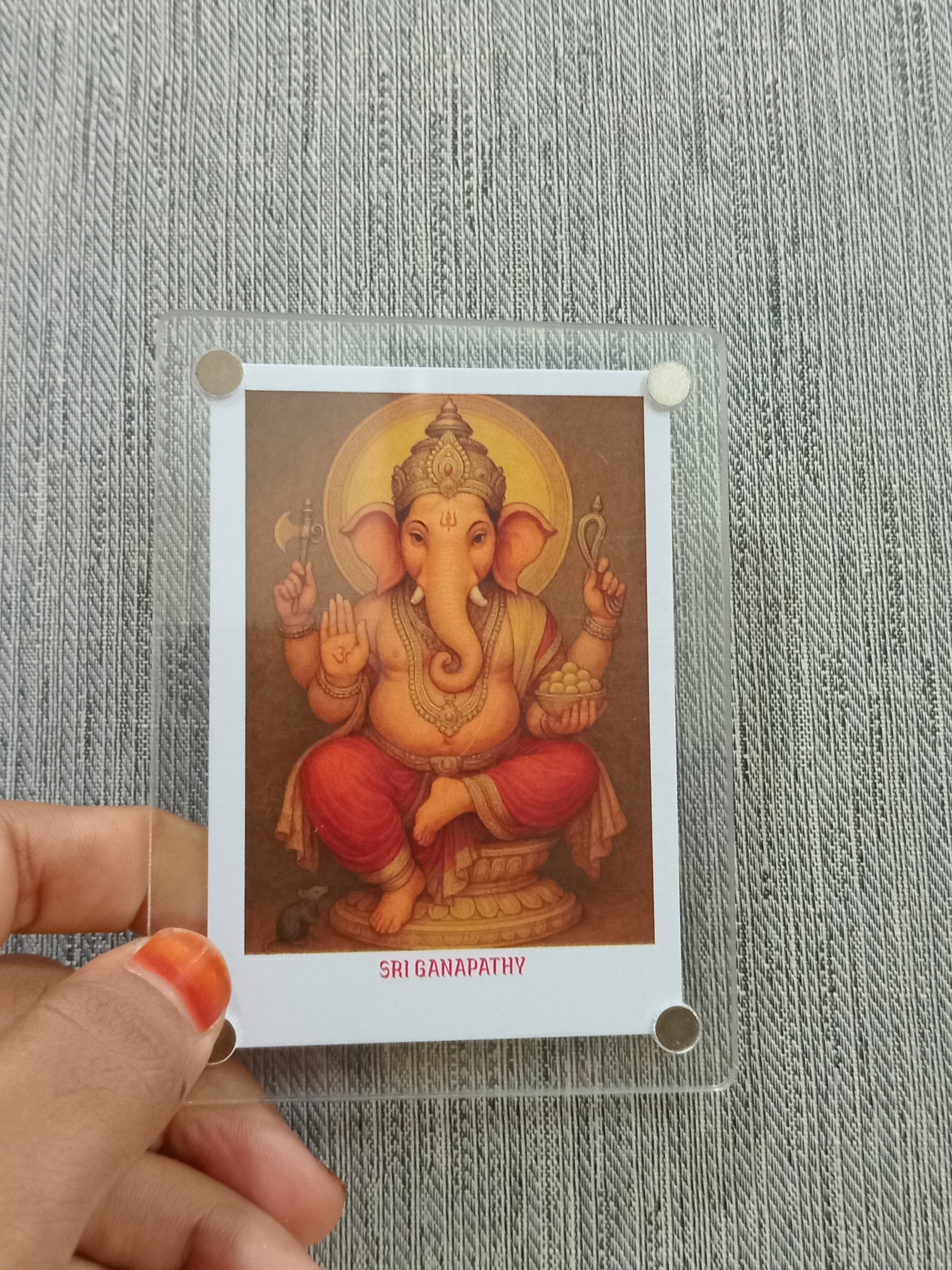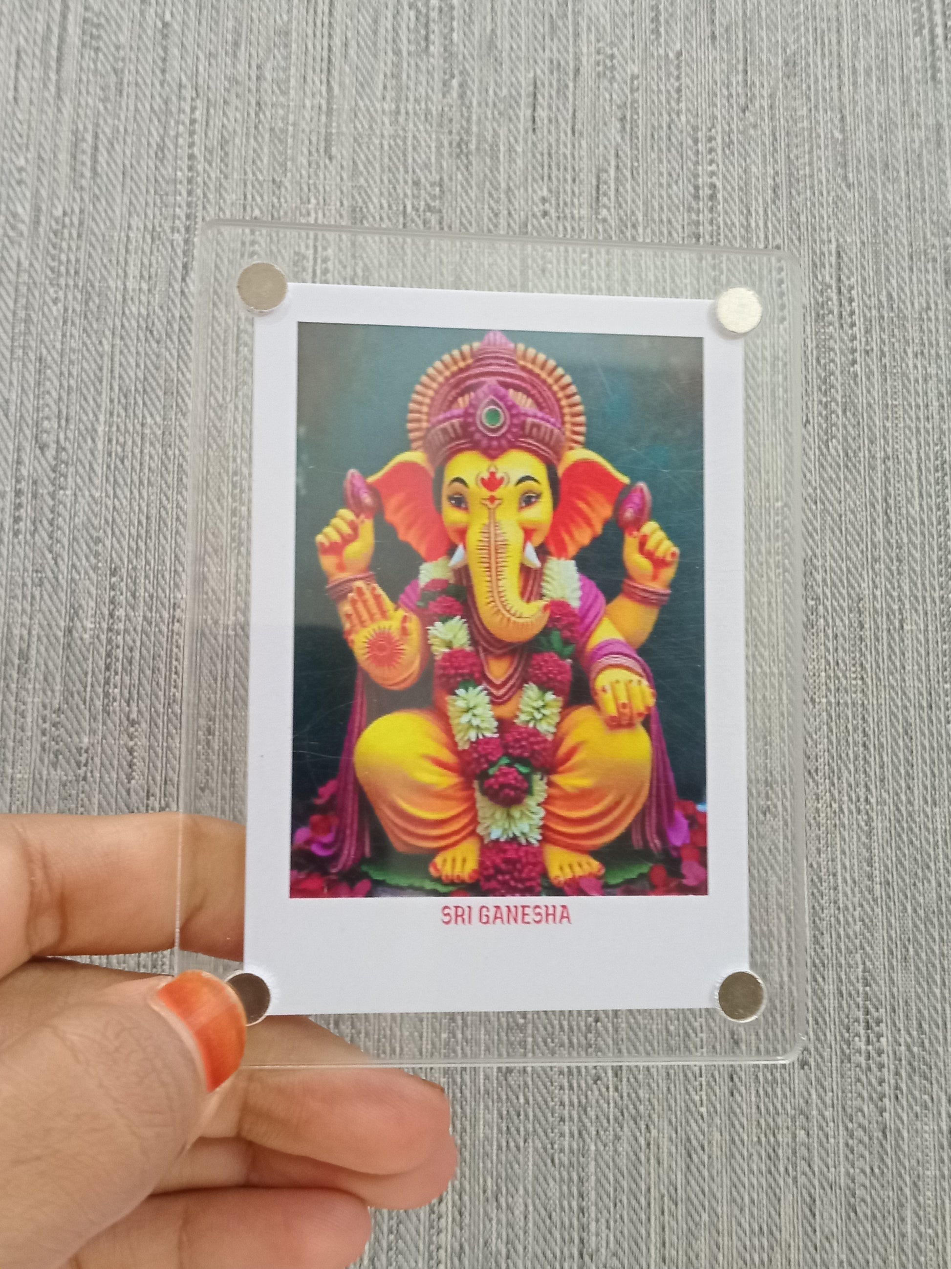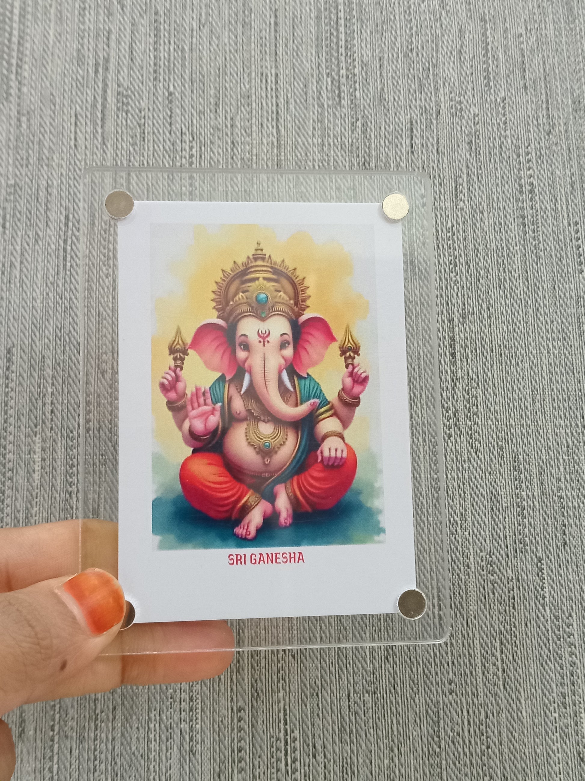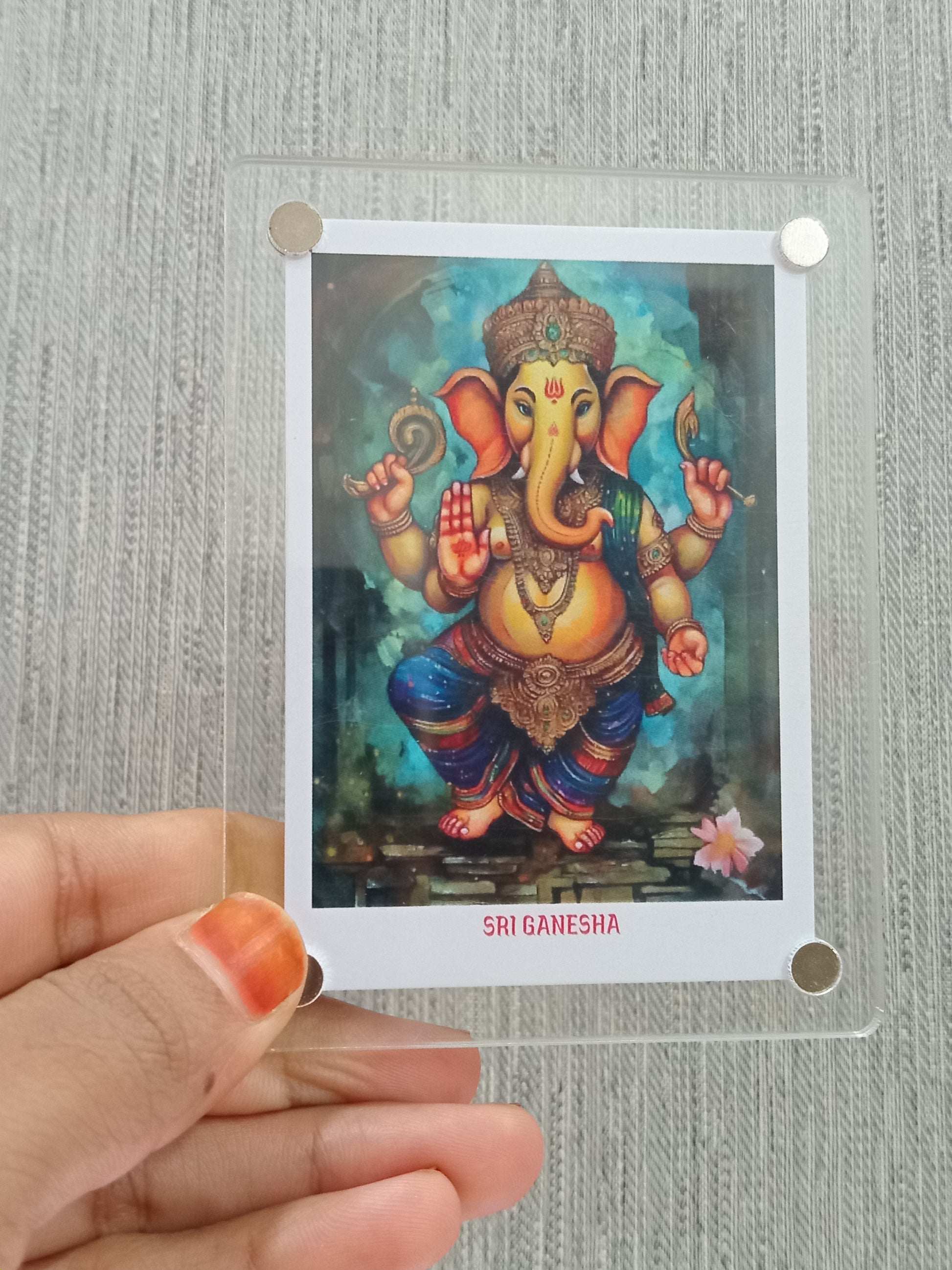 A Ganesha Polaroid fridge magnet combines the traditional imagery of Lord Ganesha, the Hindu deity known for wisdom and obstacle removal, with Polaroid-style design. This magnet serves a both a spiritual keepsake and a decorative piece, bringing blessings and elegance to your home.