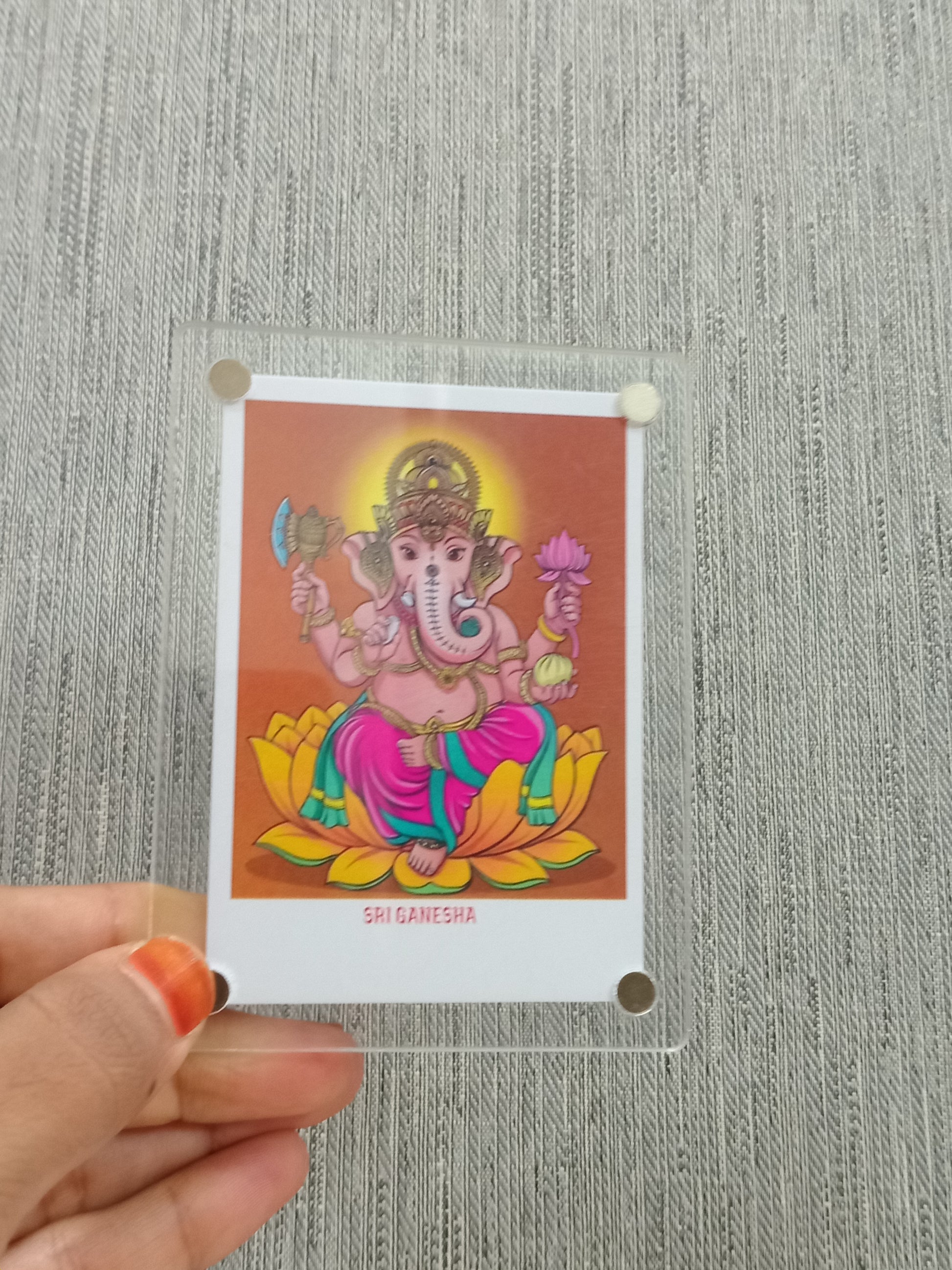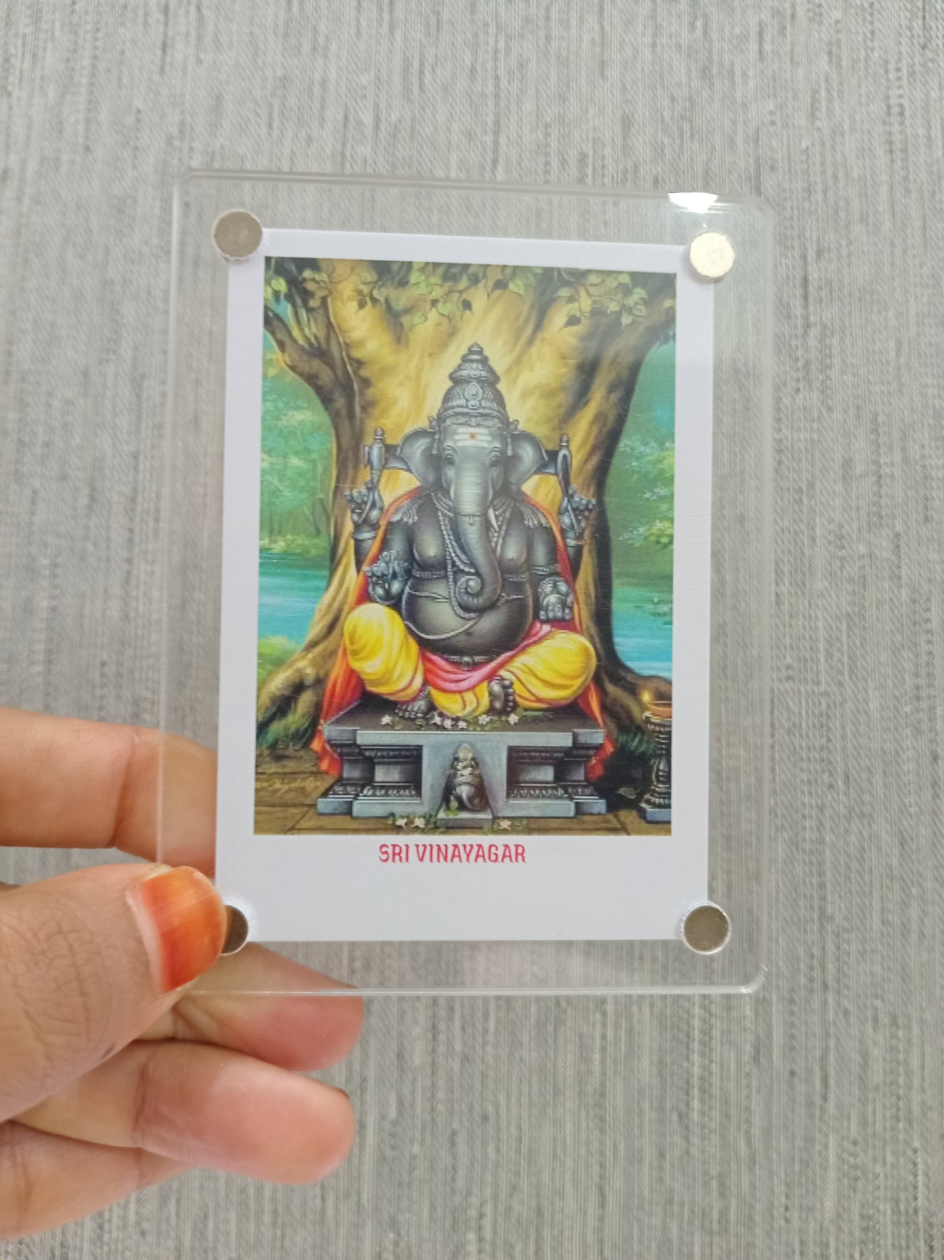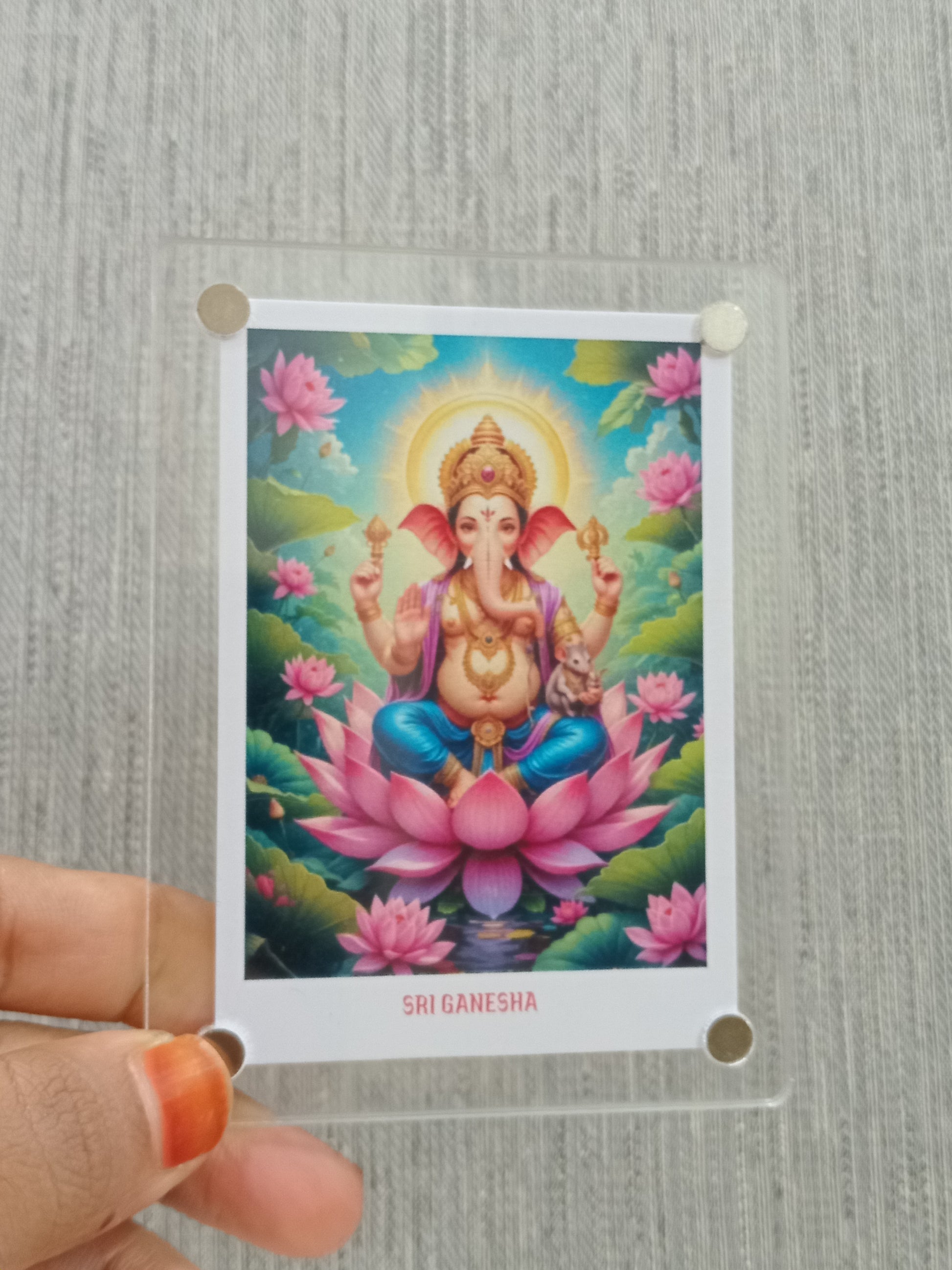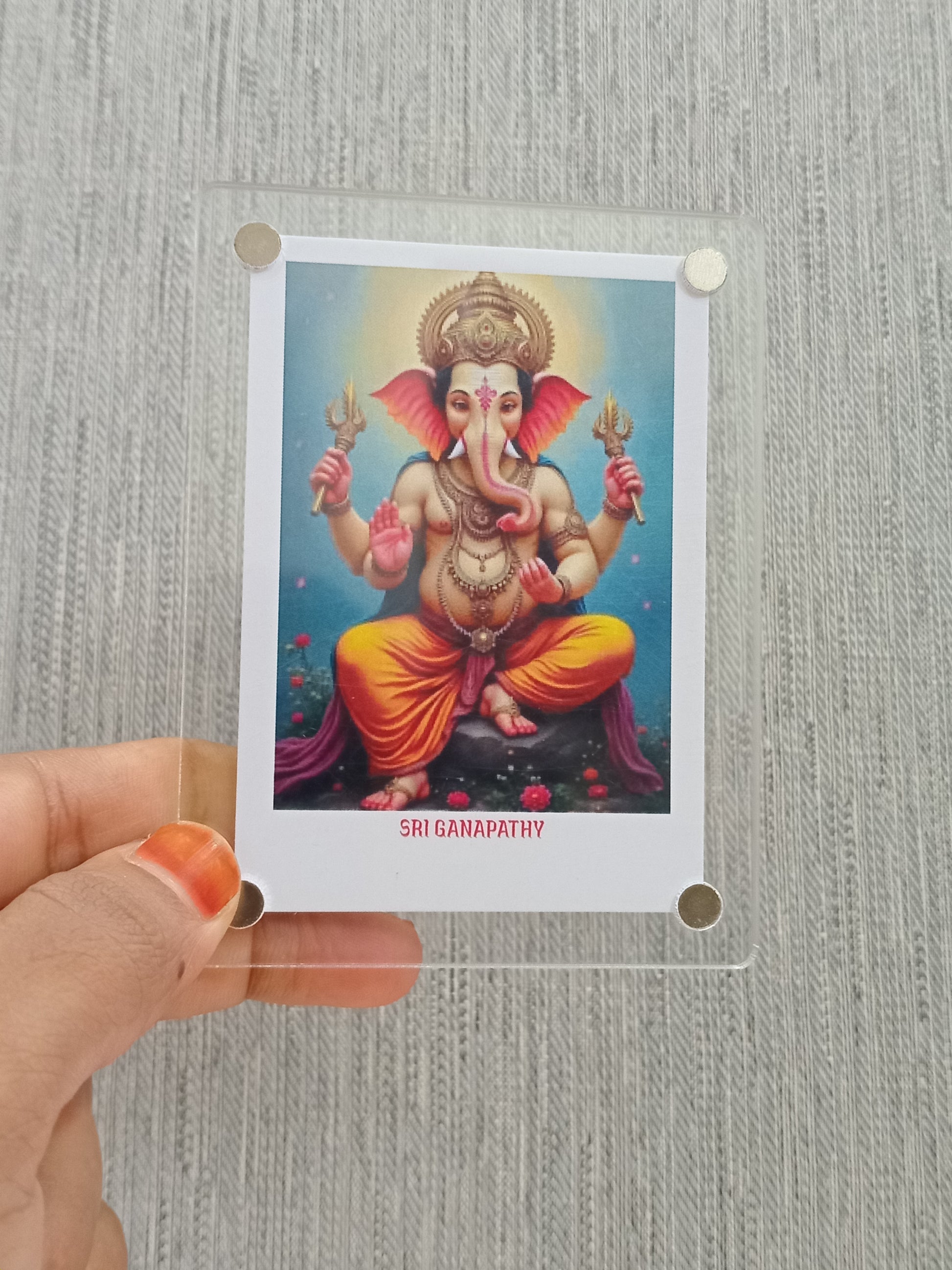 A Ganesha Polaroid fridge magnet combines the traditional imagery of Lord Ganesha, the Hindu deity known for wisdom and obstacle removal, with Polaroid-style design. This magnet serves a both a spiritual keepsake and a decorative piece, bringing blessings and elegance to your home.