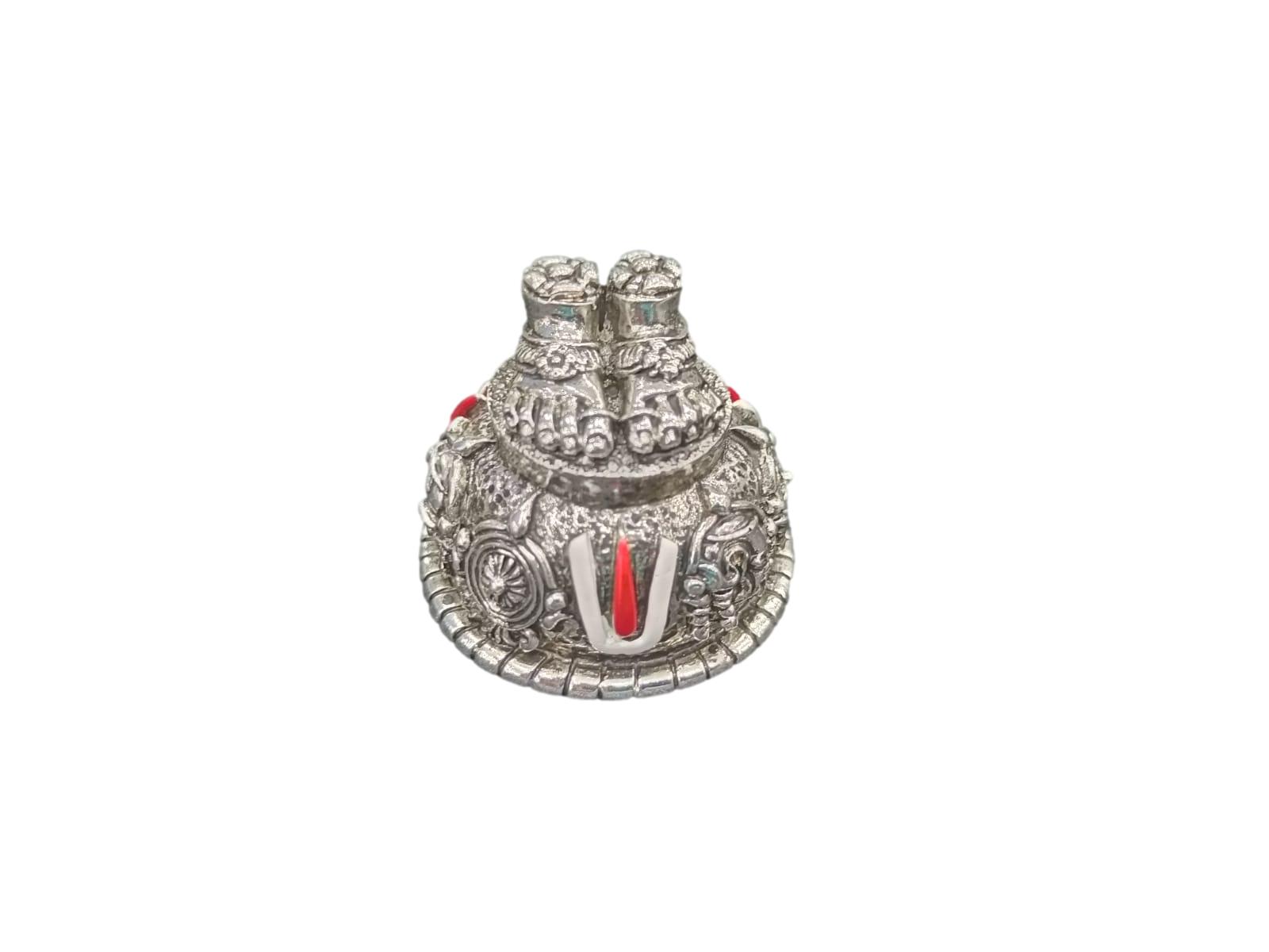 A sacred representation of Lord Venkateswara’s divine feet, intricately designed with Shanku (conch), Chakra (discus), and the Namam symbol, all in an antique silver finish. Ideal for daily worship, gifting, or placement on your home altar, this spiritual piece invokes blessings and devotion.