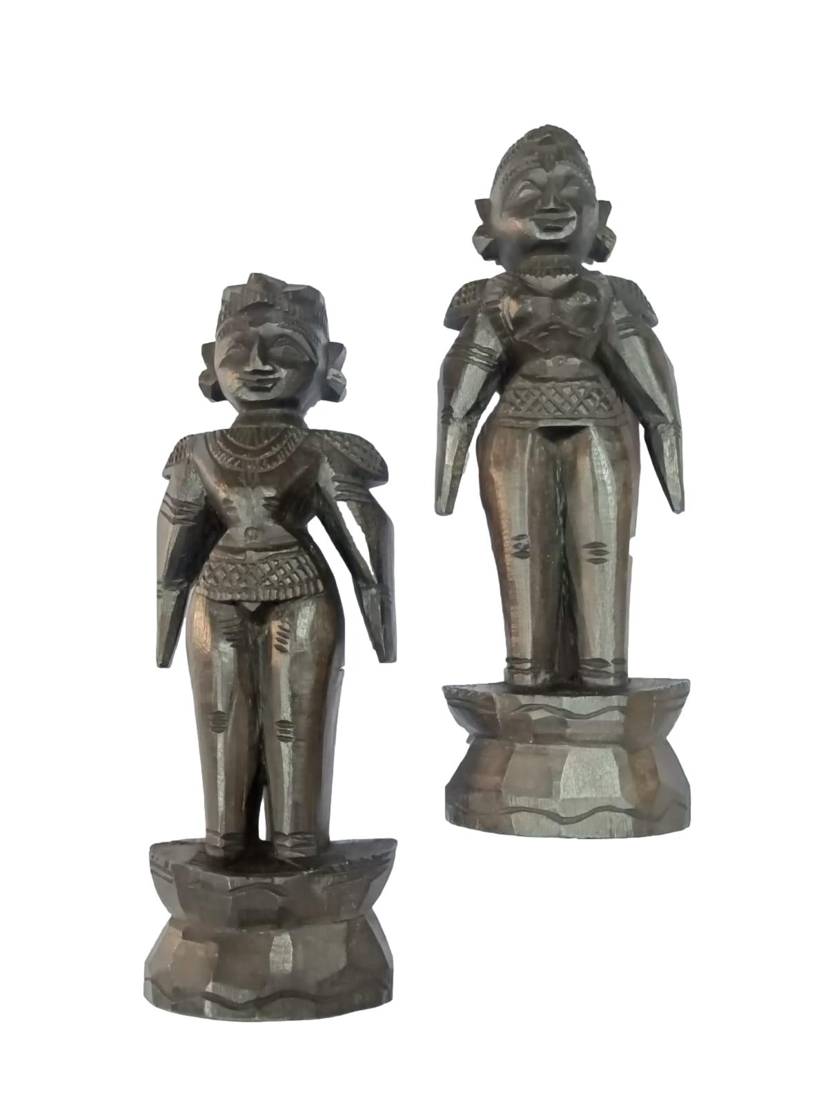 The Marapachi Wooden Male and Female Pair Dolls are exquisite handcrafted pieces rooted in South Indian tradition. Made from high-quality red sandalwood, these dolls are meticulously carved and polished to perfection. Each doll represents traditional attire and intricate details, showcasing the craftsmanship and cultural heritage. Perfect for gifting, home decor, or as a collector's item, these dolls embody a timeless elegance and a touch of tradition. Their durable construction ensures they can be cherished for generations. Celebrate Indian heritage and artistry with this beautiful Marapachi wooden doll pair, a symbol of love, unity, and cultural richness.