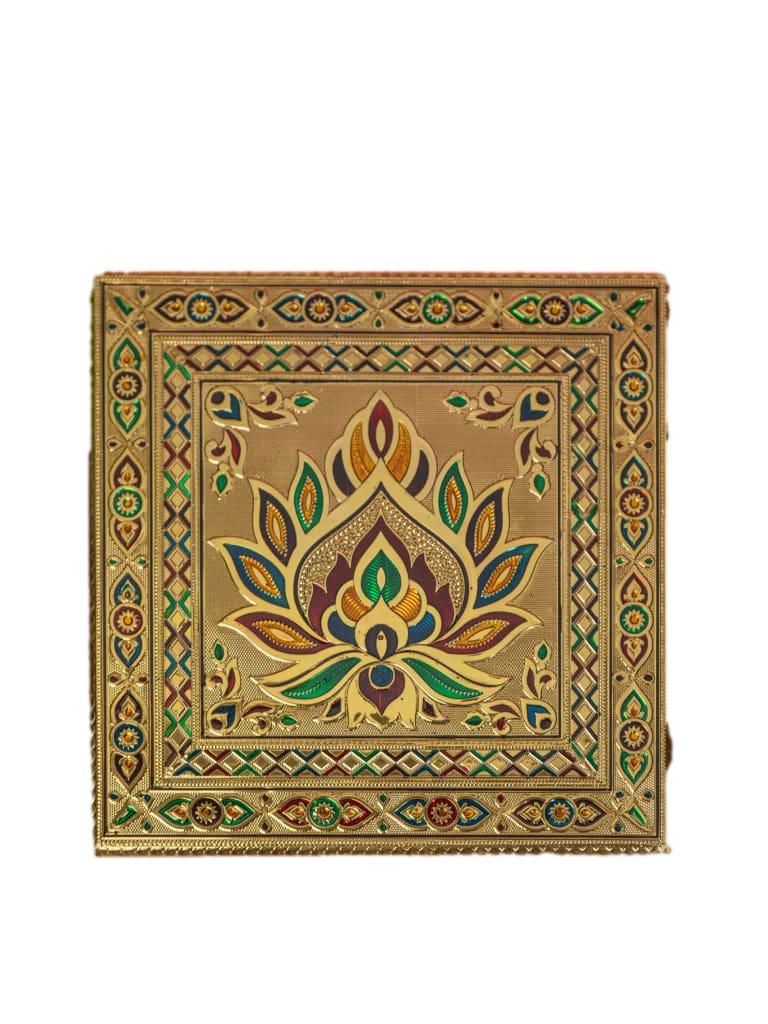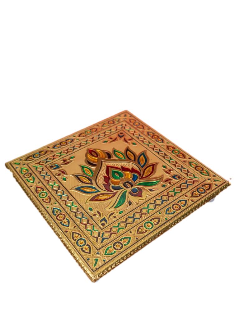 The Meenakari Manai with Deepam Design is a beautifully crafted piece, showcasing intricate Meenakari work that enhances its aesthetic appeal. This traditional manai (seat) features a deepam (lamp) design, symbolizing light and positivity. Made from high-quality materials, it is perfect for pooja rooms, adding a touch of elegance and spirituality to your rituals. The vibrant colors and detailed patterns make it a unique addition to your home decor, serving as both a functional and decorative item.