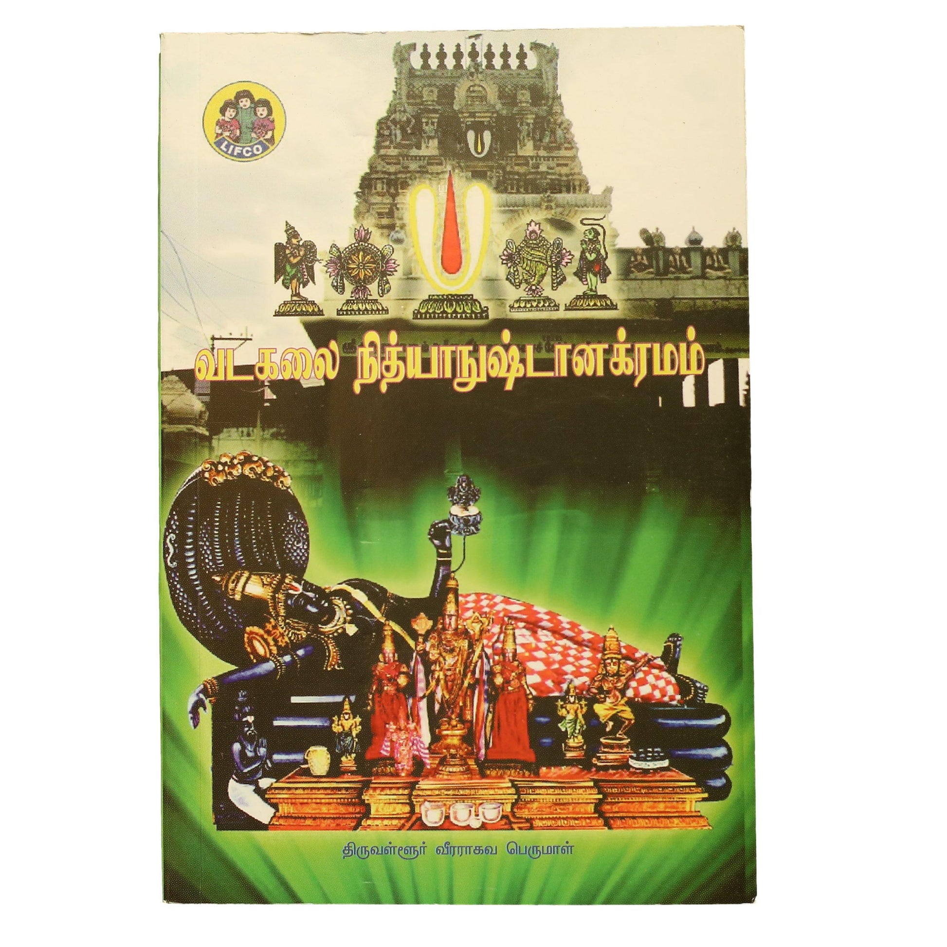 "Nityaanushtaanakramam Vadakalai" is a revered Tamil book providing a comprehensive guide to daily spiritual practices in the Vadakalai tradition of Sri Vaishnavism. This essential manual outlines step-by-step instructions, mantras, and rituals for performing Nityaanushtaana, including Sandhyavandanam, Pranayama, and meditation. It also delves into the philosophical and theological aspects of Vadakalai Sri Vaishnavism, offering insights into the tradition's principles and beliefs. "Nityaanushtaanakramam Vadakalai" serves as an invaluable resource for devotees seeking to deepen their spiritual journey, cultivate devotion, and lead a life in accordance with the rich heritage of Vadakalai Sri Vaishnavism.