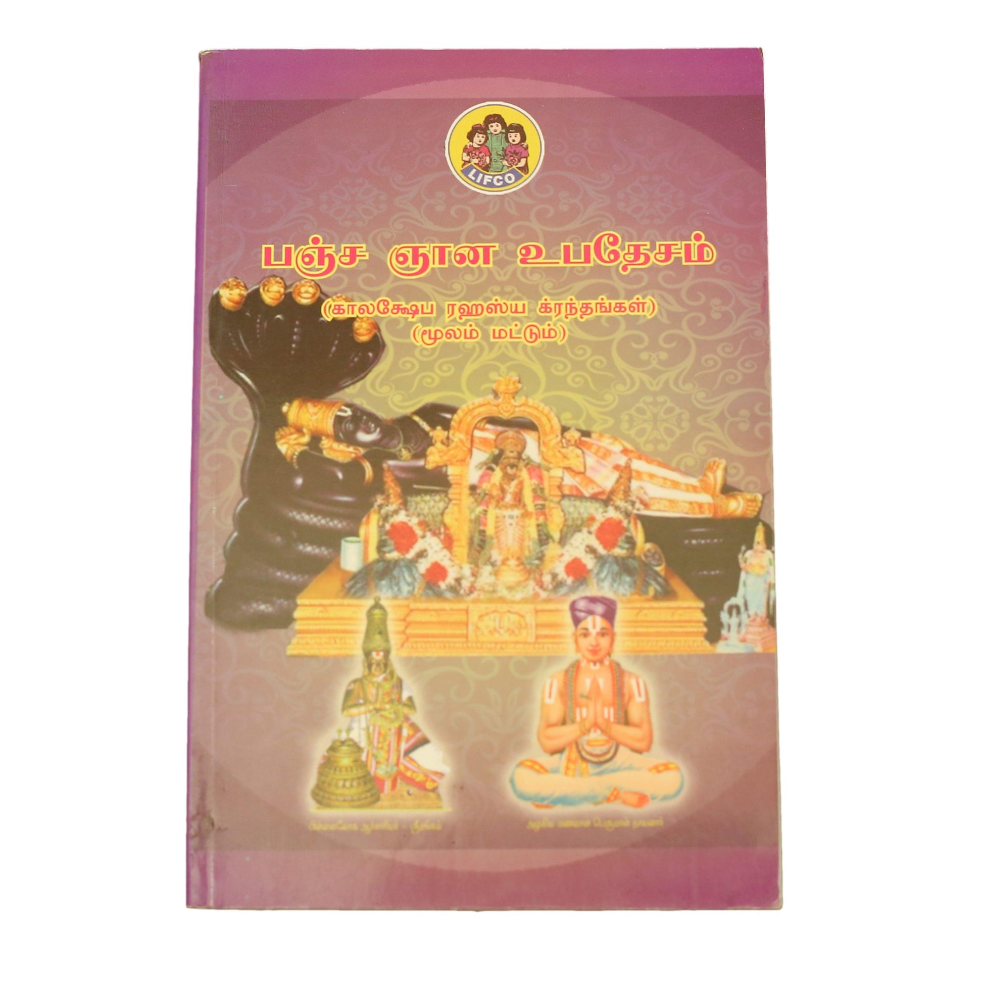 "Pancha Gnana Upadesam" is a revered Tamil book imparting timeless wisdom through five teachings: Jnana (knowledge), Bhakti (devotion), Karma (action), Raja (meditation), and Yoga (union). This comprehensive guide delves into spiritual practices, philosophical insights, and practical guidance for seekers on the path of self-realization and inner transformation. Through detailed explanations, stories, and teachings, the book illuminates the essence of each teaching, inspiring readers to cultivate wisdom, devotion, and spiritual discipline in their lives. "Pancha Gnana Upadesam" serves as a valuable resource for seekers of truth, offering a holistic approach to spiritual growth and enlightenment.