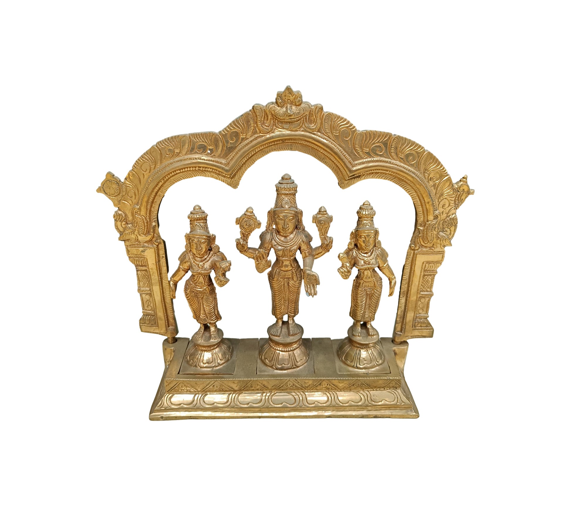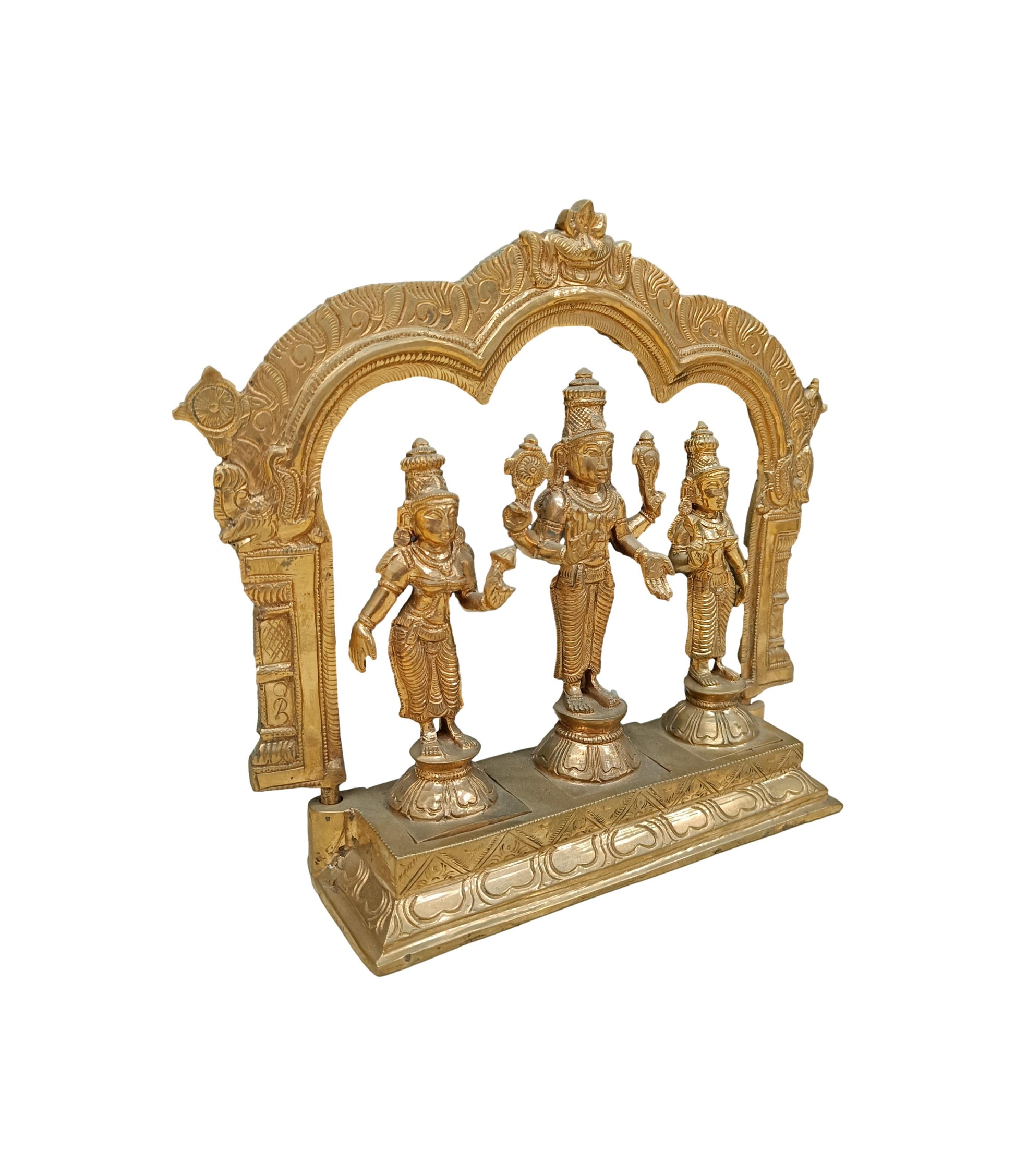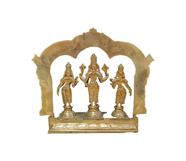 A Panchalogam Perumal with Sridevi and Bhudevi idol is a scared and intricately crafted representation of Lord Vishnu [Perumal] accompanied by his divine consorts, Goddess Sridevi [Lakshmi, symbolizing wealth and prosperity] and Goddess Bhudevi [representing the earth and abundance].These idols are ideal for pooja rooms, temples, or home decor, fostering peace, prosperity, and spiritual connection