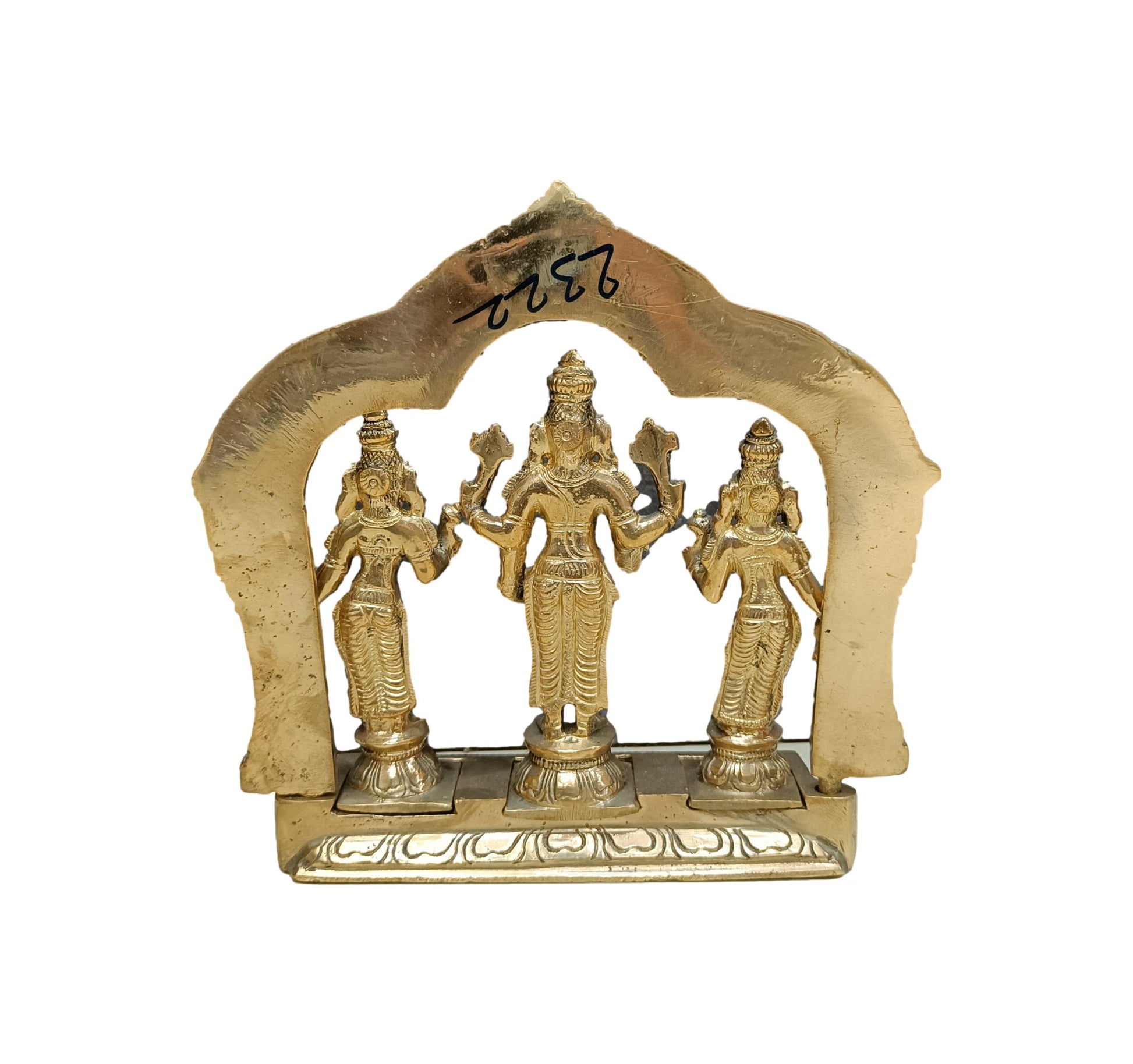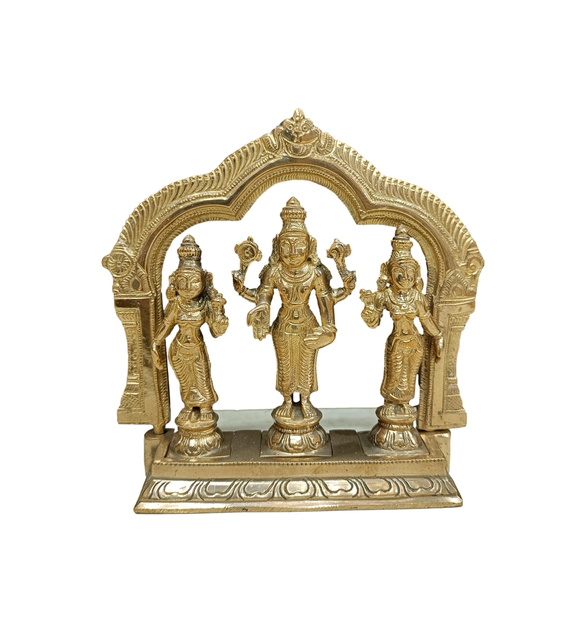 Bring divine blessings and timeless elegance into your home with this handcrafted Panchalogam idol set featuring Lord Srinivasa Perumal flanked by Goddess Sridevi and Bhudevi, complete with a beautifully detailed Prabhai (arch). Standing at 7 inches, this sacred trio is perfect for home altars, pooja rooms, or as a meaningful spiritual gift.