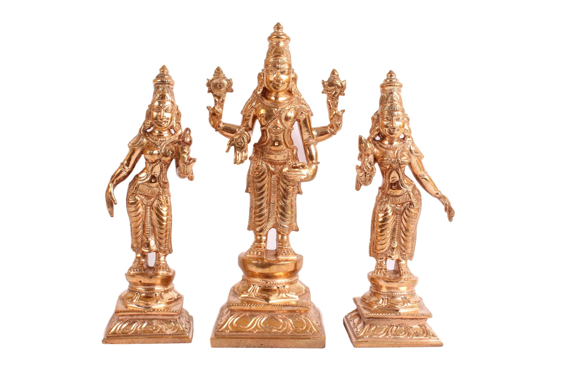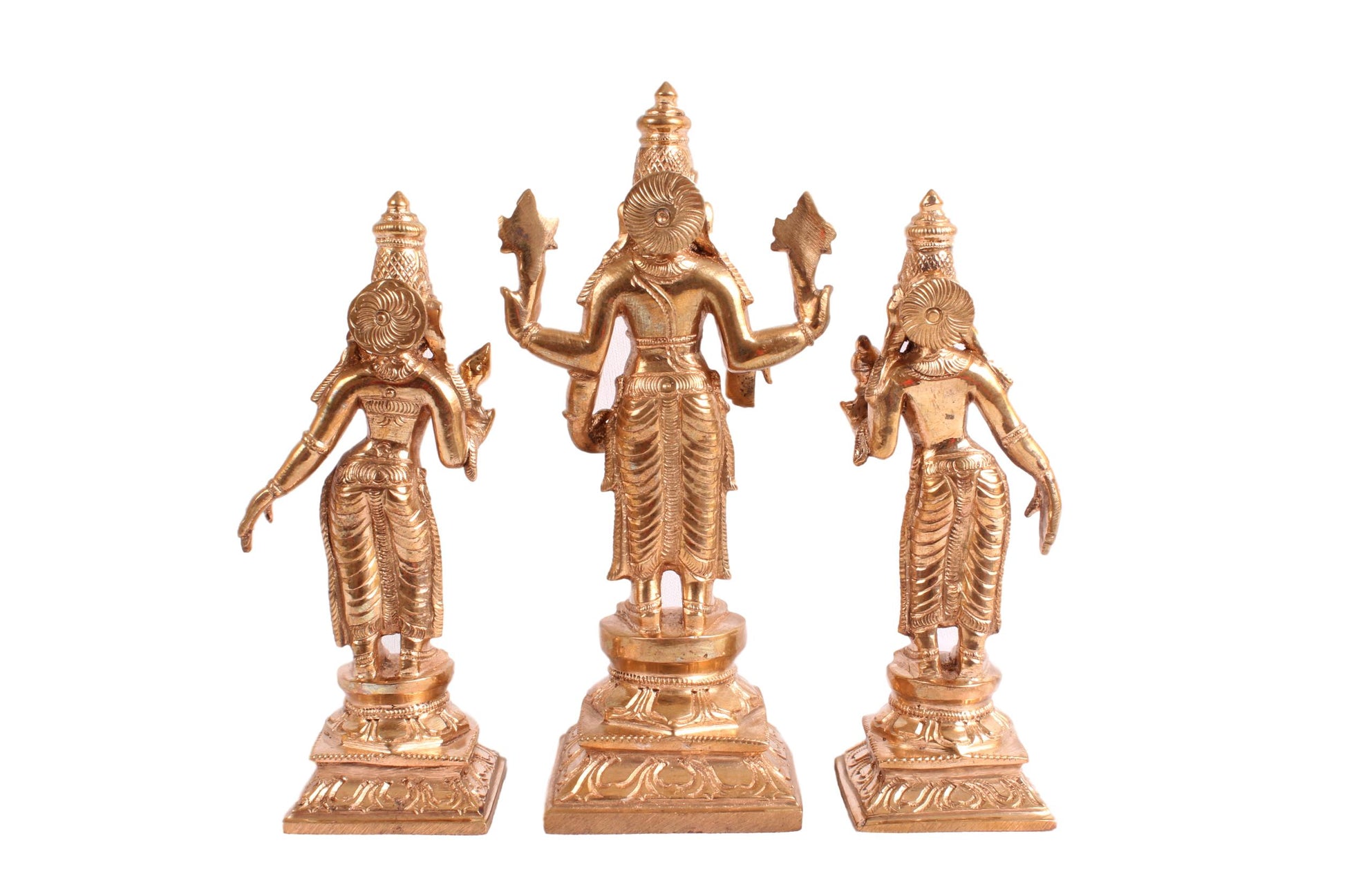 Experience divine grace with our exquisite Panchalogam idol of Srinivasa Perumal adorned with Sridevi and Bhoodevi. Crafted meticulously by skilled artisans, this idol radiates elegance and spirituality. The amalgamation of five metals—gold, silver, copper, zinc, and lead—imbues it with a unique aura, symbolizing the harmony of cosmic energies. Srinivasa Perumal, the embodiment of Lord Vishnu's mercy and protection, stands majestically alongside his divine consorts, Sridevi and Bhoodevi, representing wealth and earth. Whether as a centerpiece for worship or a cherished decor item, this idol encapsulates timeless devotion and celestial blessings, elevating your spiritual space with its divine presence.