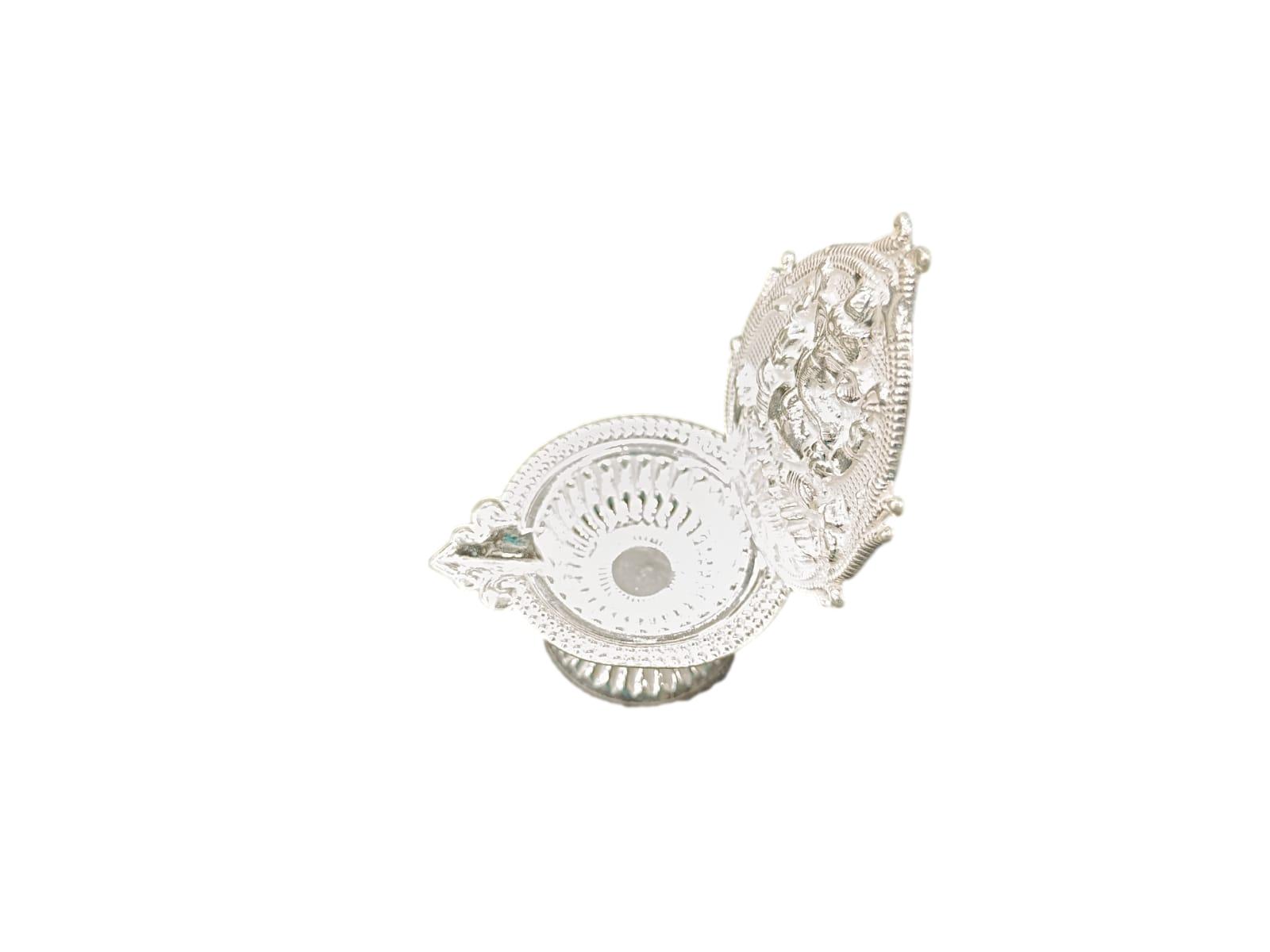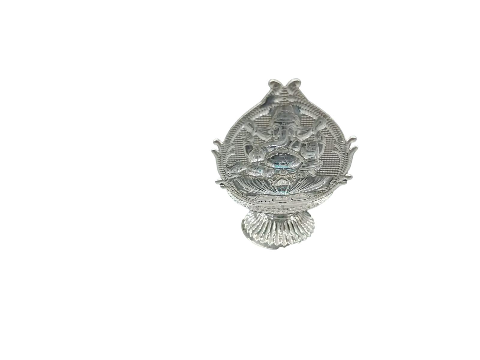 This sacred Ganesh Deepam, crafted in pure silver, features the beloved Lord Ganesha seated gracefully above the deepam bowl, symbolizing wisdom, auspicious beginnings, and the removal of obstacles. A perfect addition to your puja rituals, this lamp combines divine presence with elegant design.