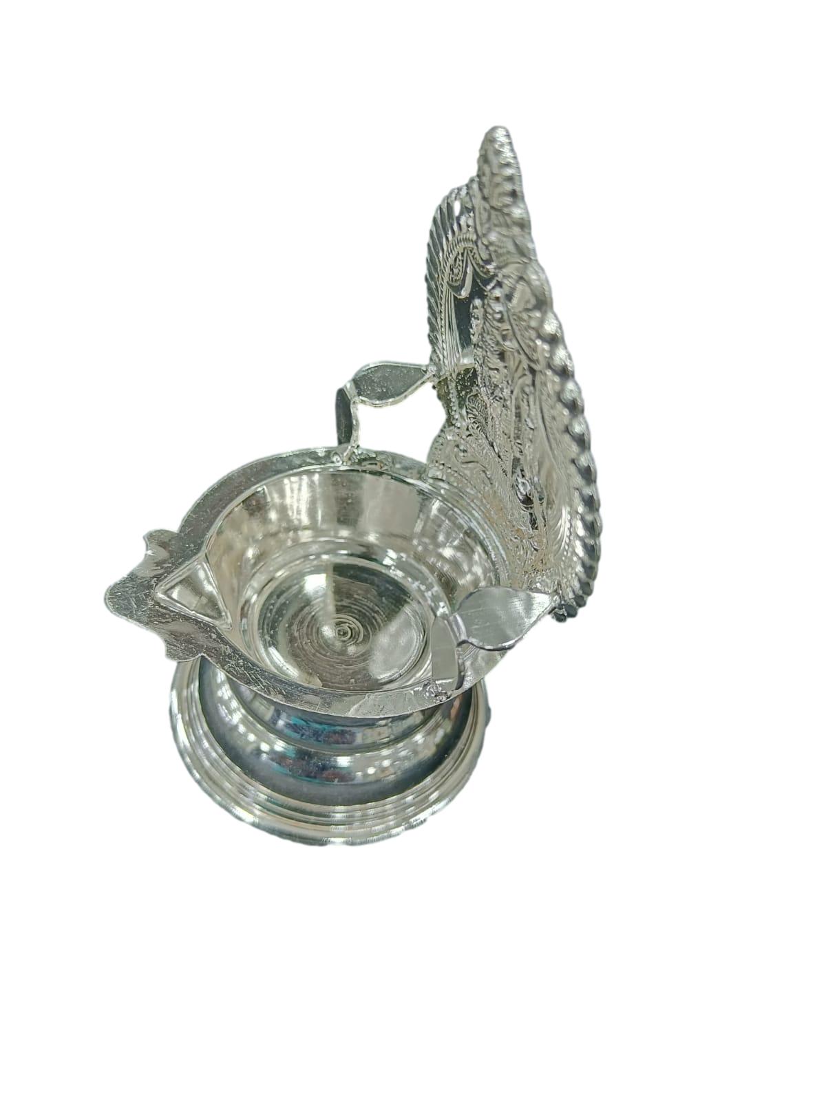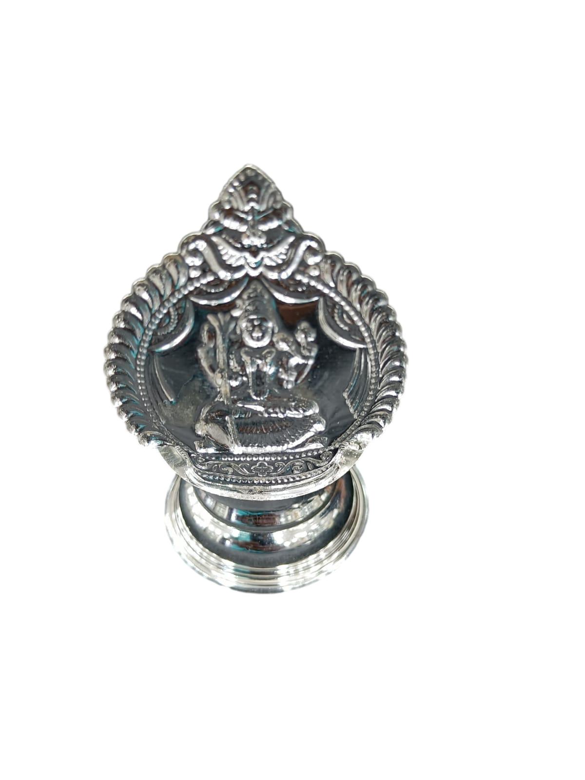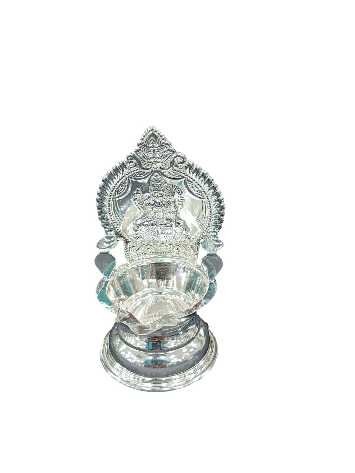 This exquisite Kamakshi Deepam, handcrafted in pure silver, features Goddess Kamakshi seated in a serene and blessing posture, framed by a beautifully detailed arch.The lamp combines spiritual significance with traditional South Indian temple aesthetics, making it a treasured piece for daily worship and festive rituals.