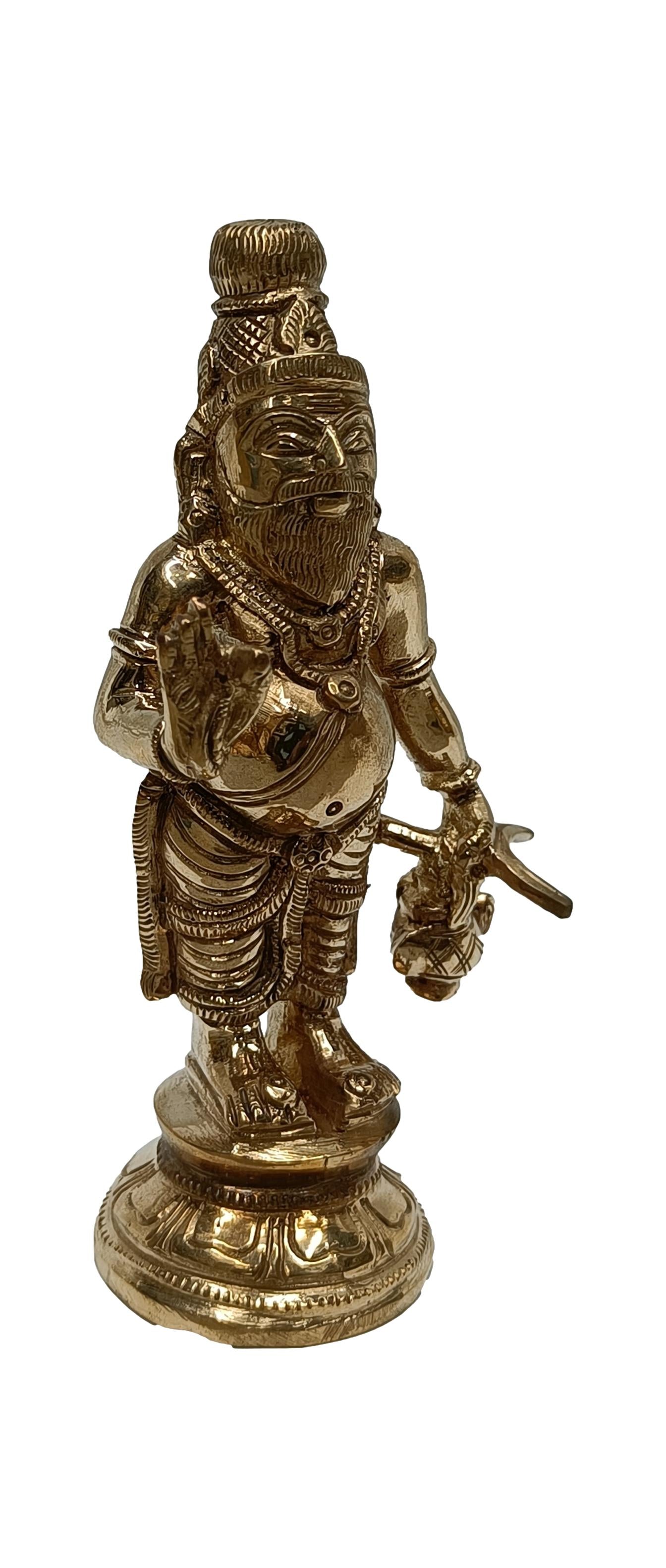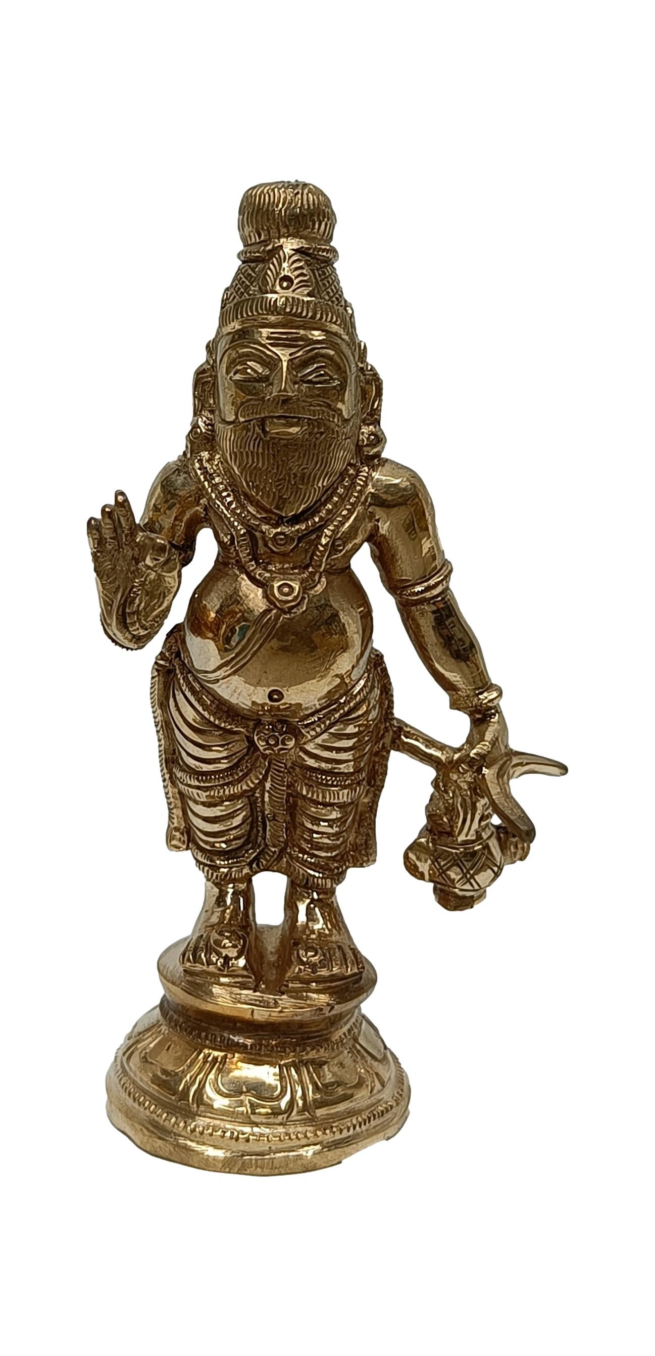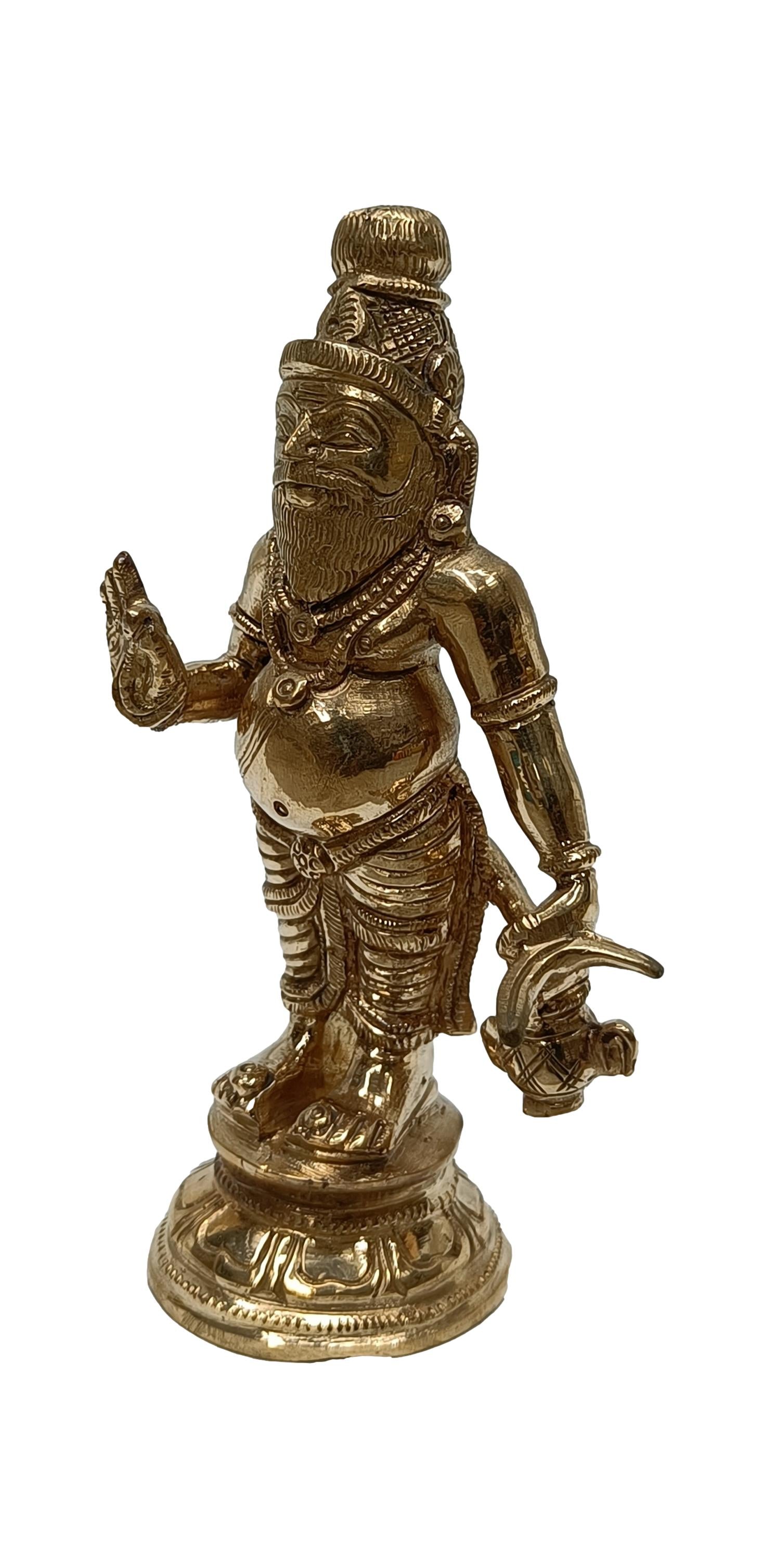 Celebrate the wisdom and divinity of Sage Agastya with this exquisitely crafted Panchaloha idol. Known as a revered sage in Indian mythology, Rishi Agastya symbolizes knowledge, discipline, and devotion. Made from a traditional alloy of five metals (Panchaloha), this idol embodies spiritual energy and durability, making it ideal for your pooja room or as a thoughtful gift. The intricate detailing of the idol reflects the sage's serene expression and his connection to divine wisdom. A timeless piece, it serves as a reminder of the rich cultural heritage and the path of enlightenment. Bring home blessings and inspiration today!