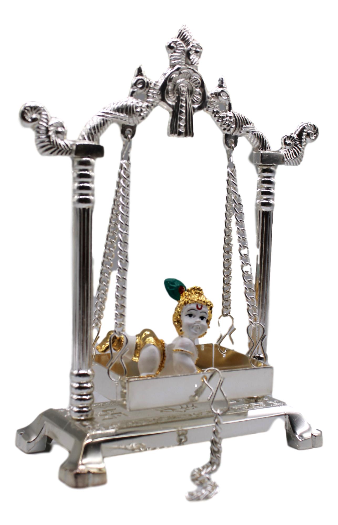 Experience divine bliss with our Silver Swing Jhula featuring Lord Krishna. Crafted meticulously, this jhula captures the essence of serenity and devotion. Adorned in silver color, it radiates elegance and charm, perfect for enhancing your sacred space. Let Krishna's divine presence infuse your home with peace and positivity as you adorn it with this exquisite swing. Immerse yourself in spiritual tranquility with every sway of this beautifully crafted Silver Swing Jhula.