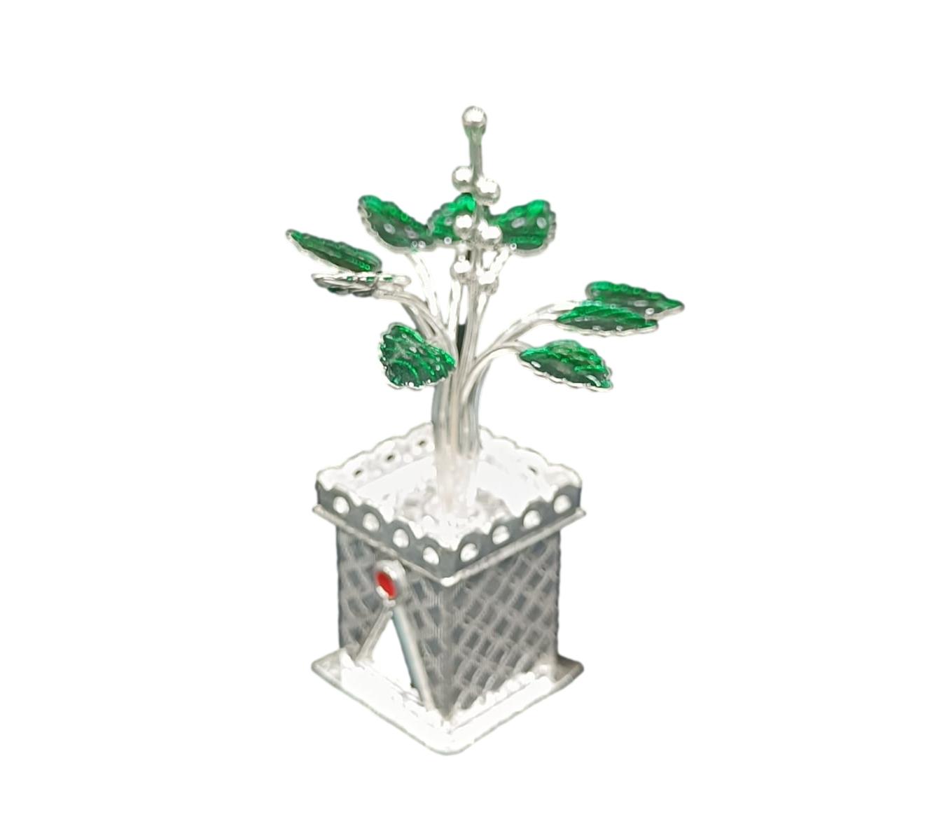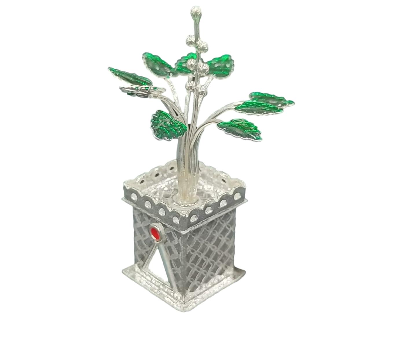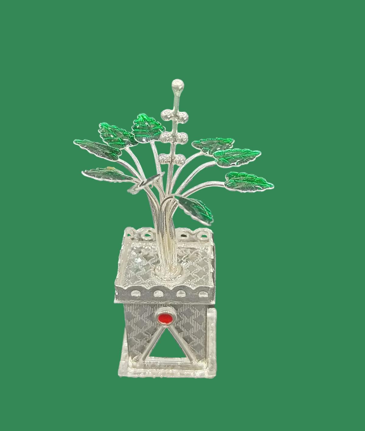 This beautifully crafted Tulasi Madam is made from pure silver, designed in a miniature temple-style Vrindavan form. With its elegant detailing and traditional significance, it serves as a sacred representation of Goddess Tulasi, ideal for your daily puja rituals.