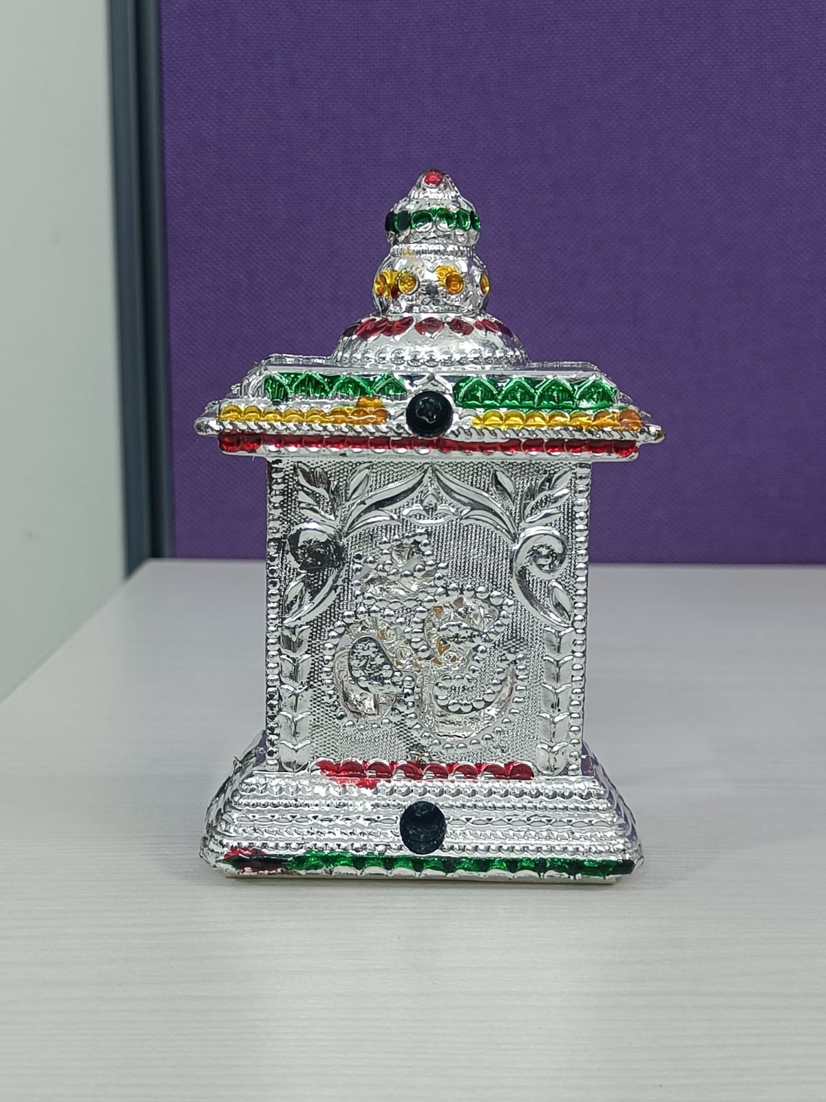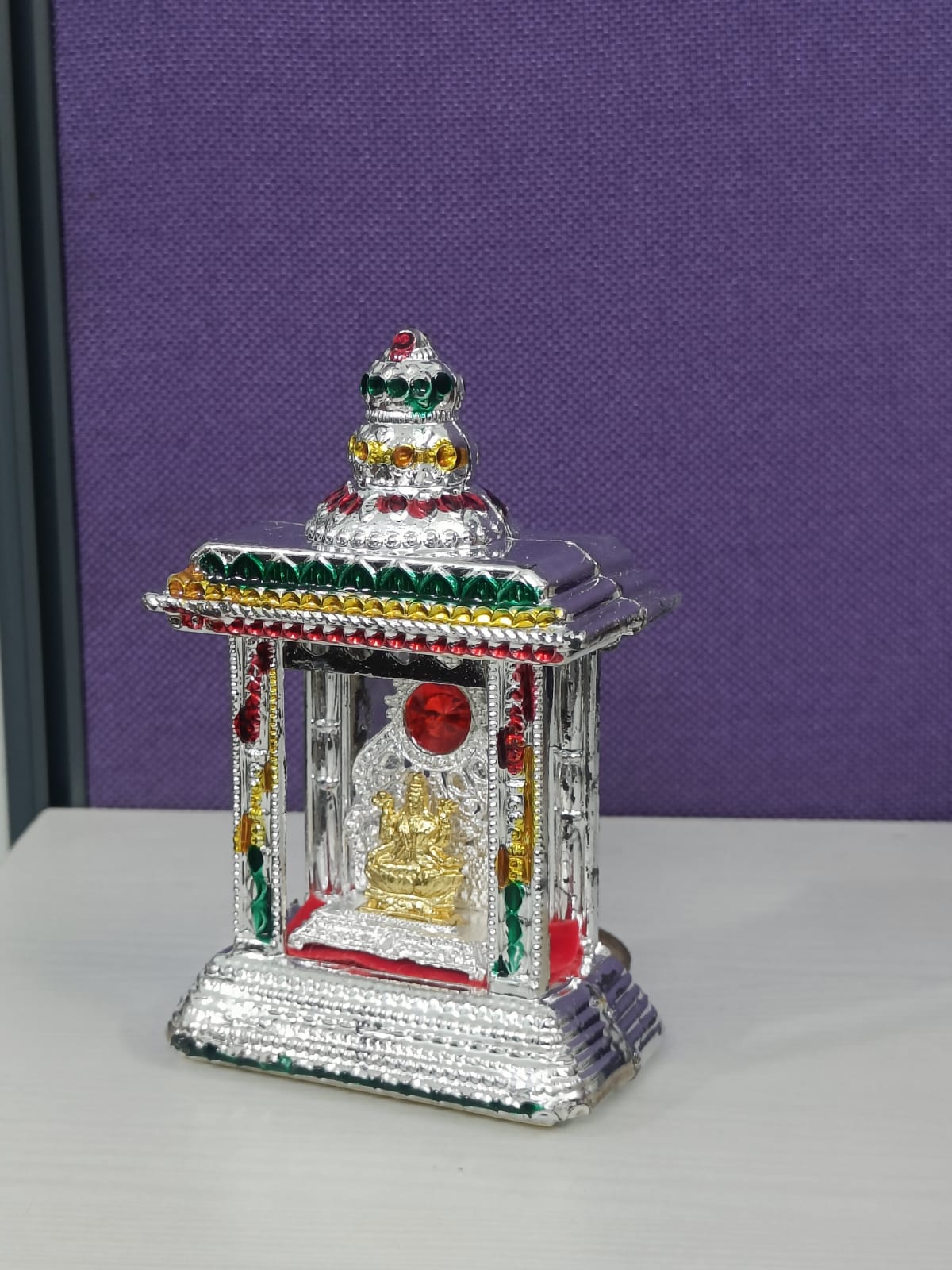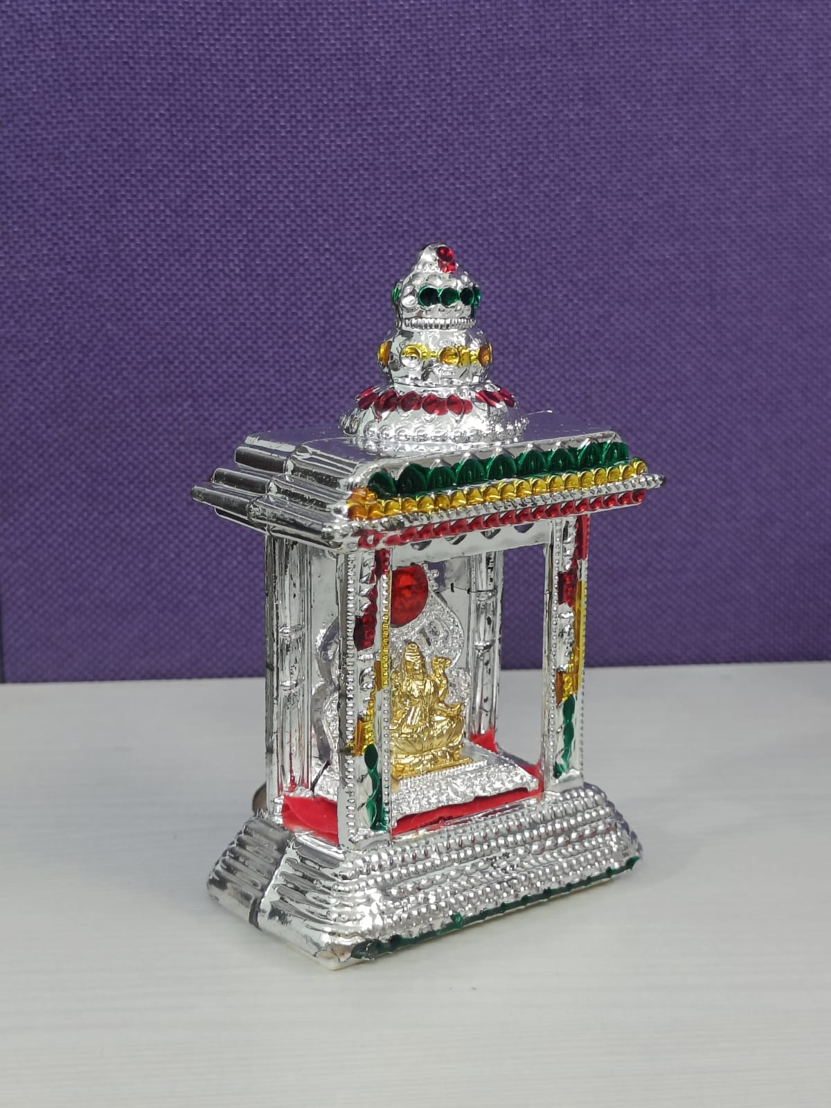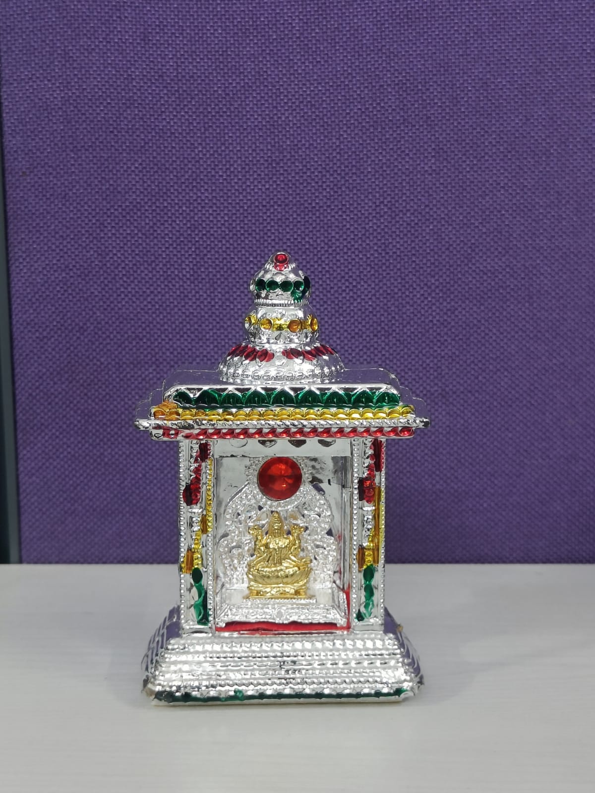 Elegant small temple featuring Goddess Mahalakshmi, designed for home altars, gifting, or placement on a car dashboard. Brings blessings of wealth, prosperity, and protection wherever placed. Lightweight and durable, perfect for daily worship or as a thoughtful spiritual gift.