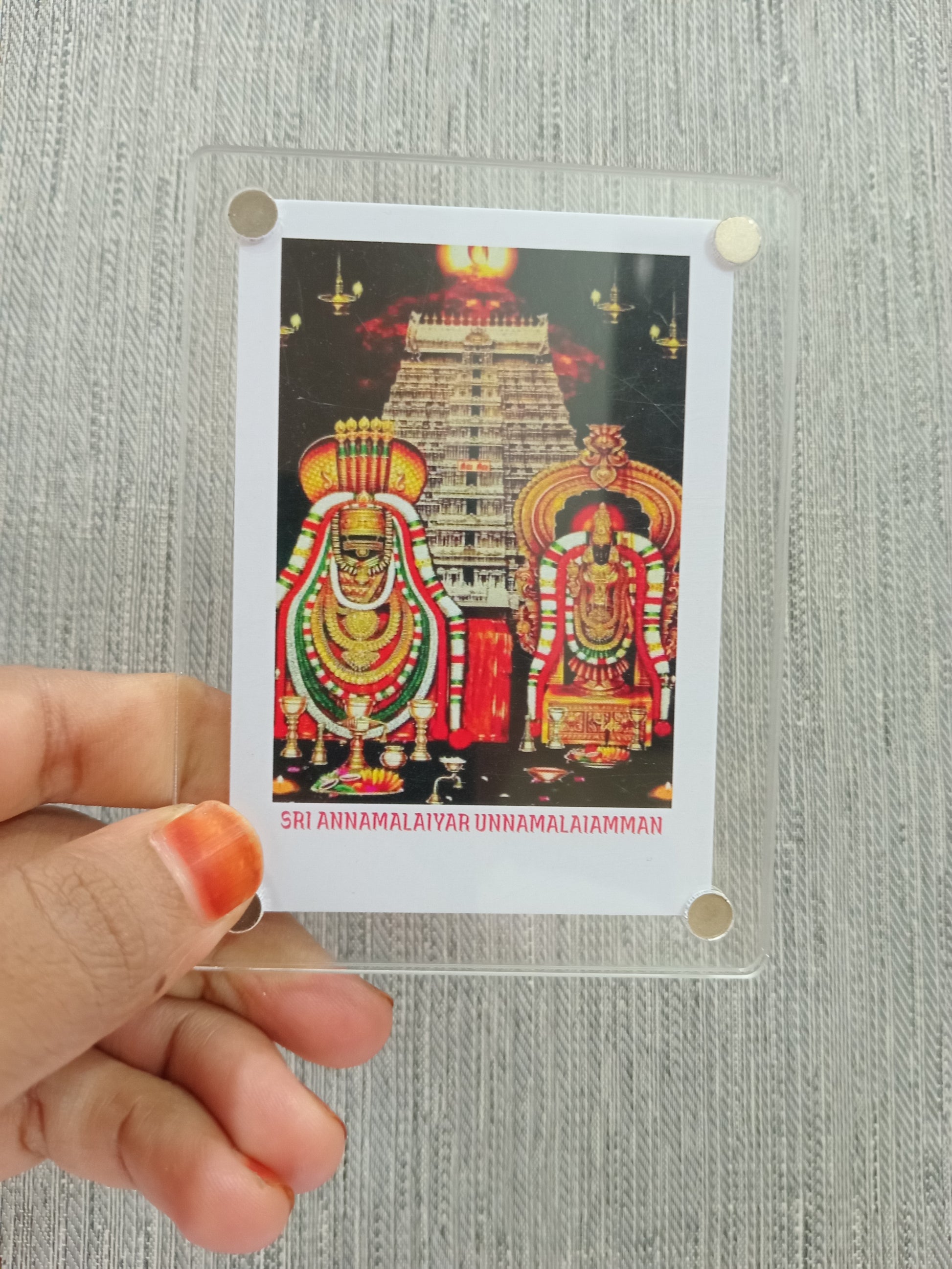 The Annamalaiyar Polaroid fridge magnet is a charming and unique keepsake that combines spiritual significance with nostalgic style. It is a suitable gift for occasions like weddings, festivals, or spiritual events. This magnet serves a both a spiritual keepsake and a decorative piece, bringing blessings and elegance to your home. Easy to install and built to last, it's a stylish at to express your devotion and personality.