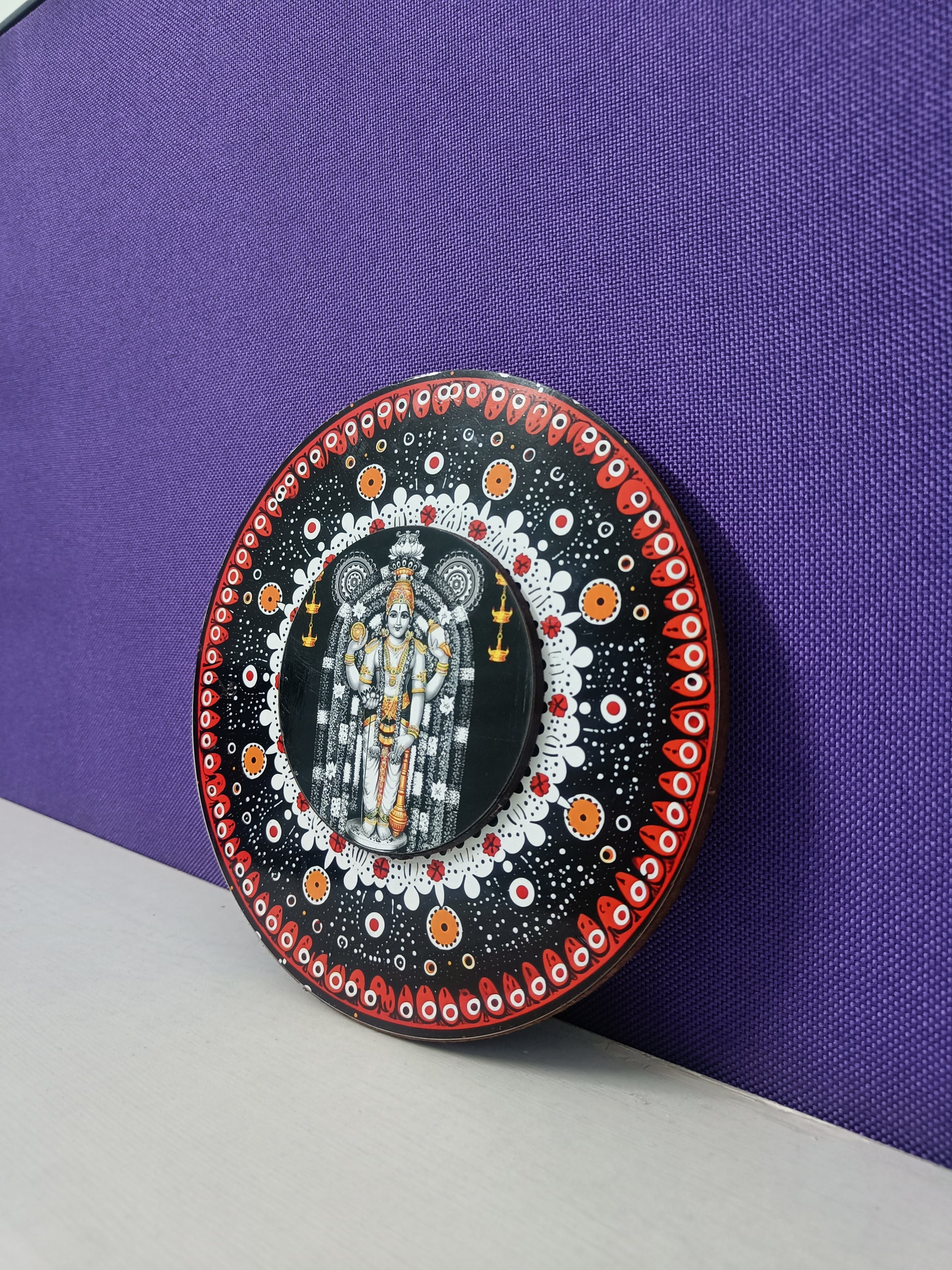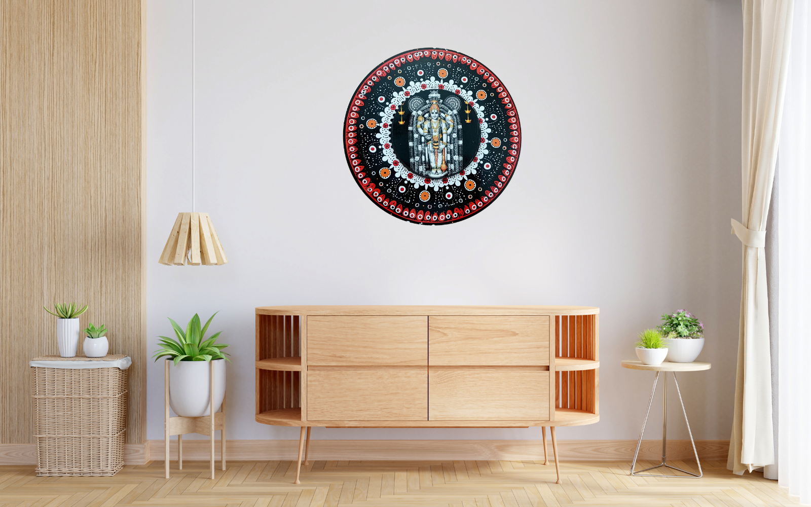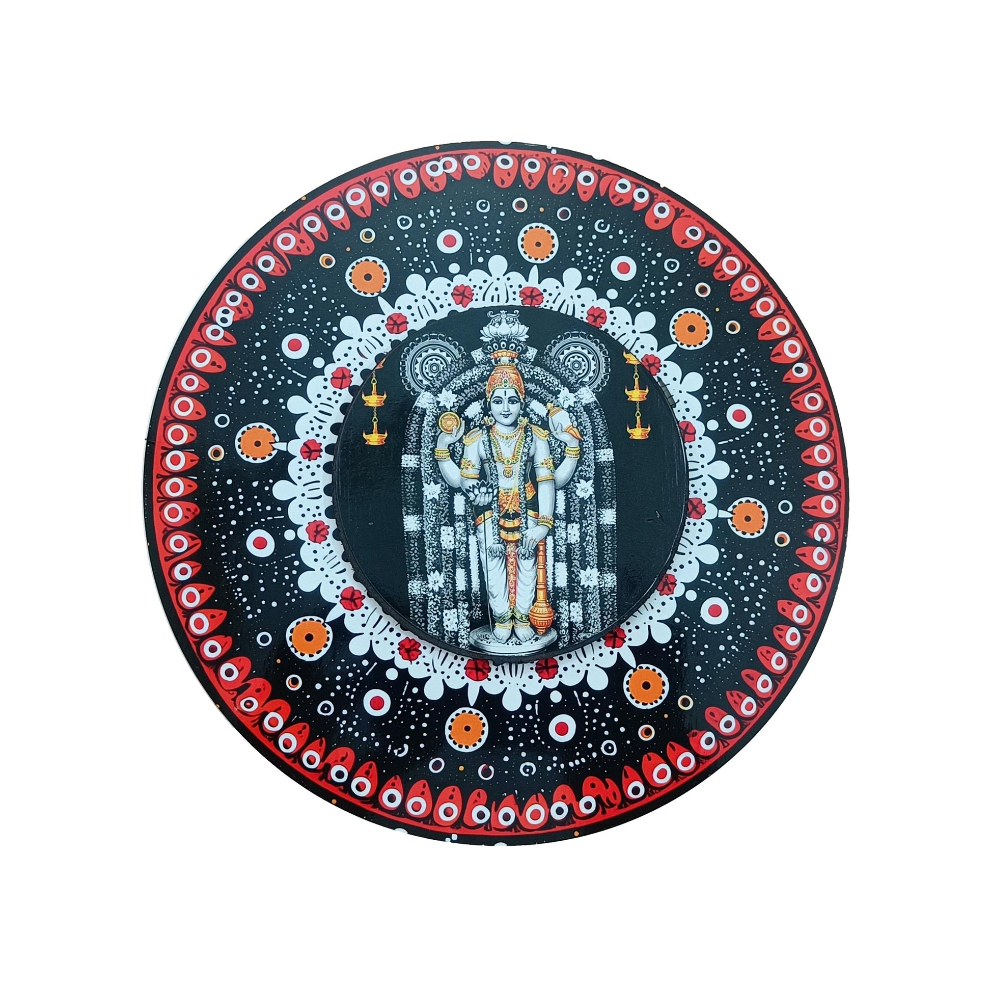 This beautifully crafted wooden wall hanging features Sri Guruvayurappan, the revered form of Lord Krishna, in a divine and majestic posture. Designed in a round shape, the artwork is enhanced with an attractive and vibrant background, bringing out the spiritual essence and visual appeal of the piece.