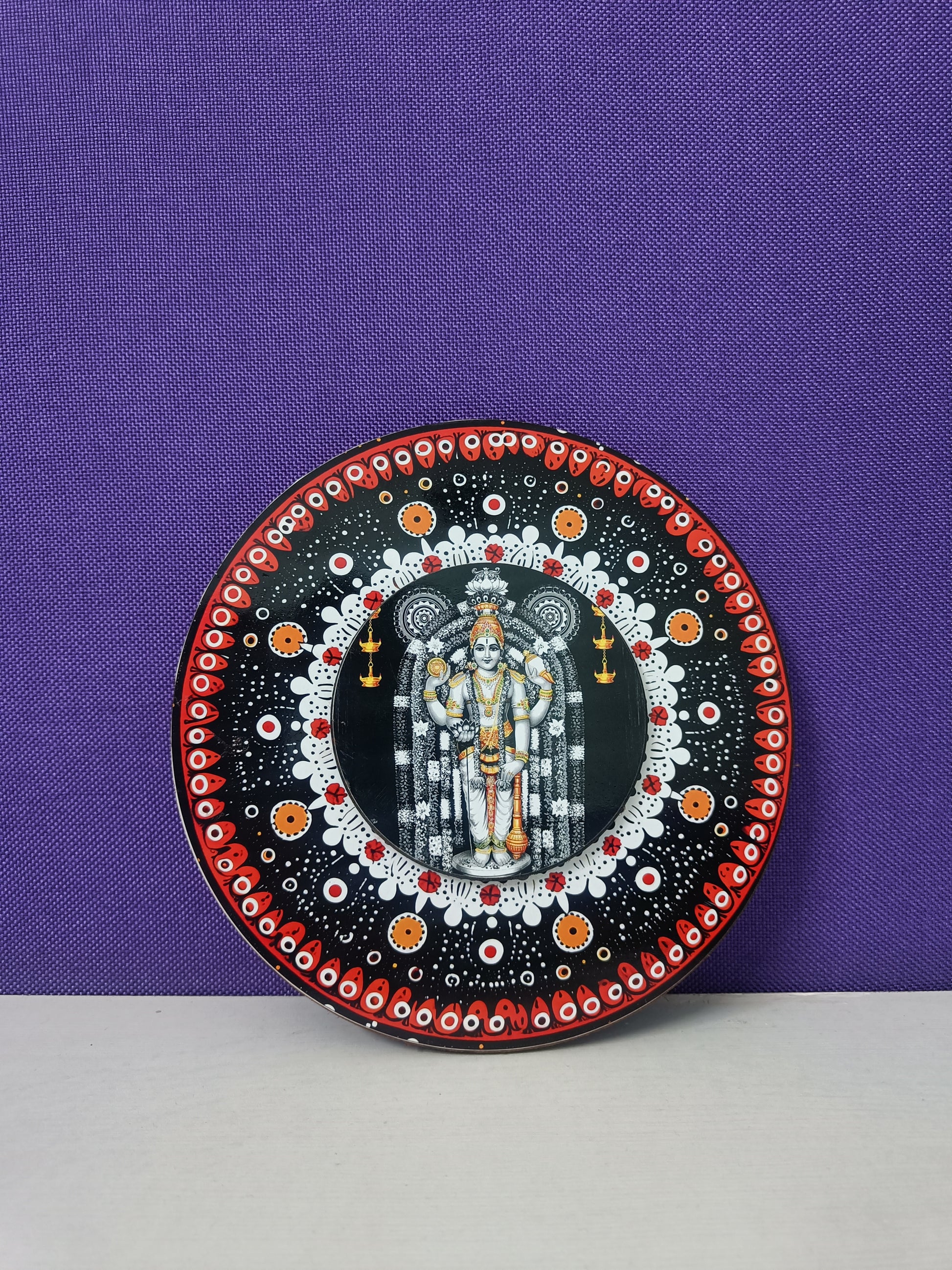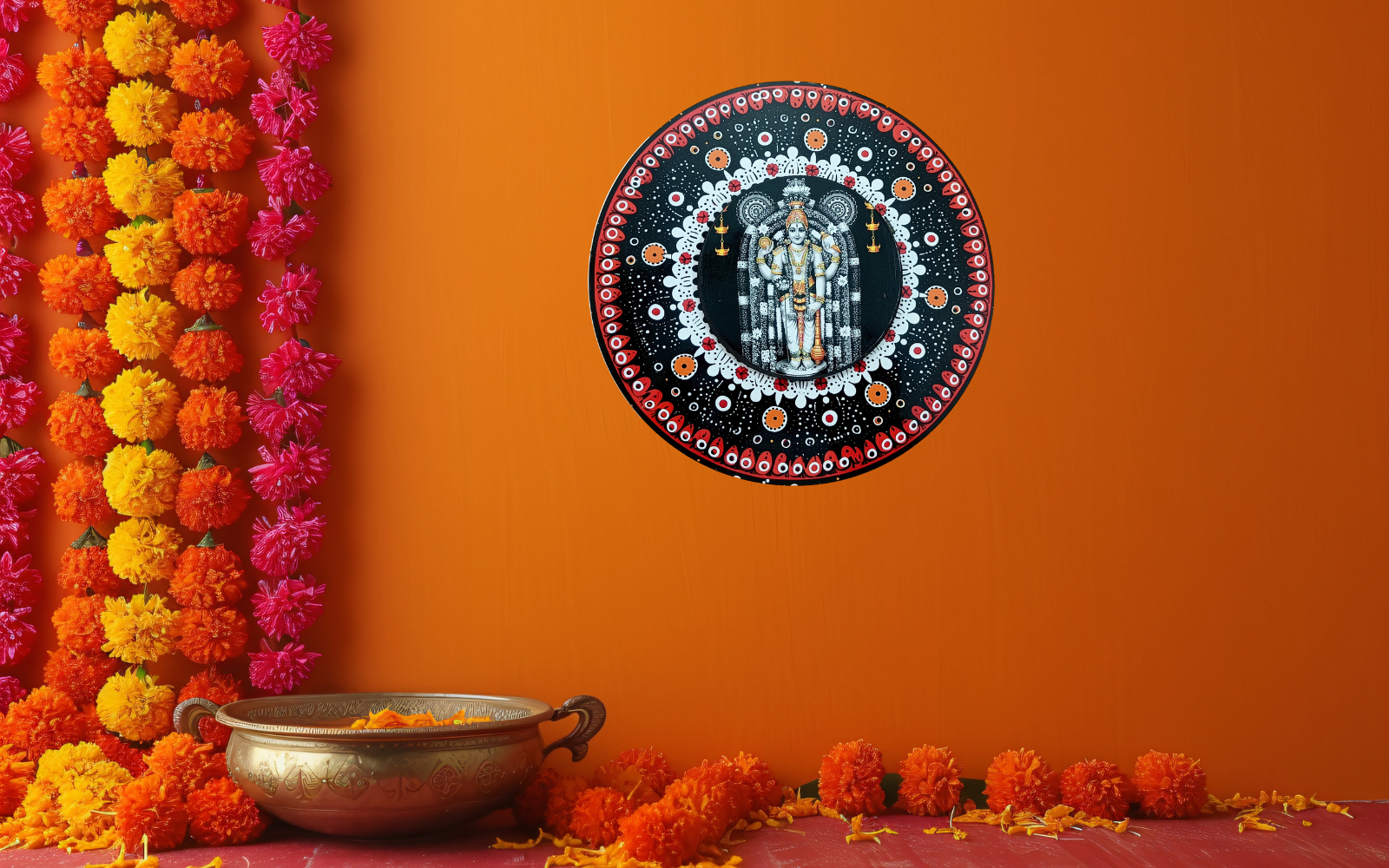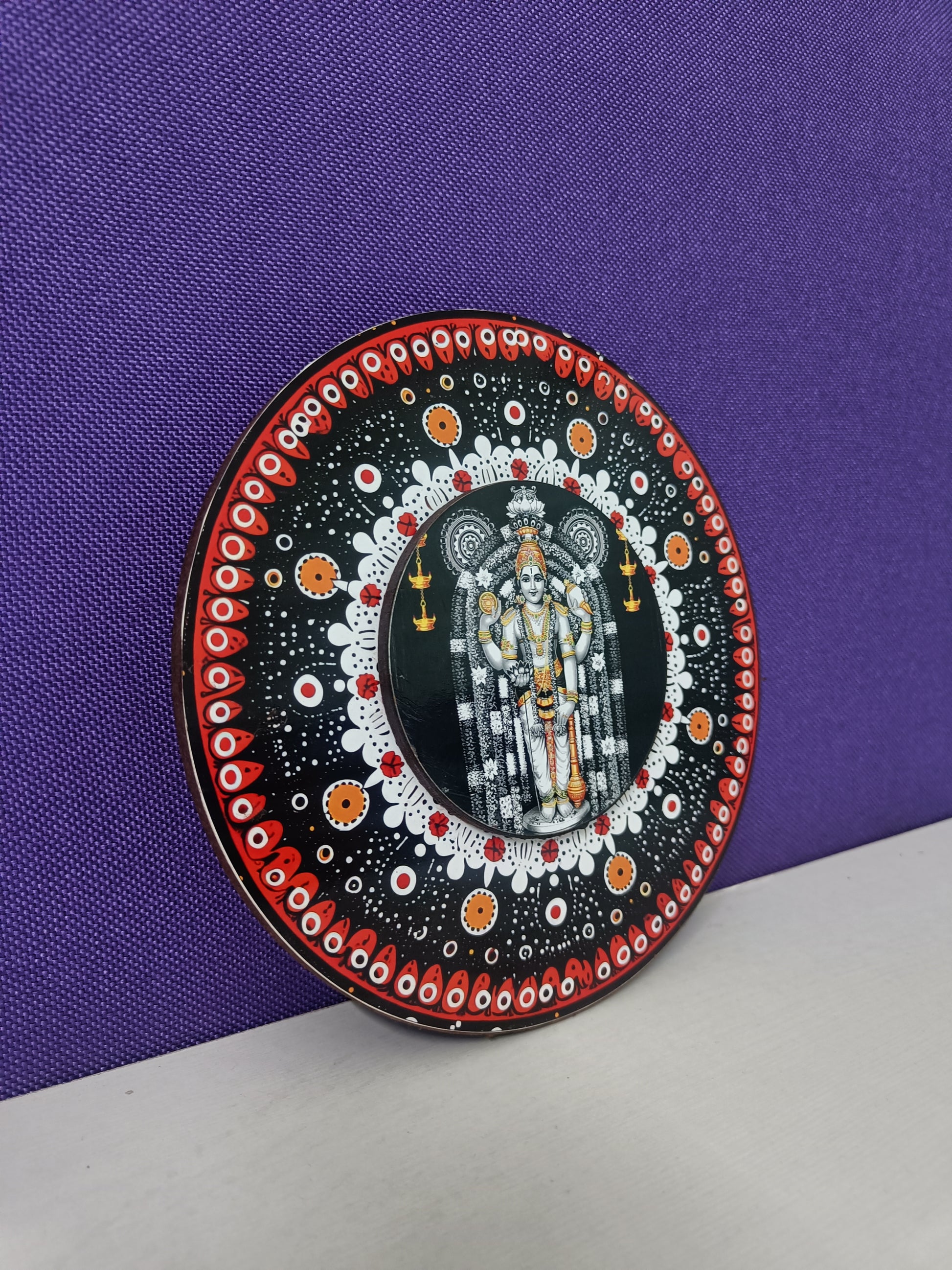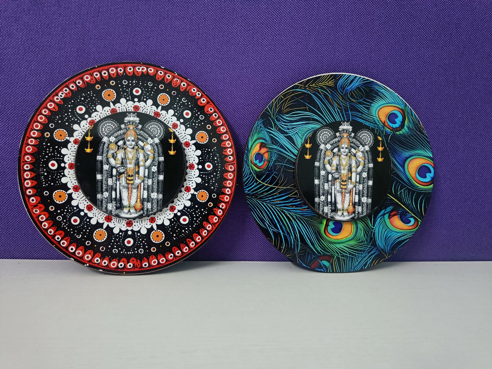 This beautifully crafted wooden wall hanging features Sri Guruvayurappan, the revered form of Lord Krishna, in a divine and majestic posture. Designed in a round shape, the artwork is enhanced with an attractive and vibrant background, bringing out the spiritual essence and visual appeal of the piece.