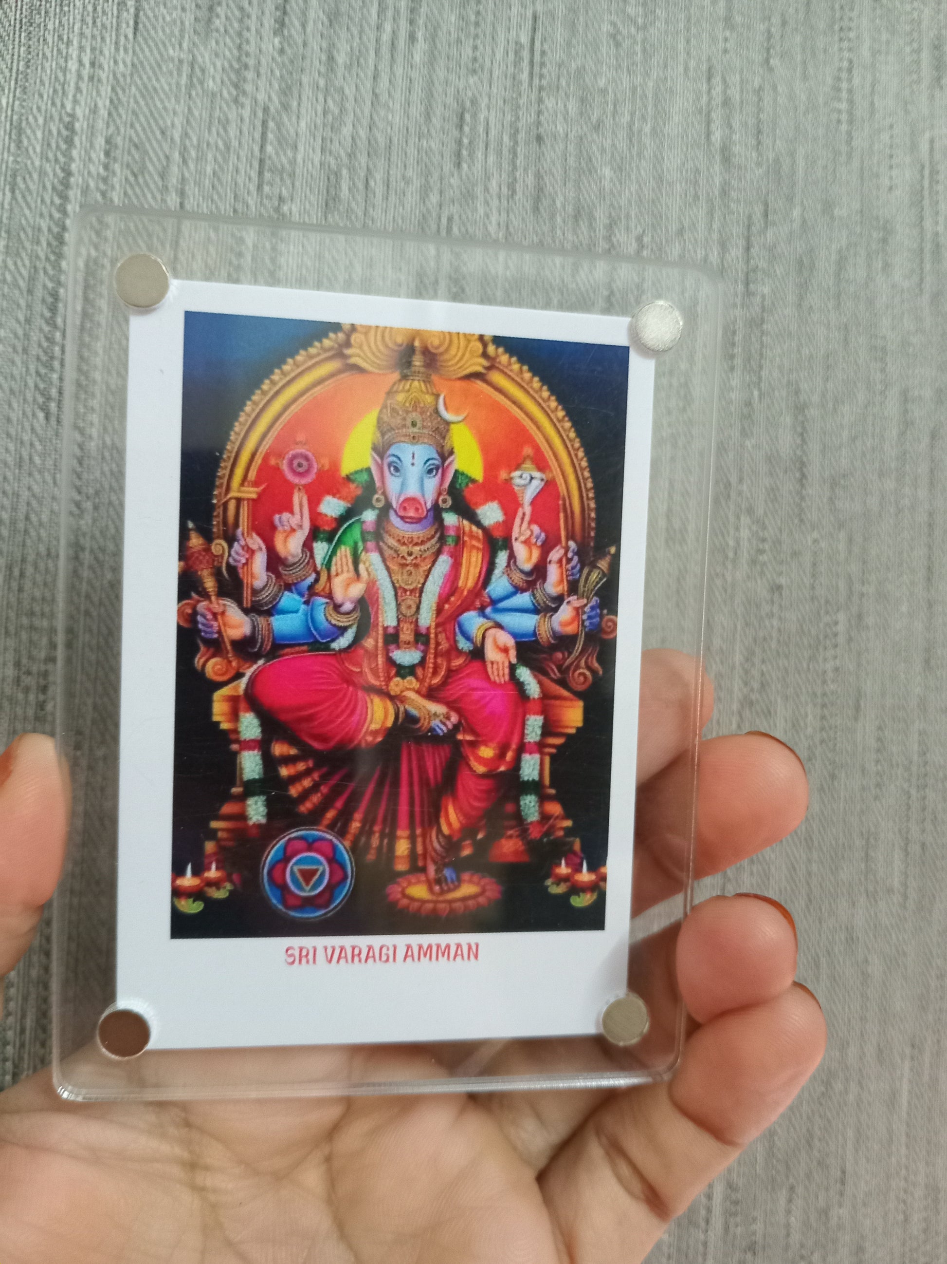 Sri Samayapuram Mariamman Polaroid fridge magnet is a charming and unique keepsake that combines spiritual significance with nostalgic style. It is a suitable gift for occasions like weddings, festivals, or spiritual events. This magnet serves a both a spiritual keepsake and a decorative piece, bringing blessings and elegance to your home. Easy to install and built to last, it's a stylish at to express your devotion and personality.