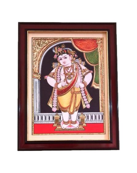 Crafted with precision and care, the frame exudes elegance, complementing any decor with its timeless appeal. Whether placed in your home or gifted to a loved one, it invokes a sense of serenity and blessings associated with Lord Krishna. Bring the divine presence of Sri Krishna into your life with this exquisite Tanjore style photo frame, a treasure to cherish for generations.