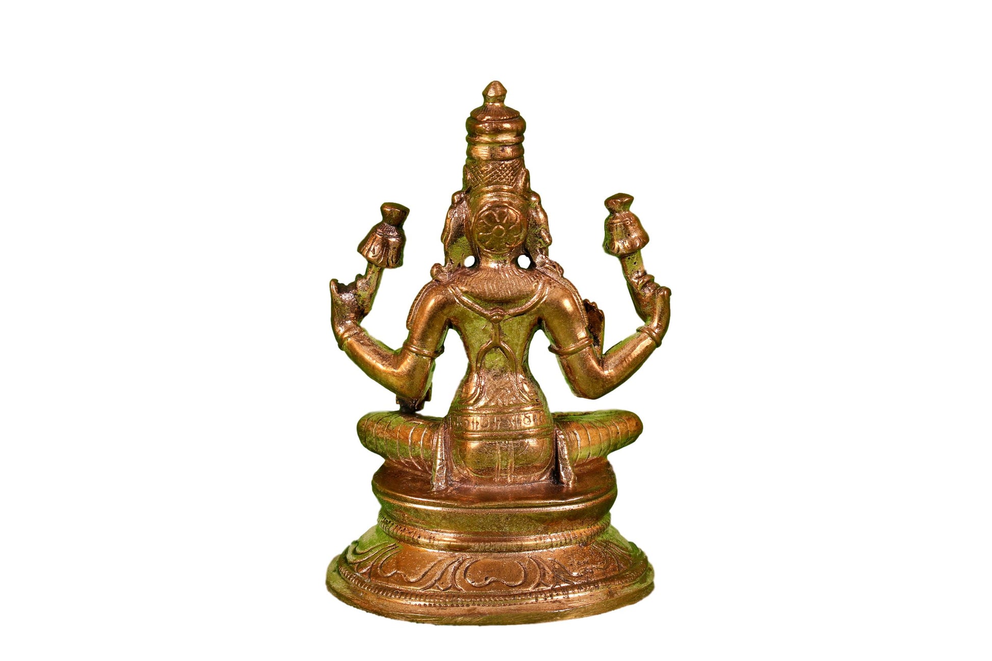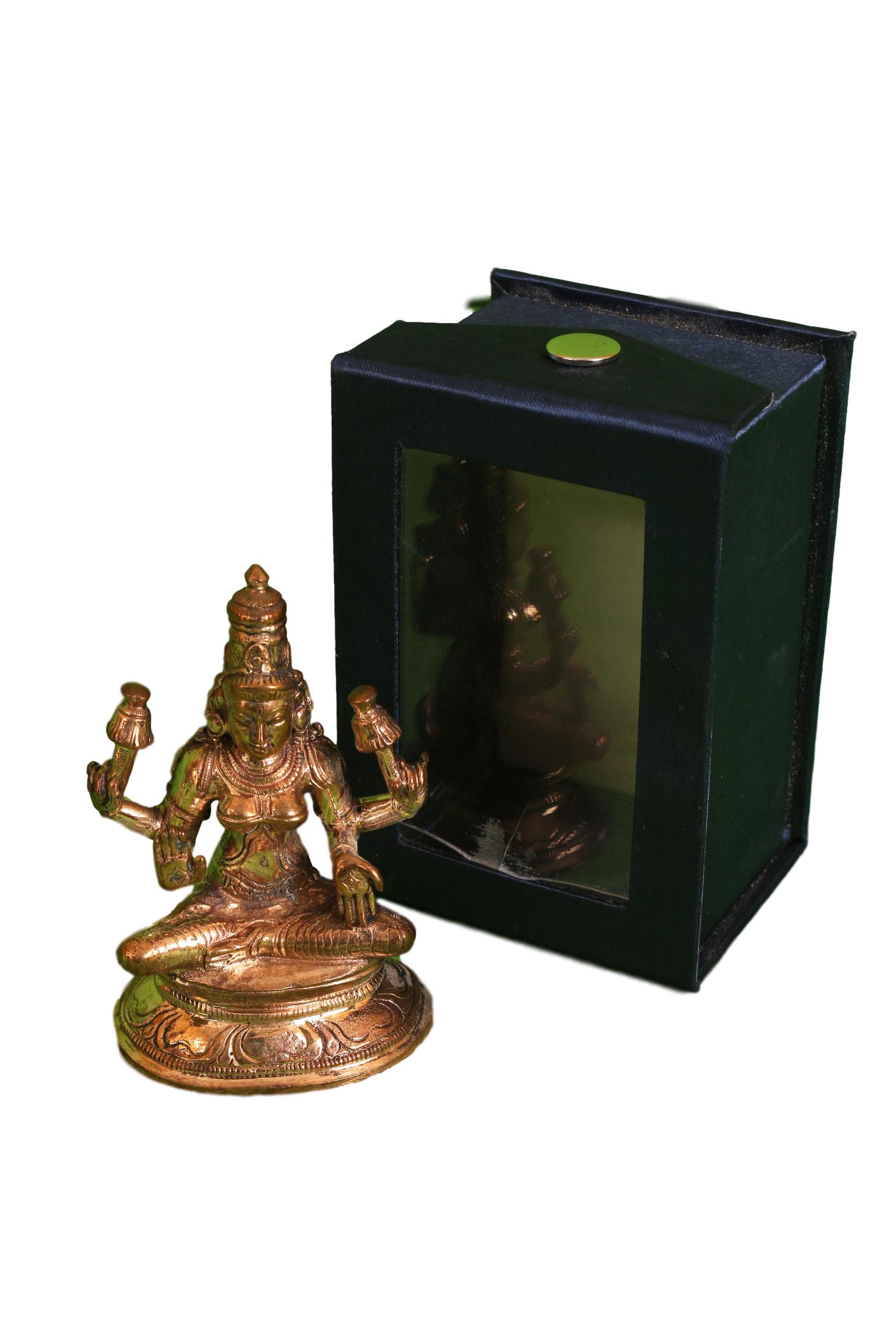 The Sri Lakshmi Panchalogam idol exudes divine grace and traditional craftsmanship. Crafted from a sacred alloy of five metals (panchaloham), it symbolizes prosperity and spiritual abundance. The idol showcases Goddess Lakshmi in a serene posture, adorned with intricate jewelry and finely detailed features that capture her benevolence. Standing elegantly on a pedestal, this idol is perfect for home or altar decor, invoking blessings of wealth, fortune, and harmony. Its exquisite design and symbolic significance make it a cherished addition to any spiritual collection, offering a timeless connection to the divine presence of Goddess Lakshmi.