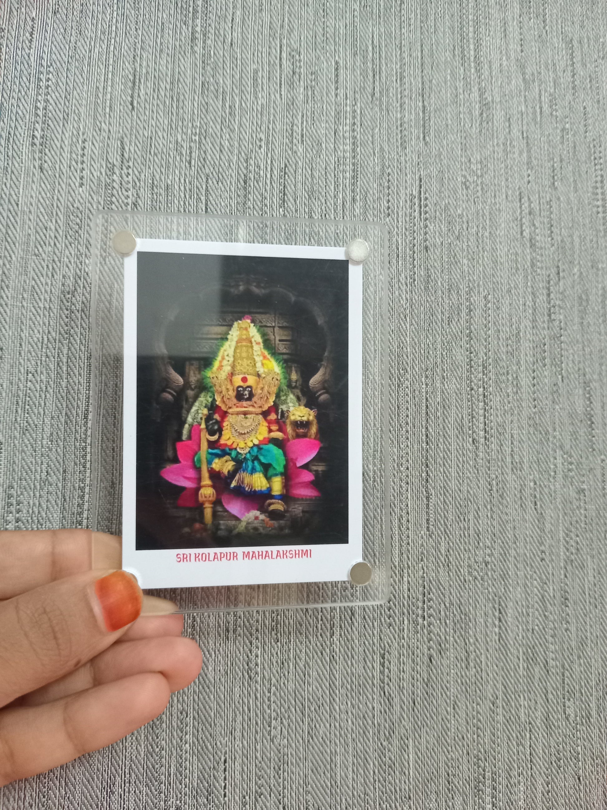 Mahalakshmi Polaroid fridge magnet is a unique and spiritually inspired decorative item designed to bring a touch of divinity and elegance to your home. Crafted with high-quality materials, this magnet features an artistic depiction of Goddess Mahalakshmi, the Hindu deity associated with wealth. prosperity, and spiritual abundance. Easy to install and built to last, it's a stylish at to express your devotion and personality.