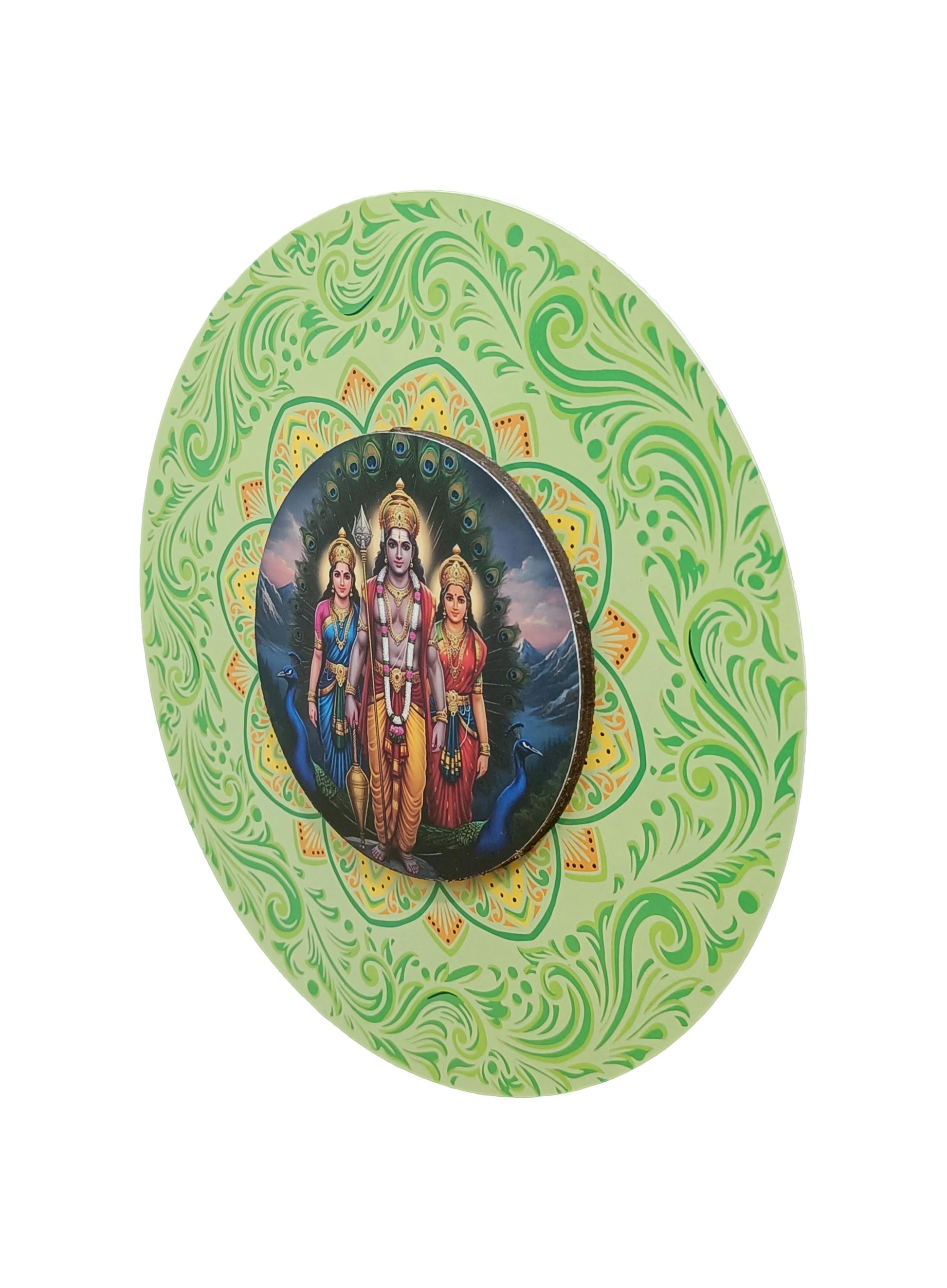 This elegant wooden wall hanging features Lord Murugan with his consorts Valli and Deivanai, artistically crafted in a round-shaped design. Made from quality wood, the artwork beautifully captures the divine trio in a serene and graceful posture, symbolizing love, wisdom, and valor.